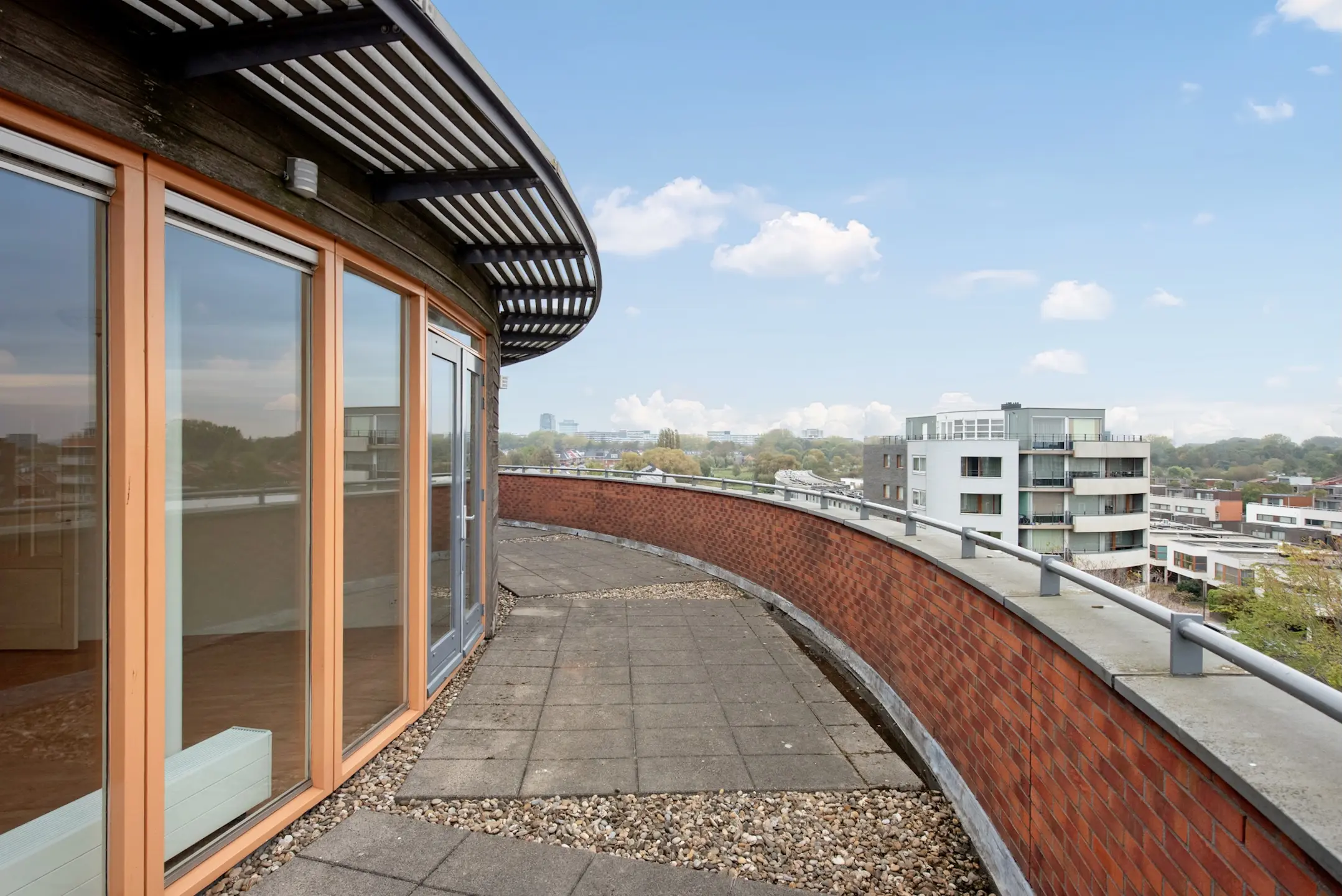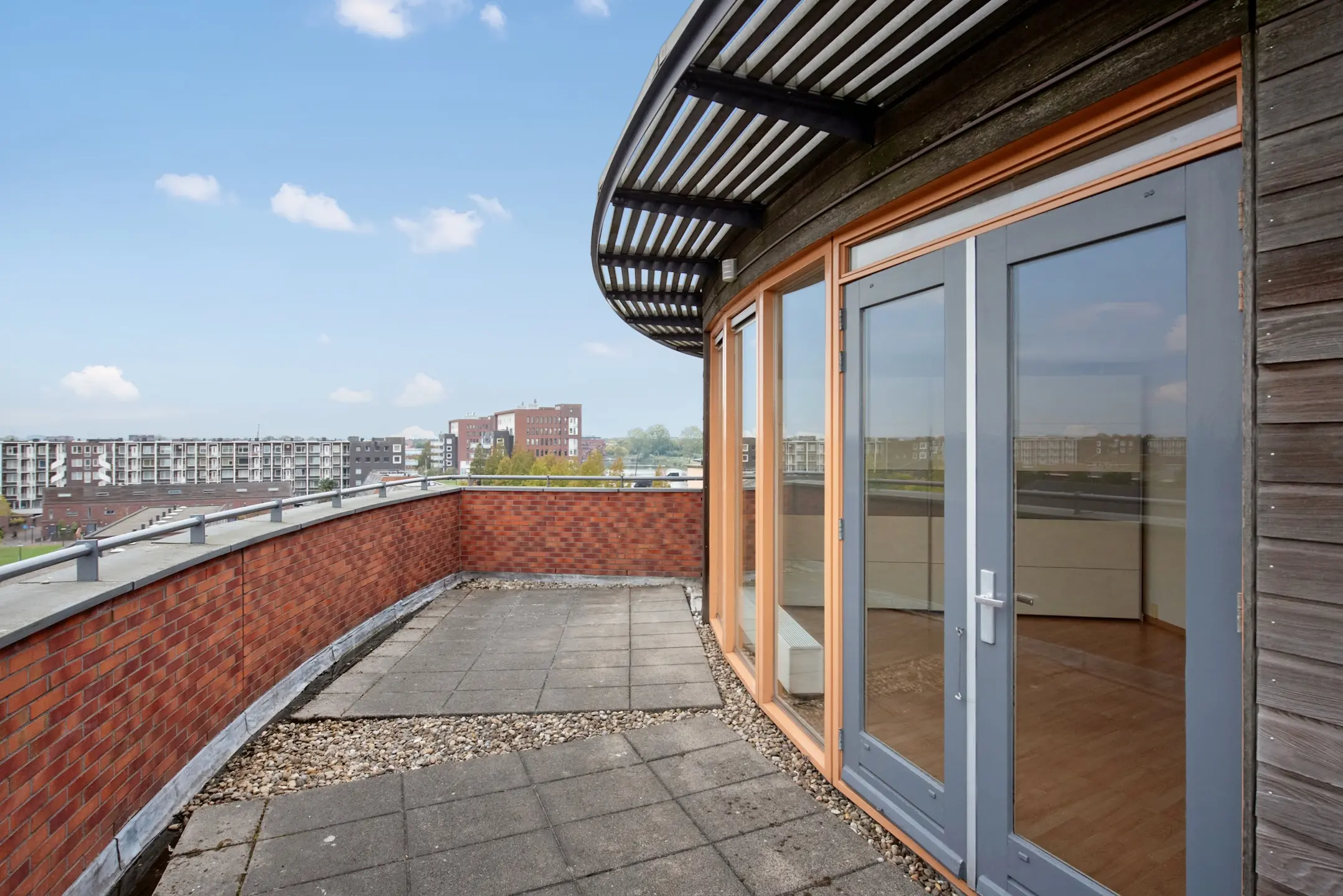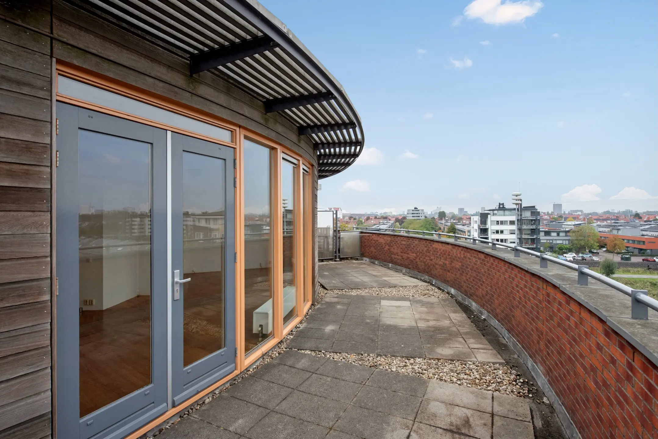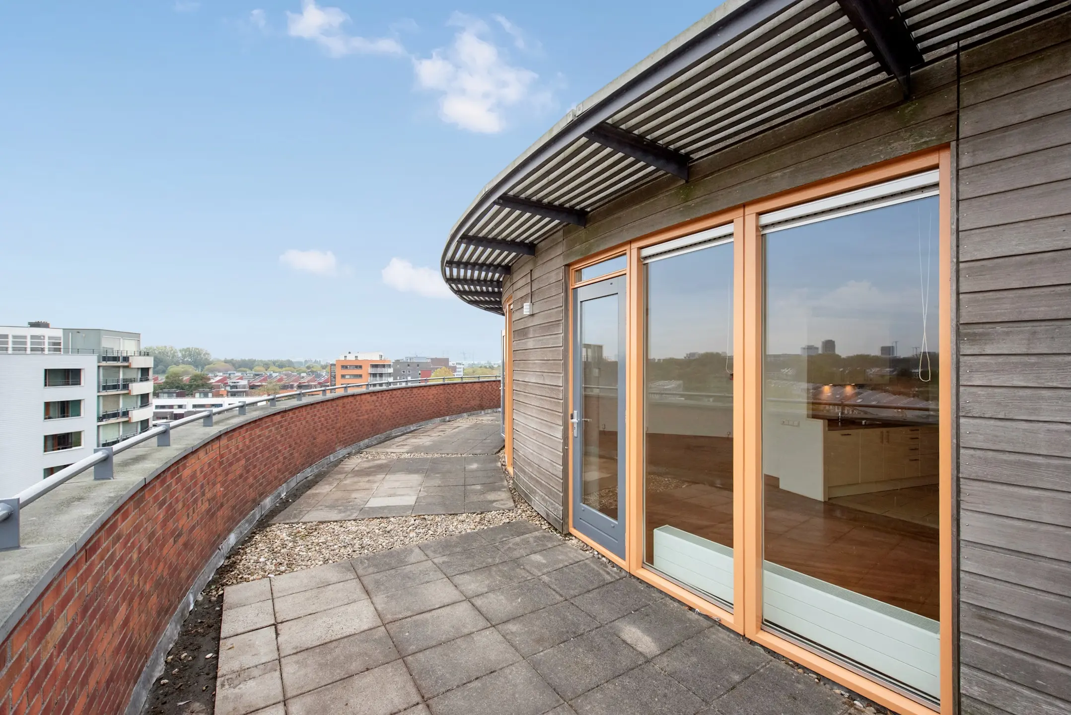 Kenmerkend voor dit bijzondere appartement op de topetage is de halfrond verlopende buitengevel, alle kamers hebben toegang tot het om de woning heenlopende terras. Door de grootte is er altijd een zonnig of schaduwrijk plekje te vinden. Vermeldenswaardig is de grote mate aan privacy in en om de woning.