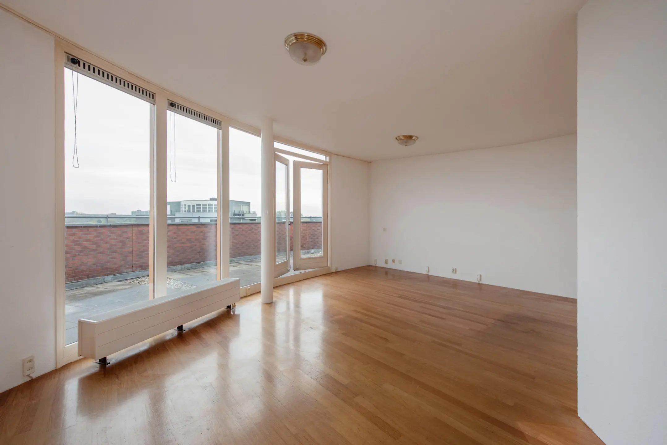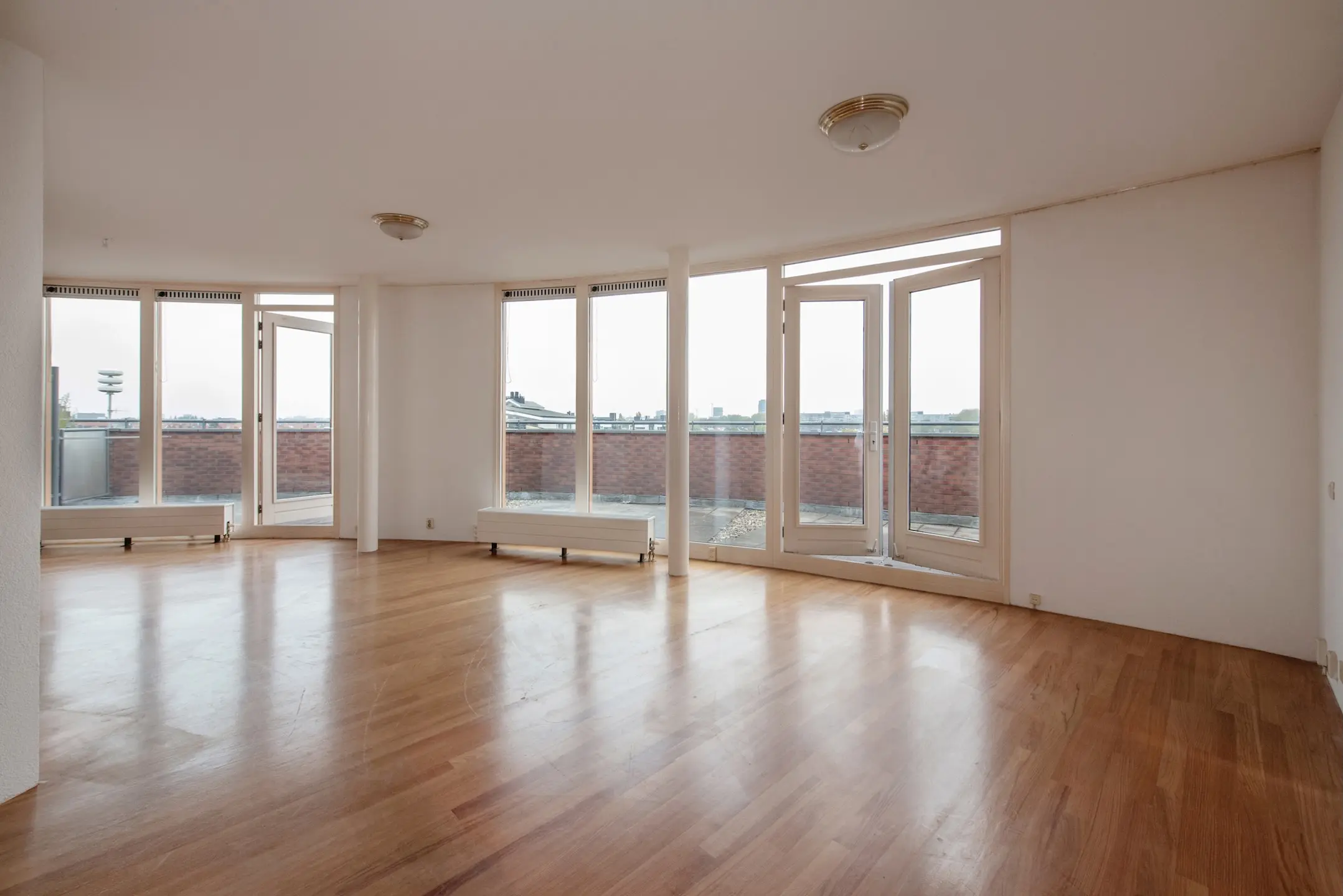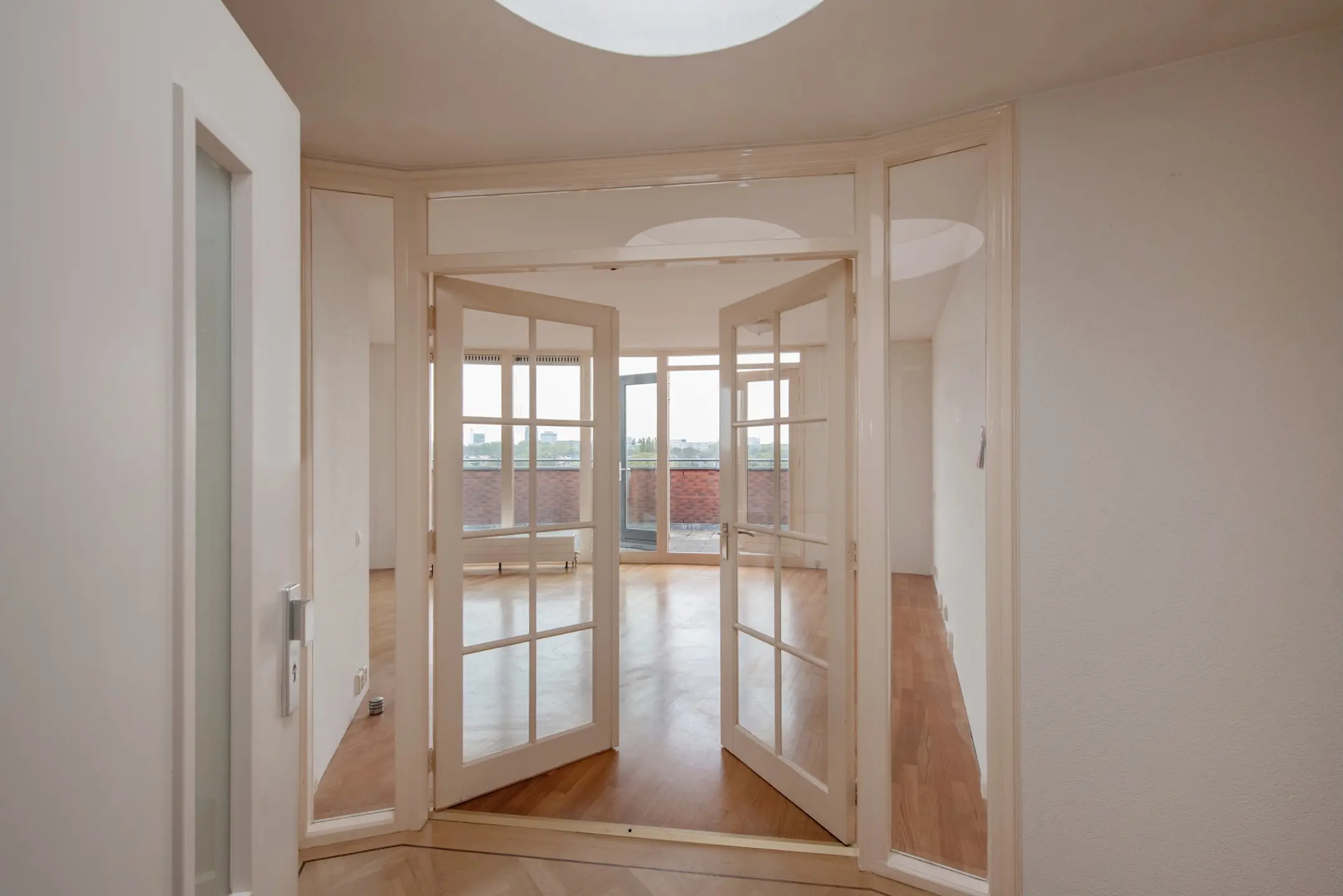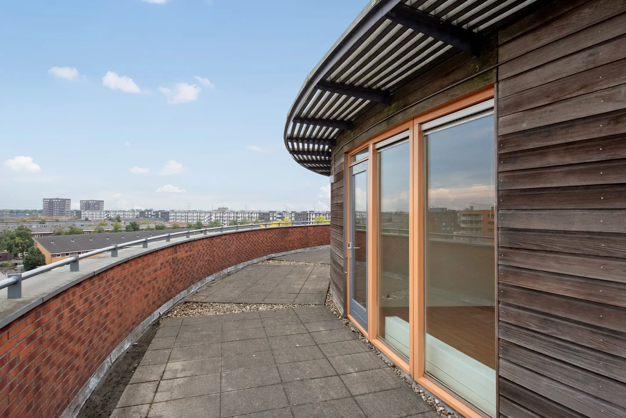 Kenmerkend voor dit bijzondere appartement op de topetage is de halfrond verlopende buitengevel, alle kamers hebben toegang tot het om de woning heenlopende terras. Door de grootte is er altijd een zonnig of schaduwrijk plekje te vinden. Vermeldenswaardig is de grote mate aan privacy in en om de woning.