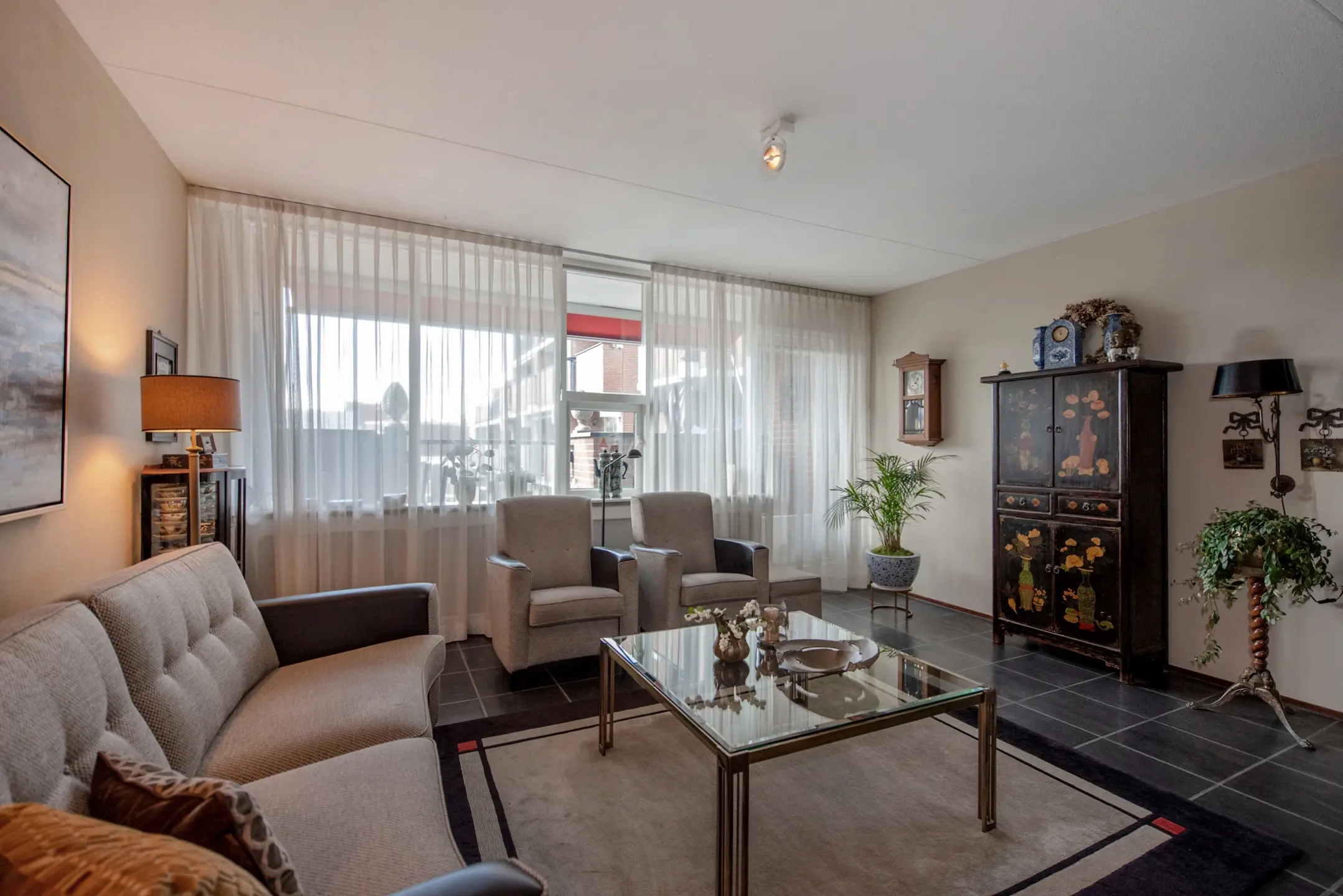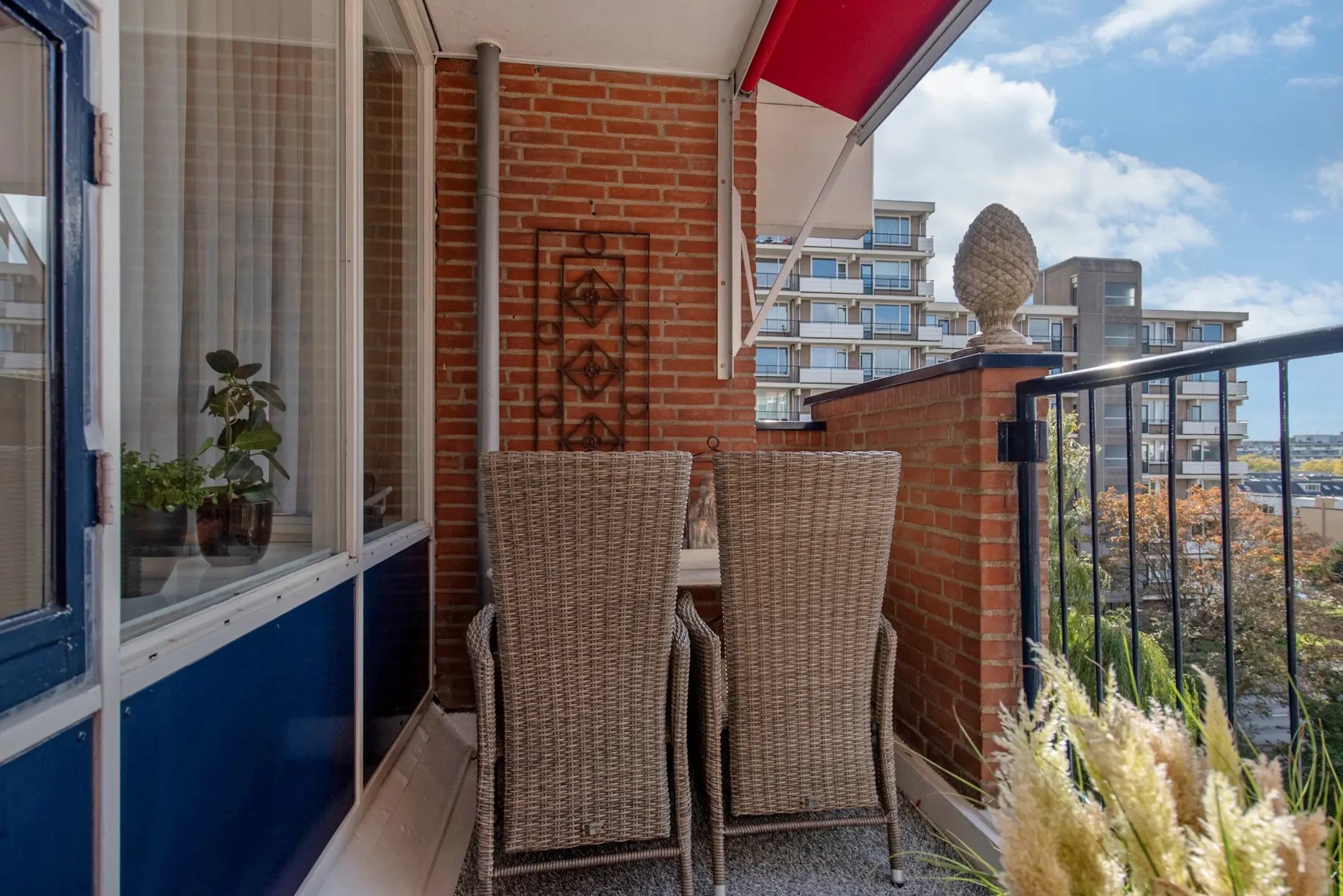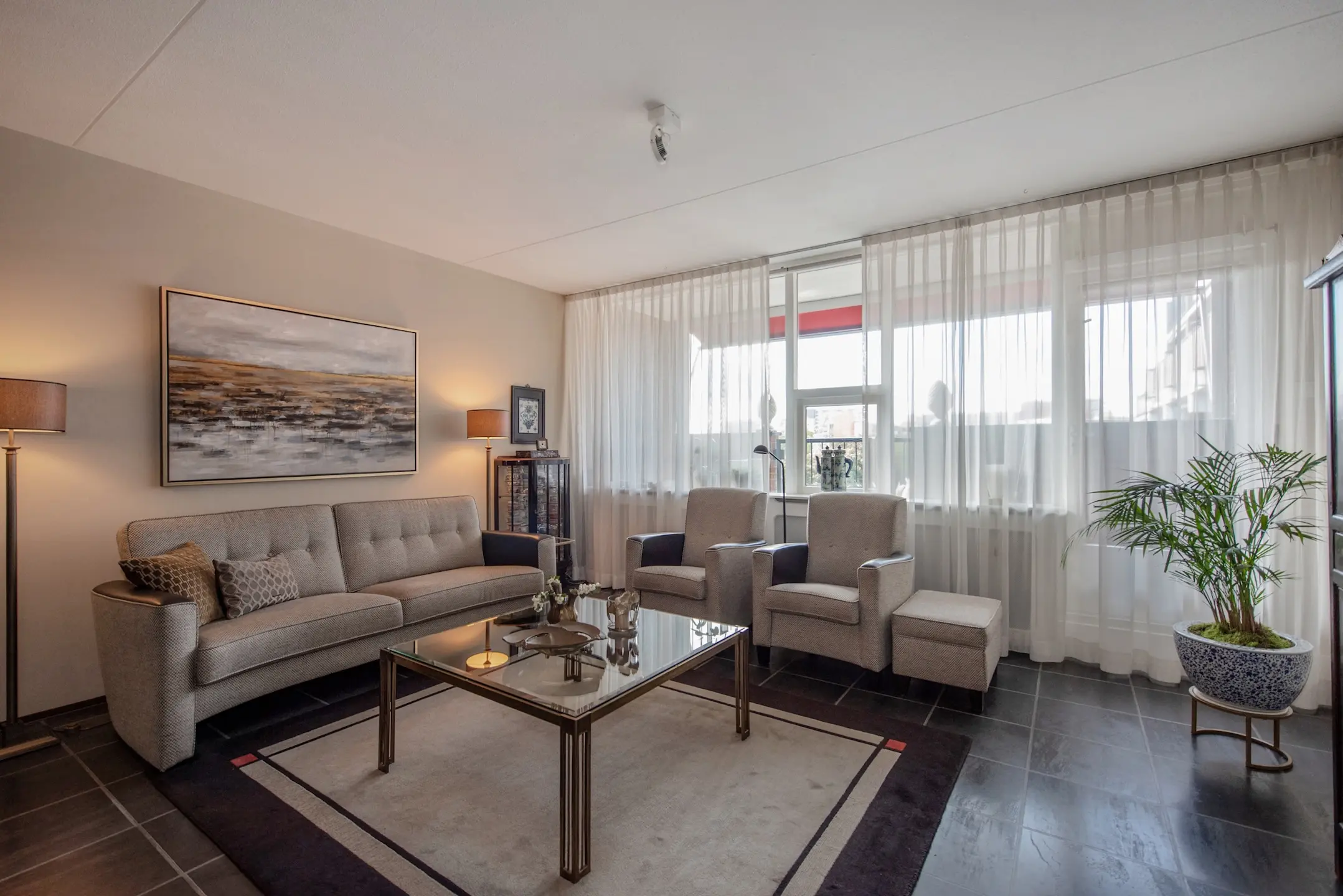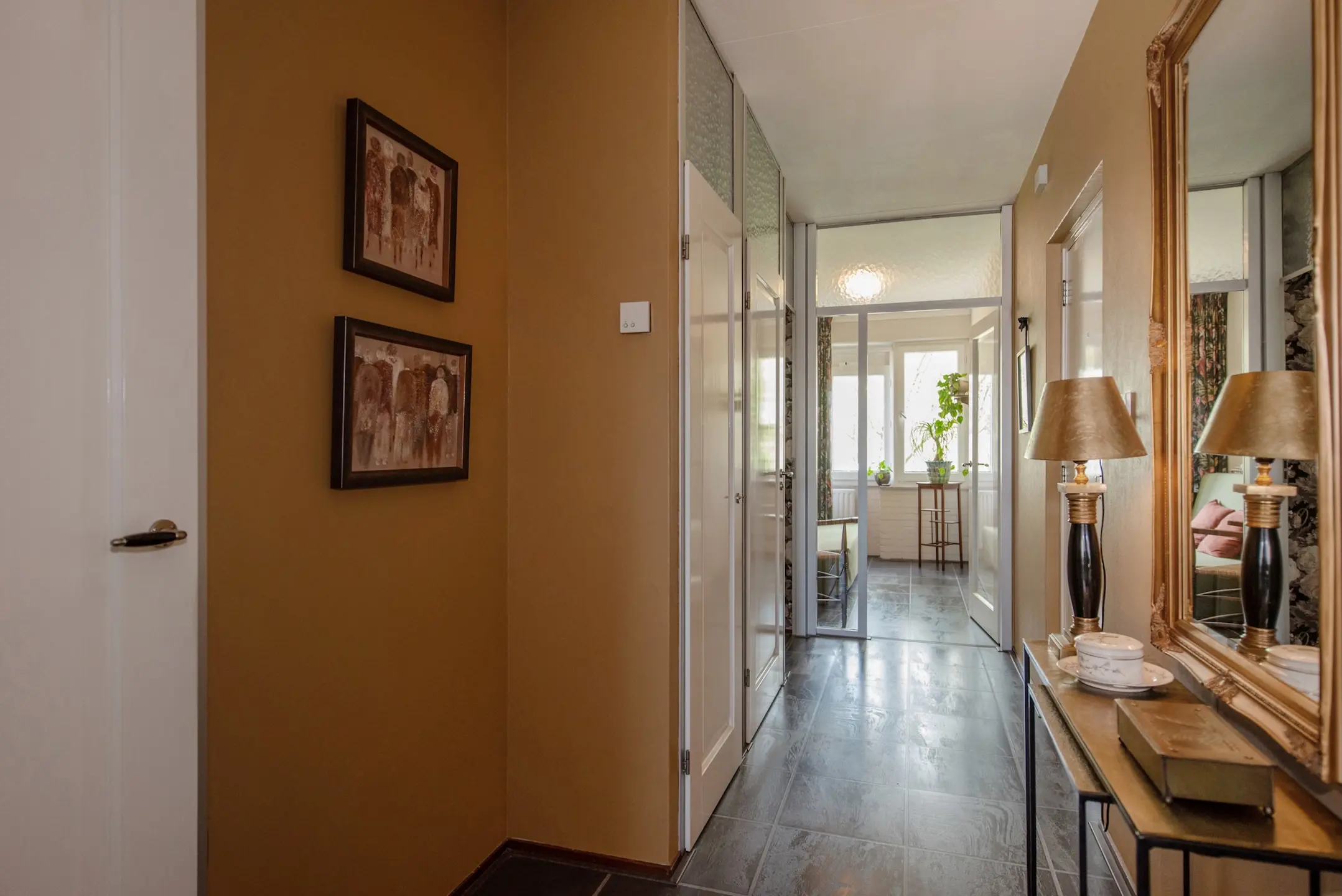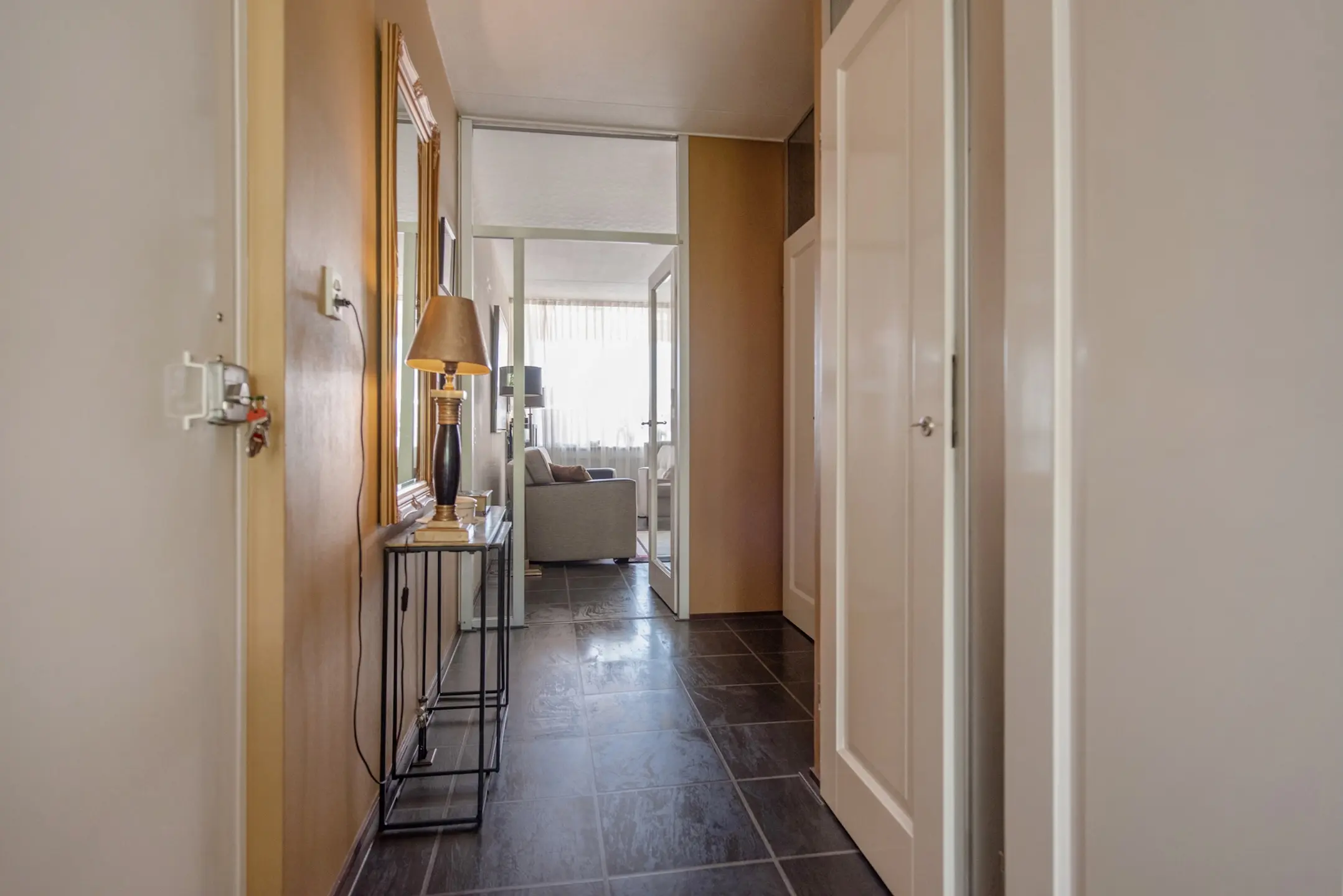 Bij binnenkomst in de woning treft u een ruime hal met toegang tot de meterkast, een praktische bergkast en een modern, separaat toilet met fontein. Vanuit de hal loopt u door naar de royale, achtergelegen woonkamer. Deze is heerlijk licht, voorzien van tapijt en biedt direct toegang tot het ruime, zonnige balkon met elektrisch bedienbare zonwering – dé plek om tot in de late uurtjes te genieten van de zon.