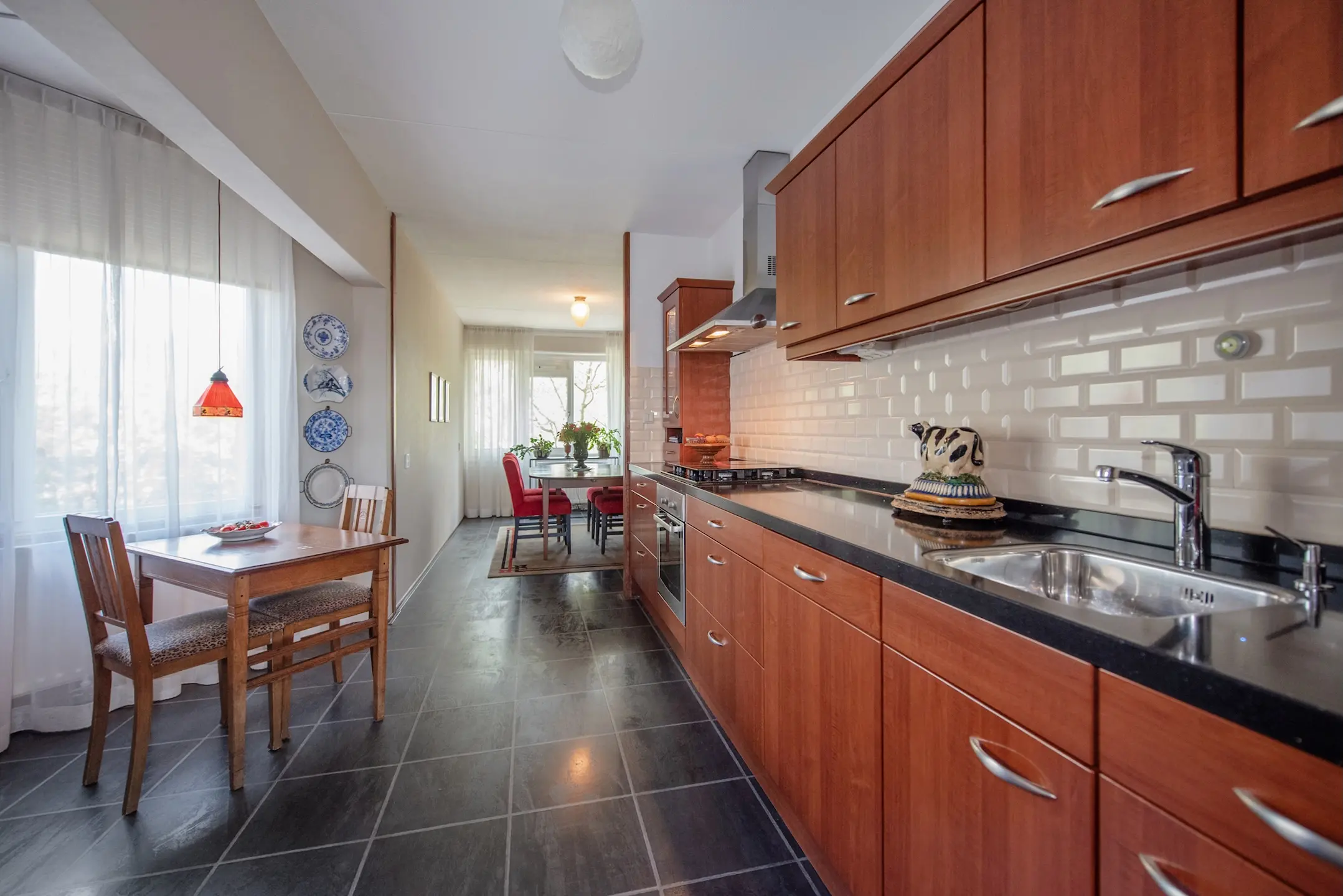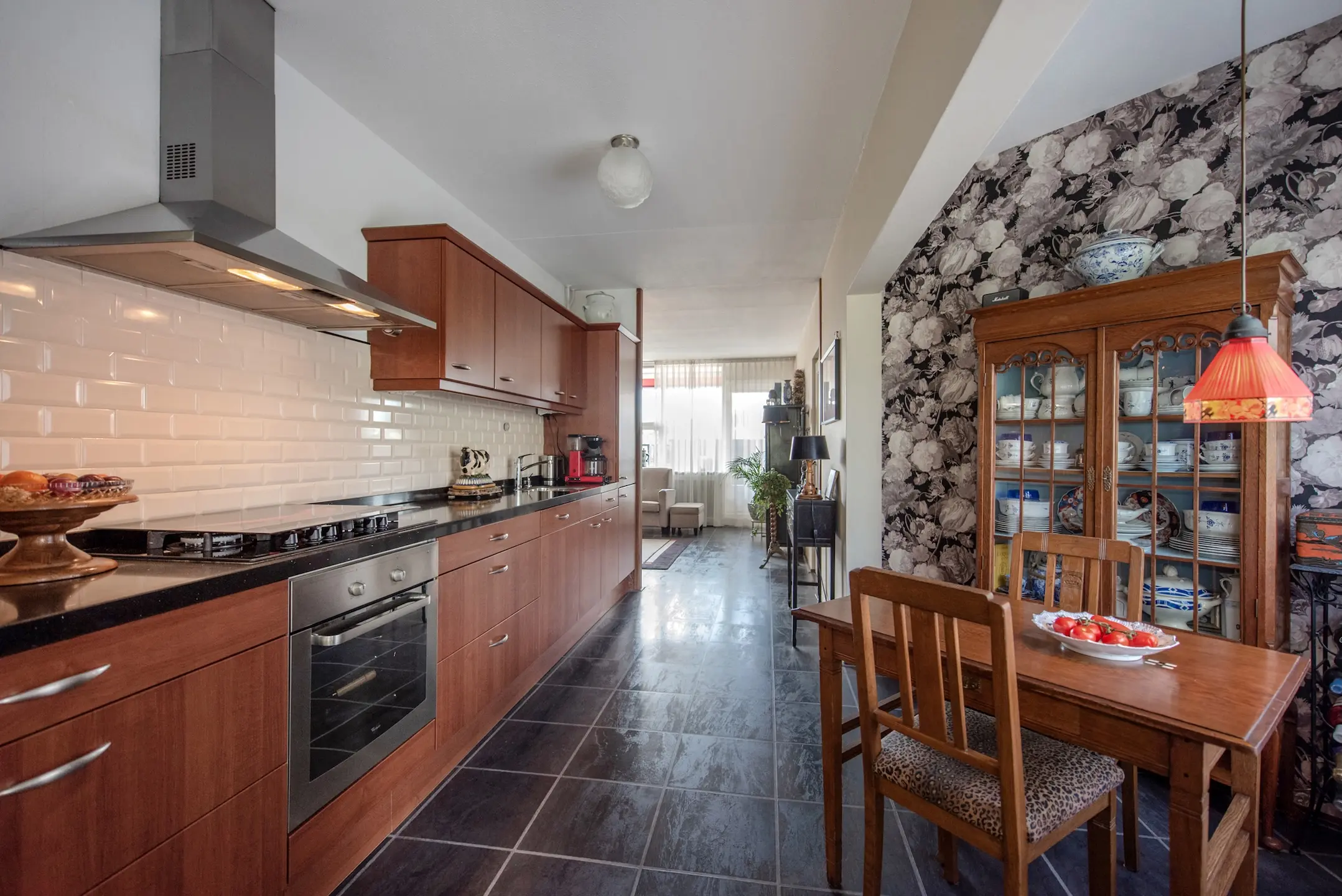 De nette keuken bevindt zich centraal in de woning en is uitgerust met een 5-pits gasfornuis, oven, vaatwasser, koel-vriescombinatie en voldoende kastruimte. De koel-vriescombinatie en vaatwasser zijn slechts twee jaar oud. Vanuit de keuken bereikt u de ruime eethoek aan de voorzijde, ideaal als separate eetkamer of extra zitruimte.