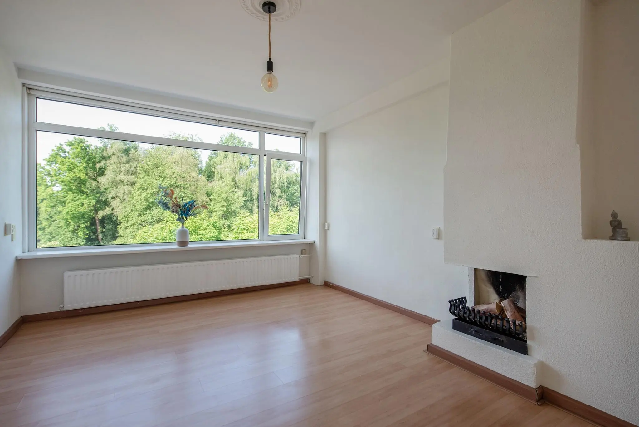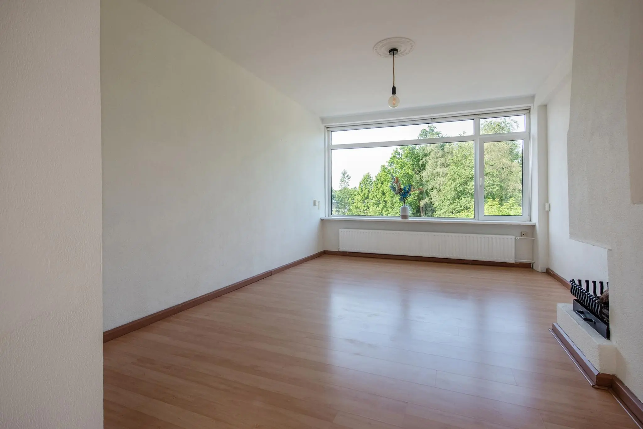 Groen en vrij uitzicht: Vanuit de woonkamer kijk je uit over een prachtig stukje park – geen directe inkijk, maar rust en privacy.
