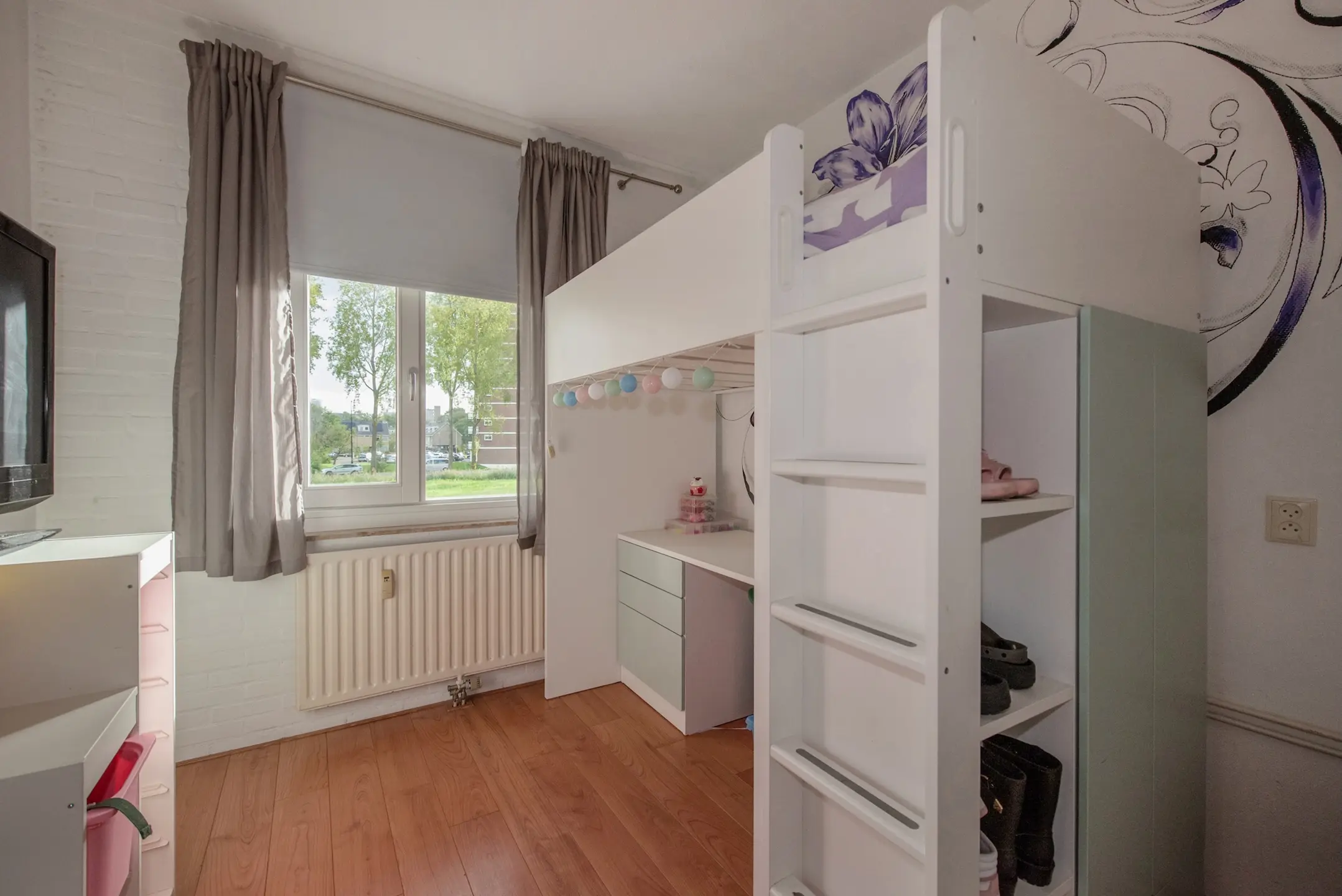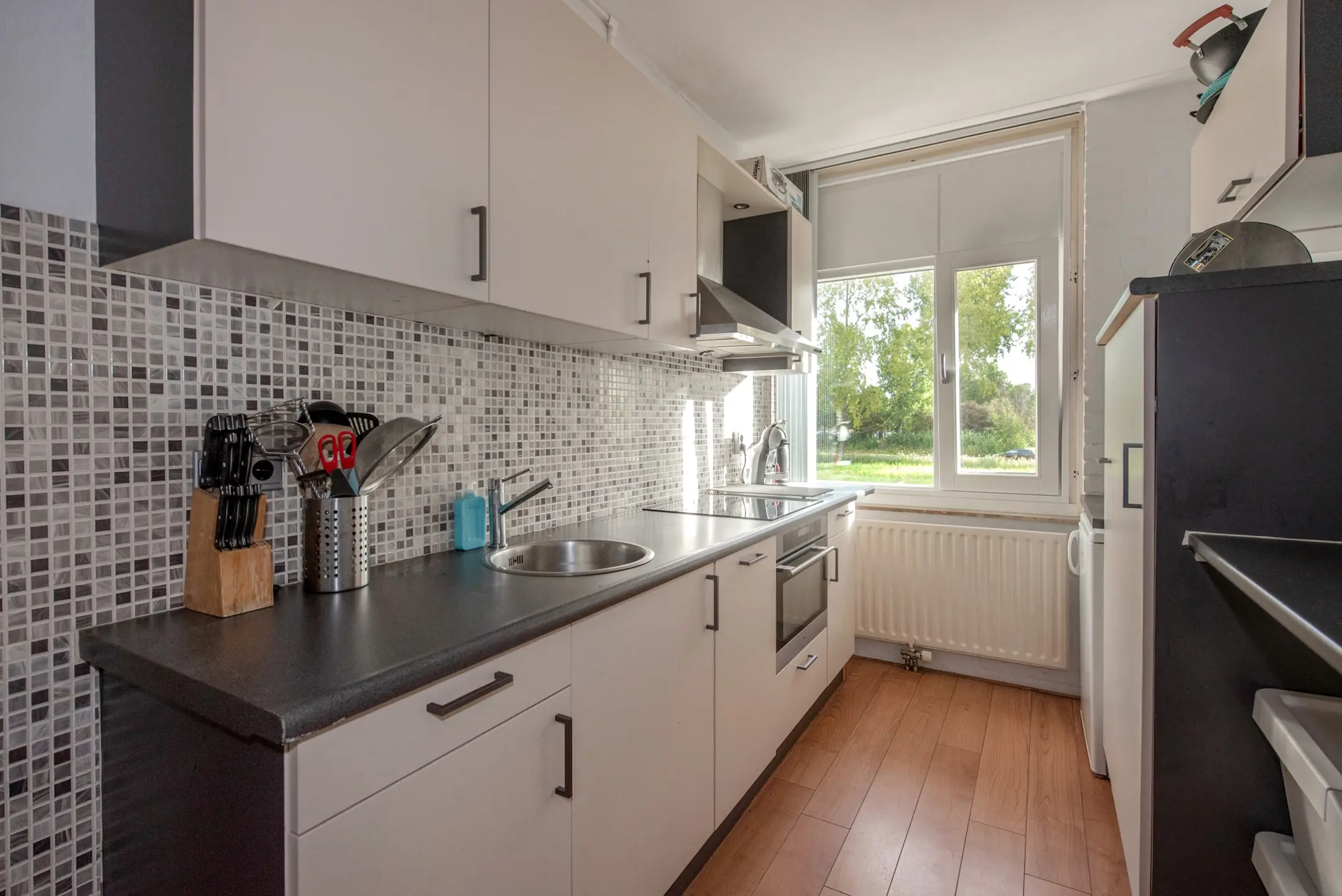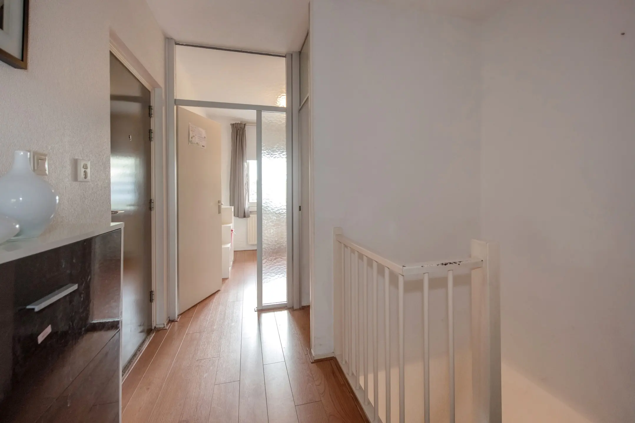 1e verdieping: overloop met vaste kast, voorgelegen slaapkamer, keurige en goed formaat woon-/eetkamer met toegang tot het zonnige terras (ZW), nette keuken met RVS afzuigkap en o.a. een inductie kookplaat, combi/oven magnetron en vaatwasser, vrij hangend toilet en wasruimte met o.a. een wasmachine aansluiting.