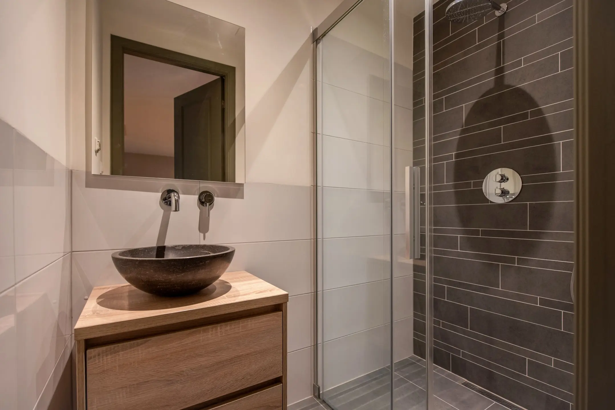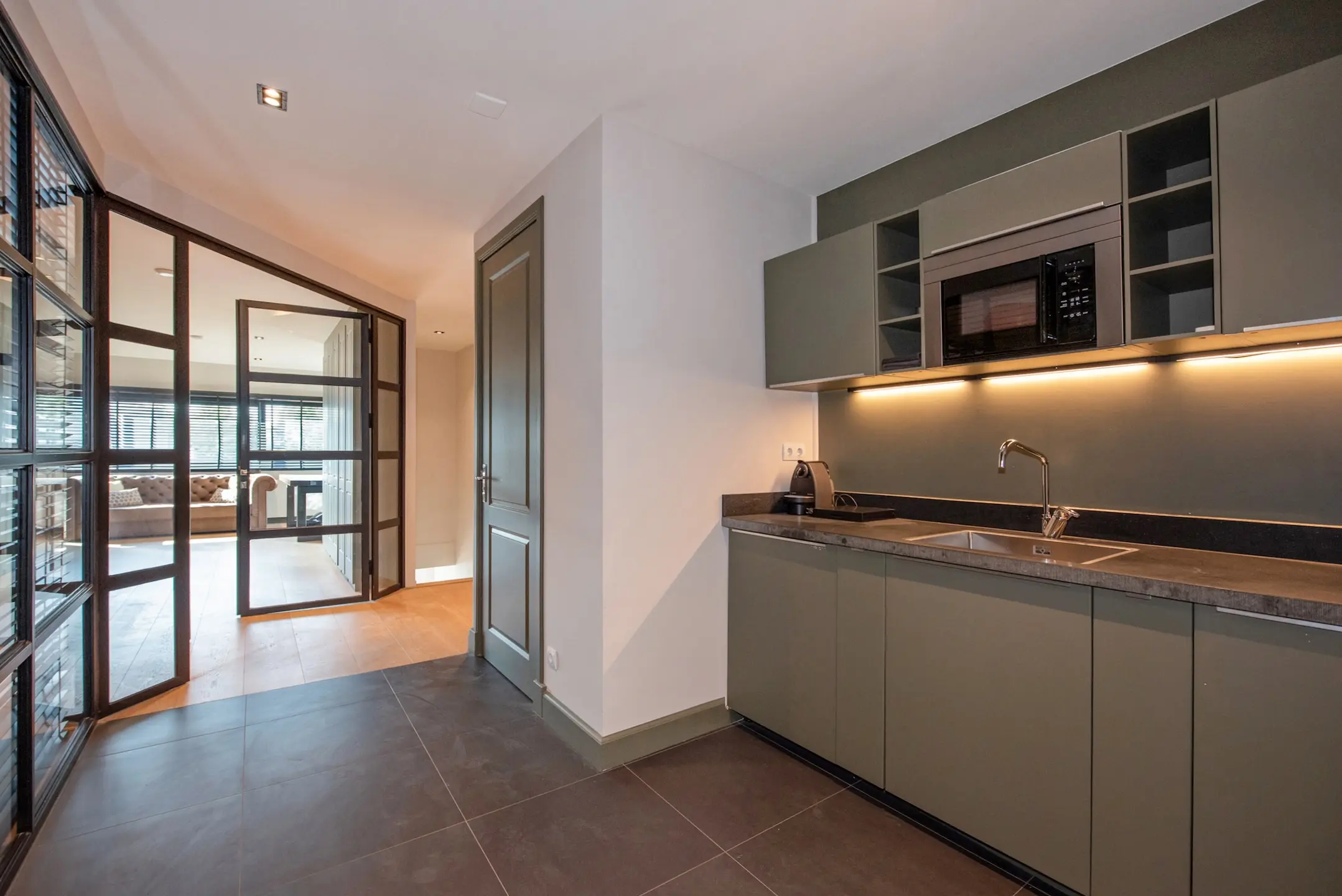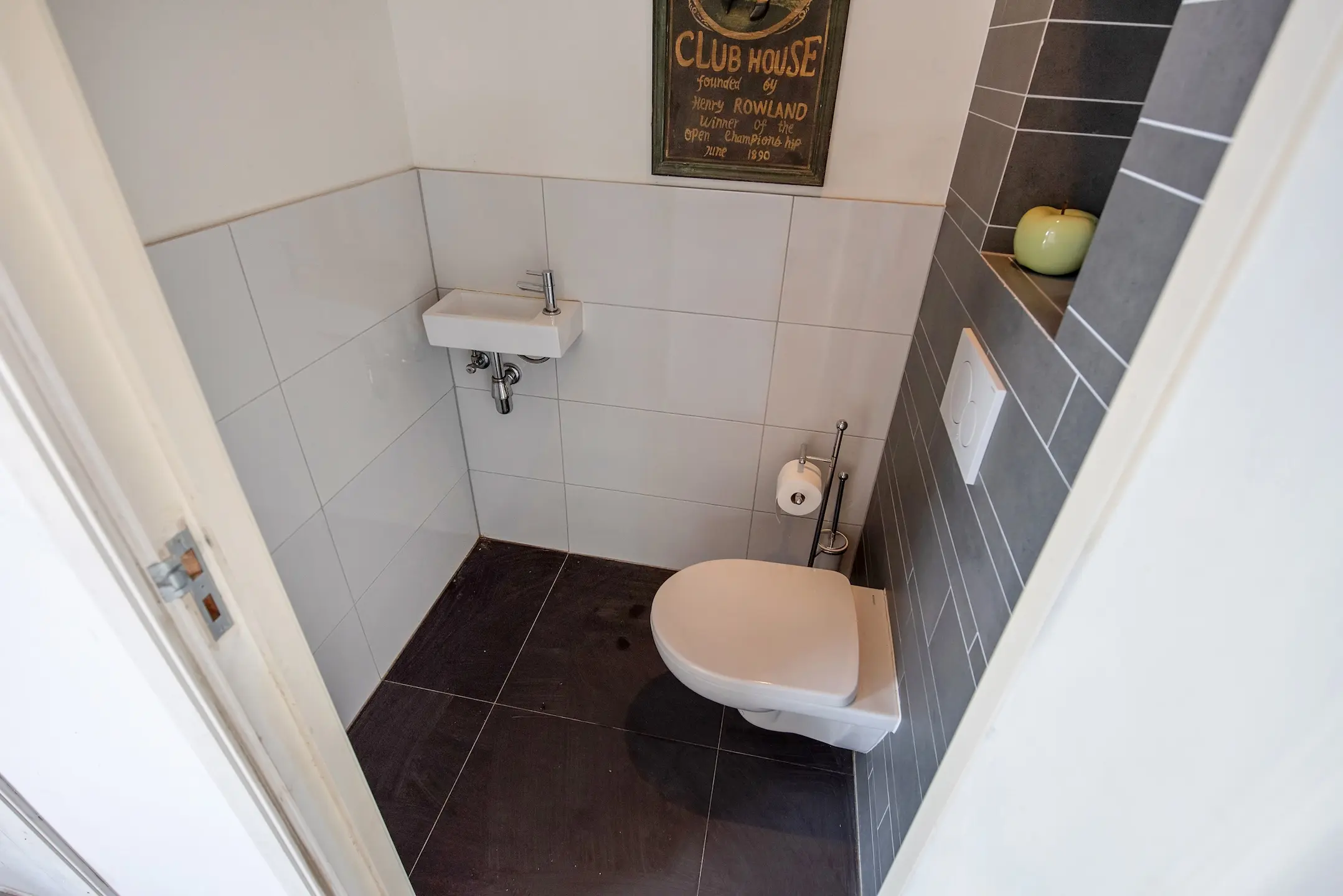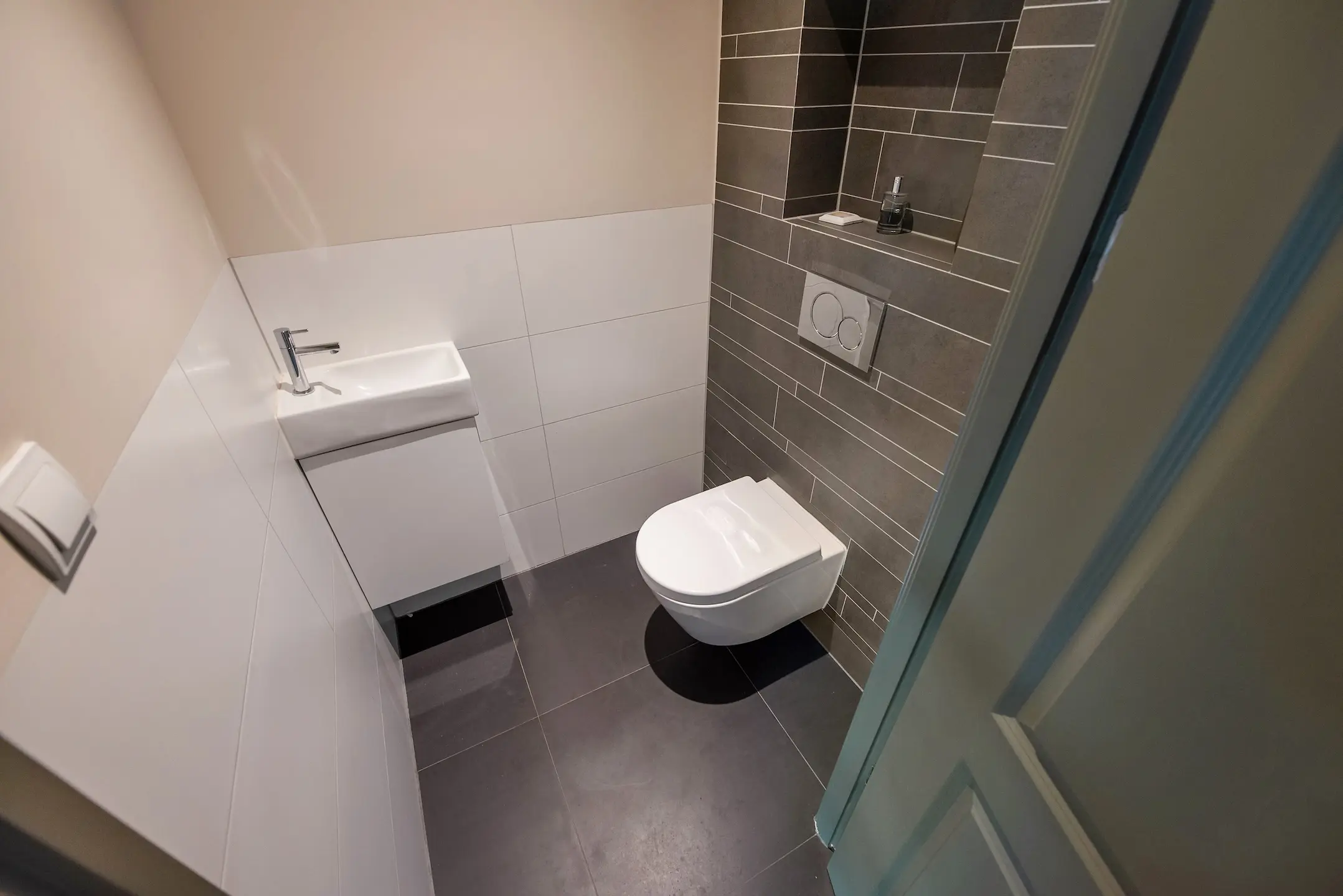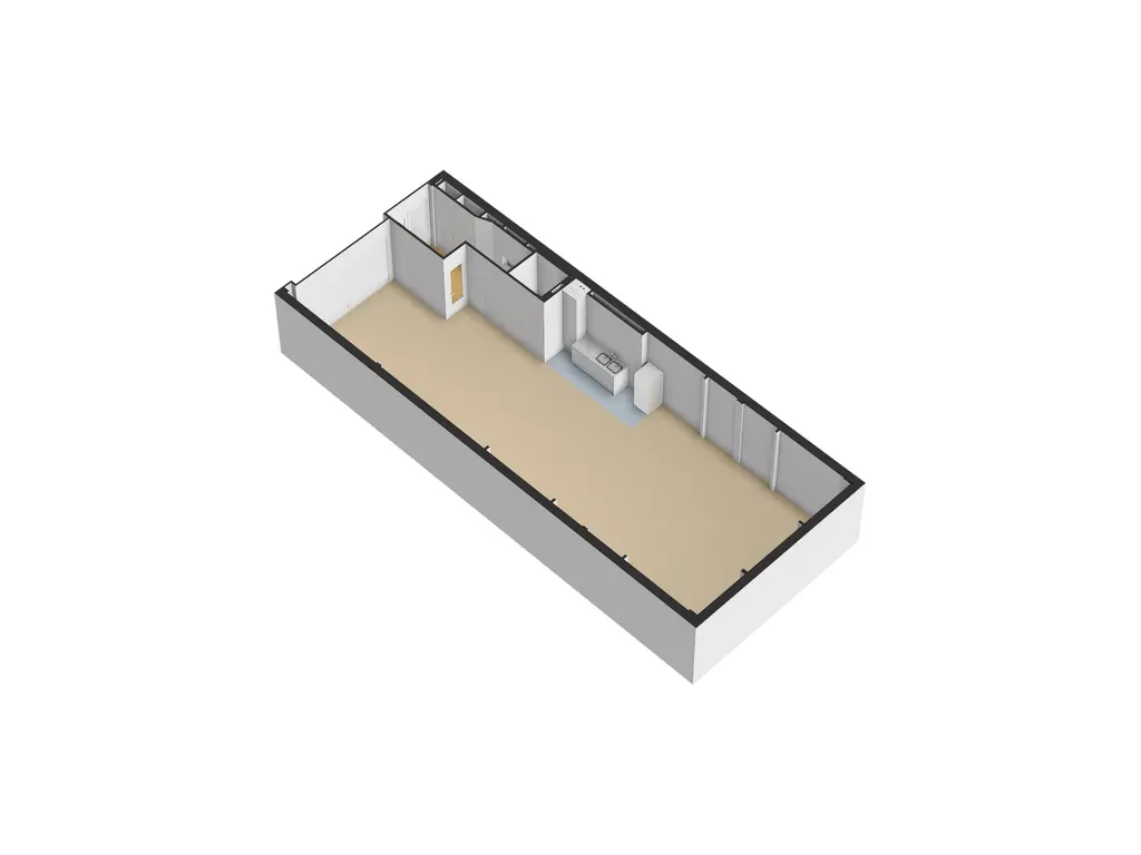 Eén ruimte betegeld, met inbouwkasten en doucheruimte met wastafel