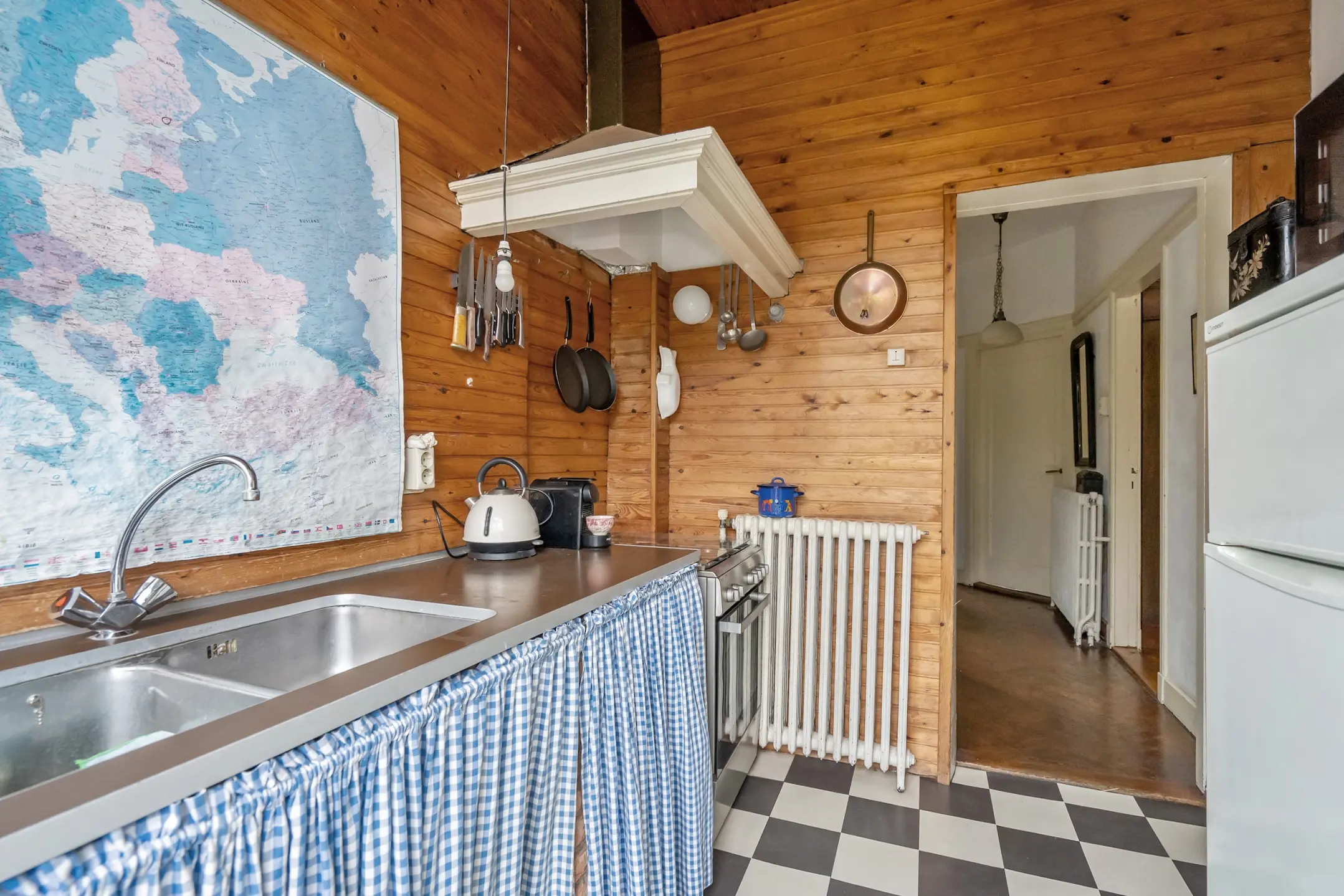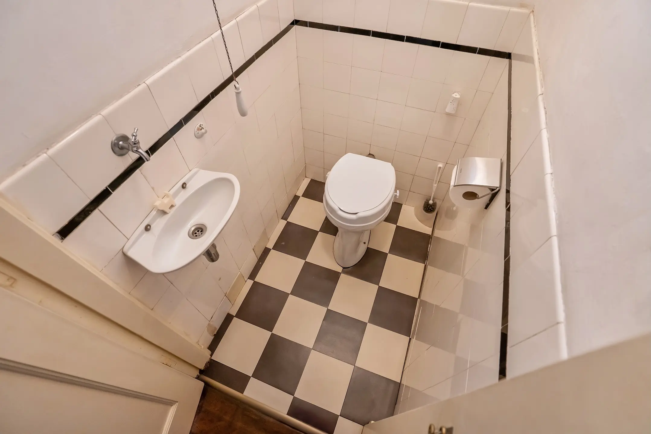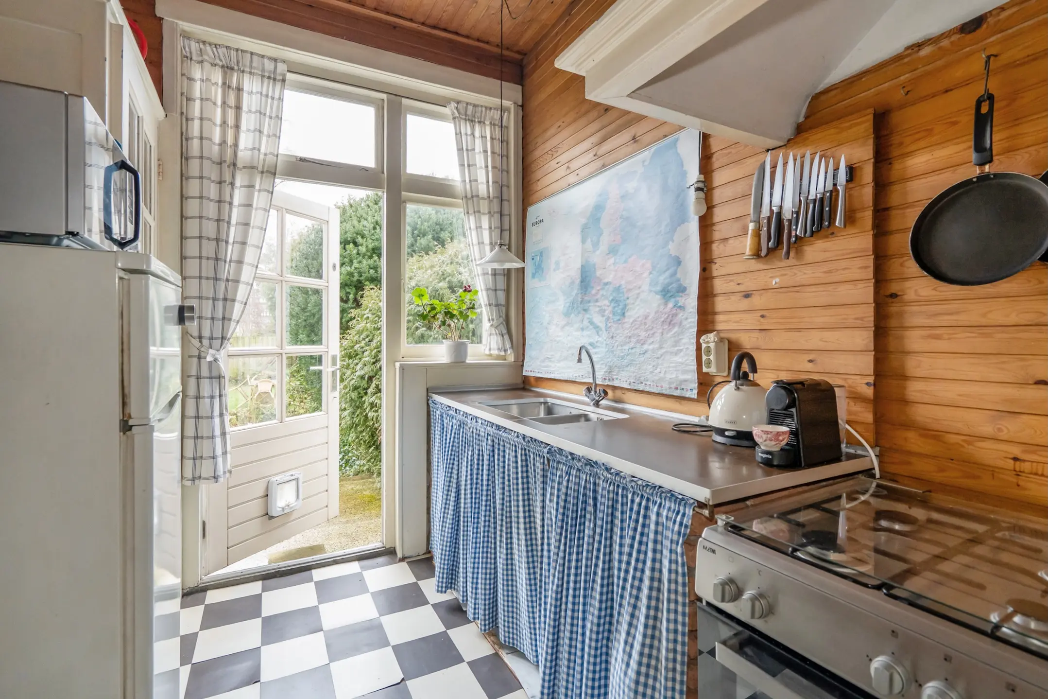 Eenvoudige keuken met tuindeur. Toilet met fonteintje.