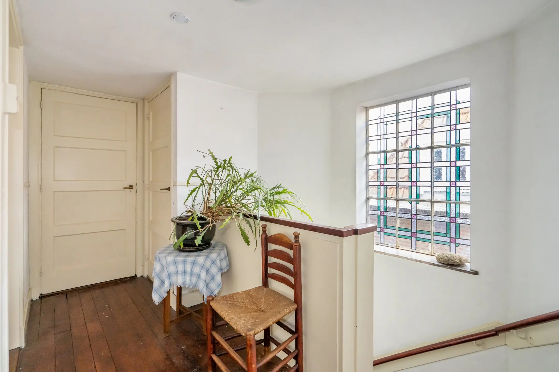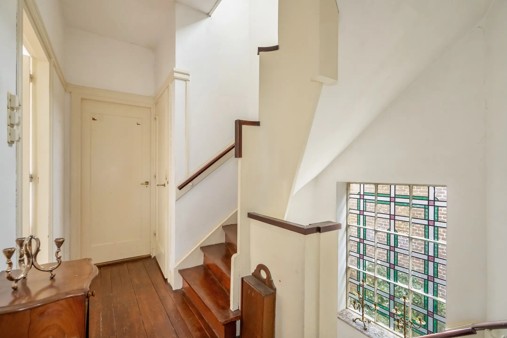 Eerste verdieping: mooi trappenhuis met een zijraam voorzien van glas-in-lood ramen, overloop, grote slaapkamer aan de voorzijde met erkerraam en twee vaste kasten, riante achterkamer met drie vaste kasten en dubbele deuren naar het balkon aan de achterzijde. Achterzijkamer met dubbele balkondeuren.