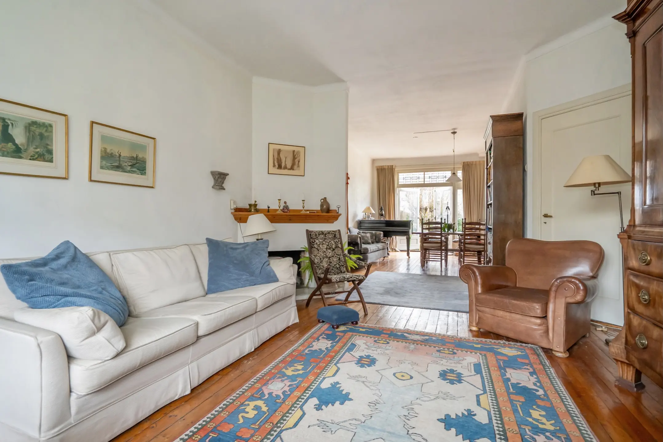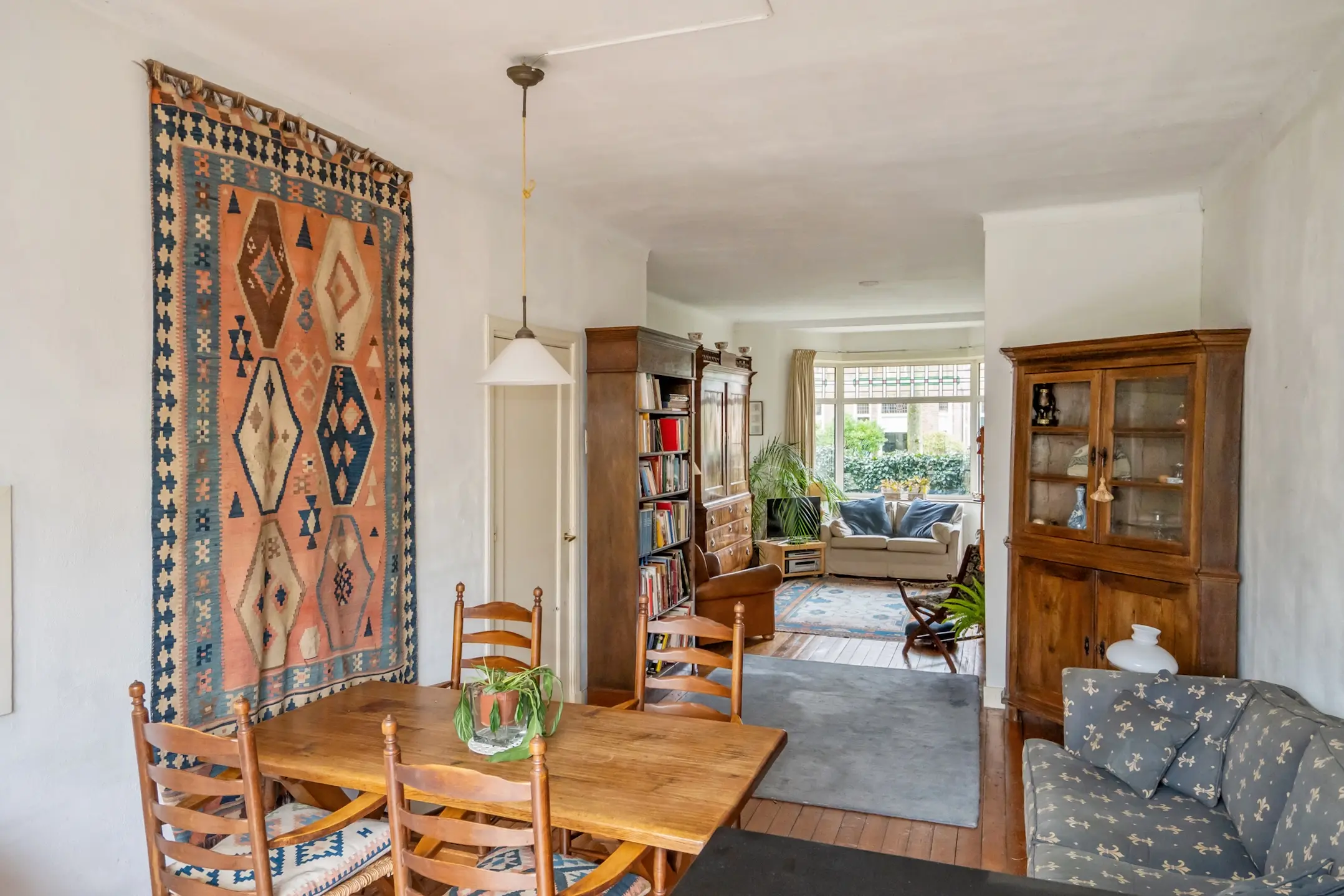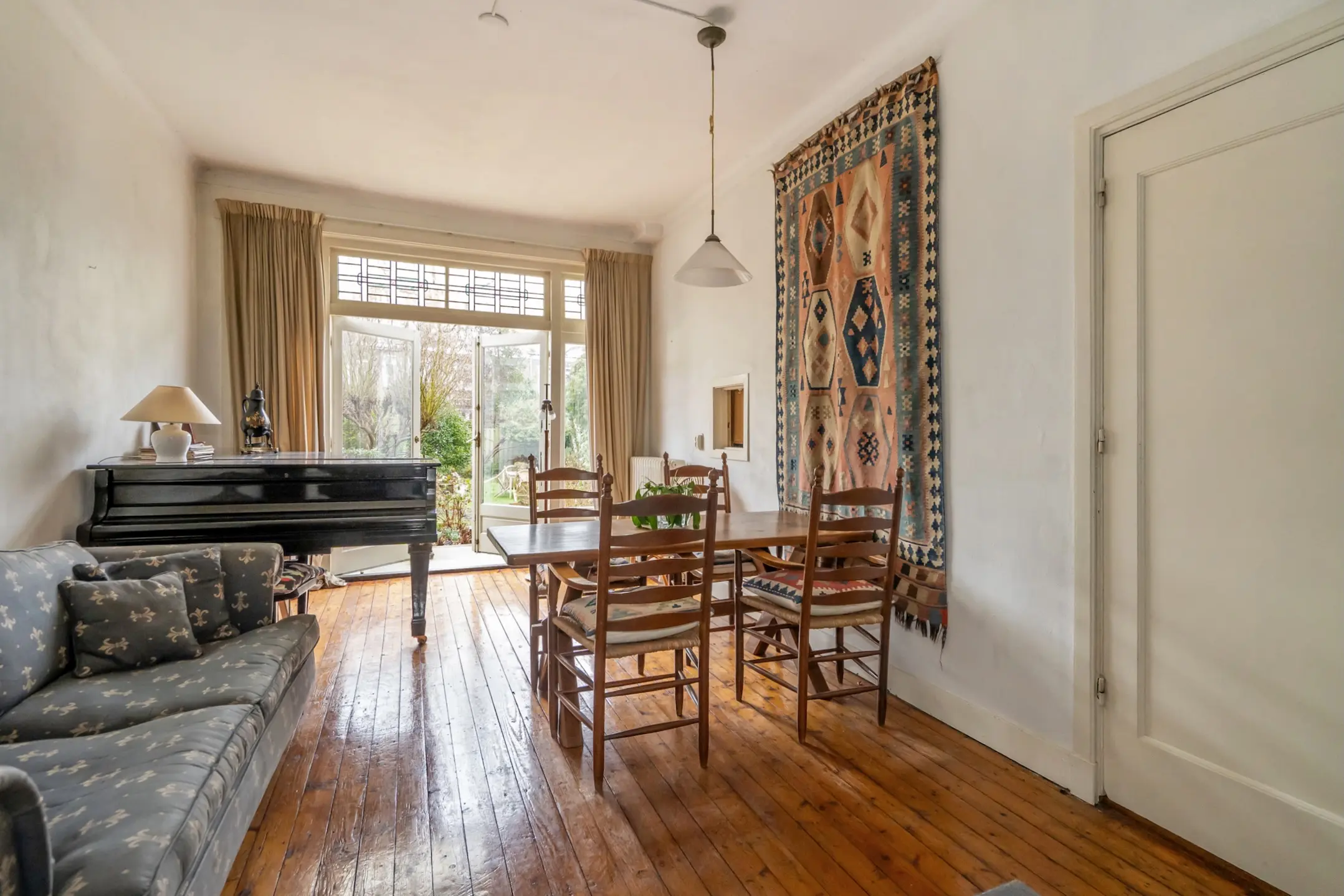 Mooie woon-/eetkamer met erkerraam aan de voorzijde voorzien van glas-in-lood ramen, open haard en dubbele tuindeuren met glas-in-lood ramen aan de achterzijde. De oude suitedeuren zijn nog aanwezig.