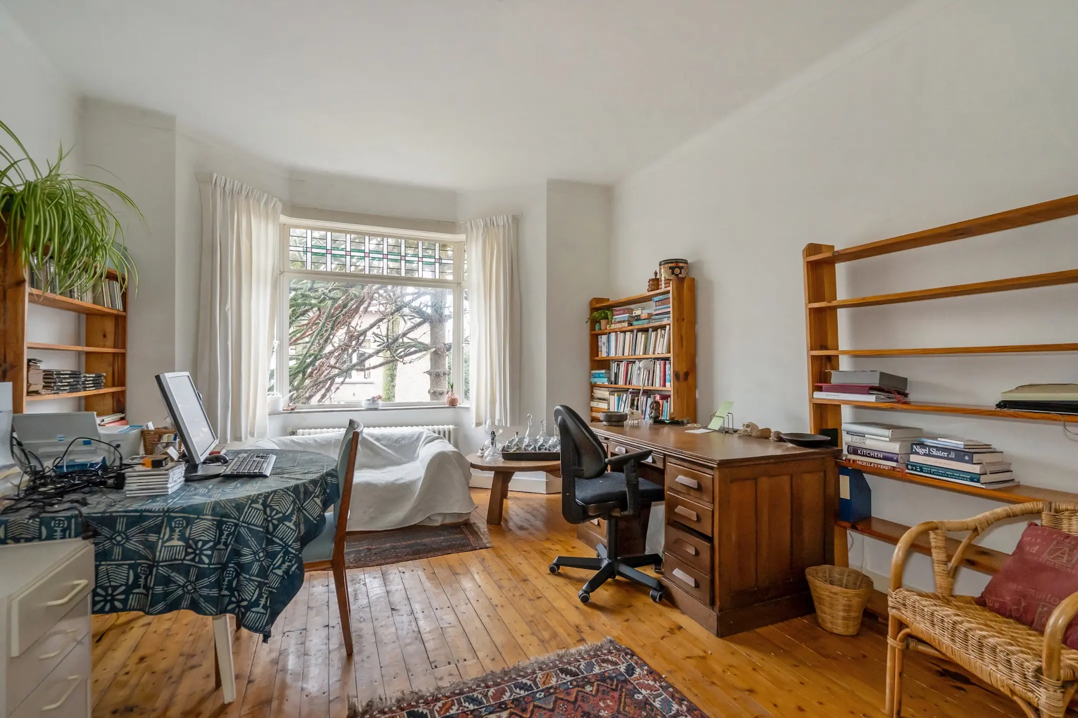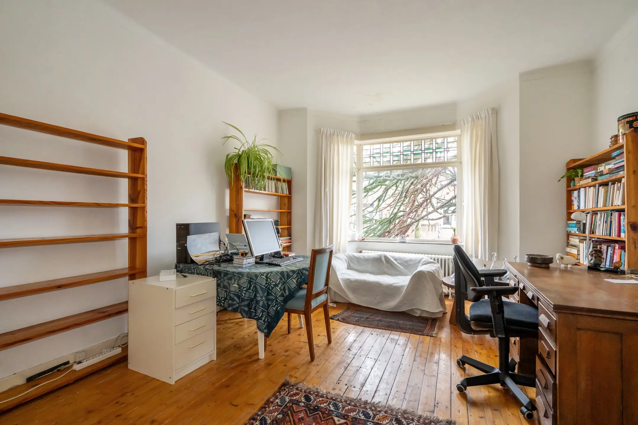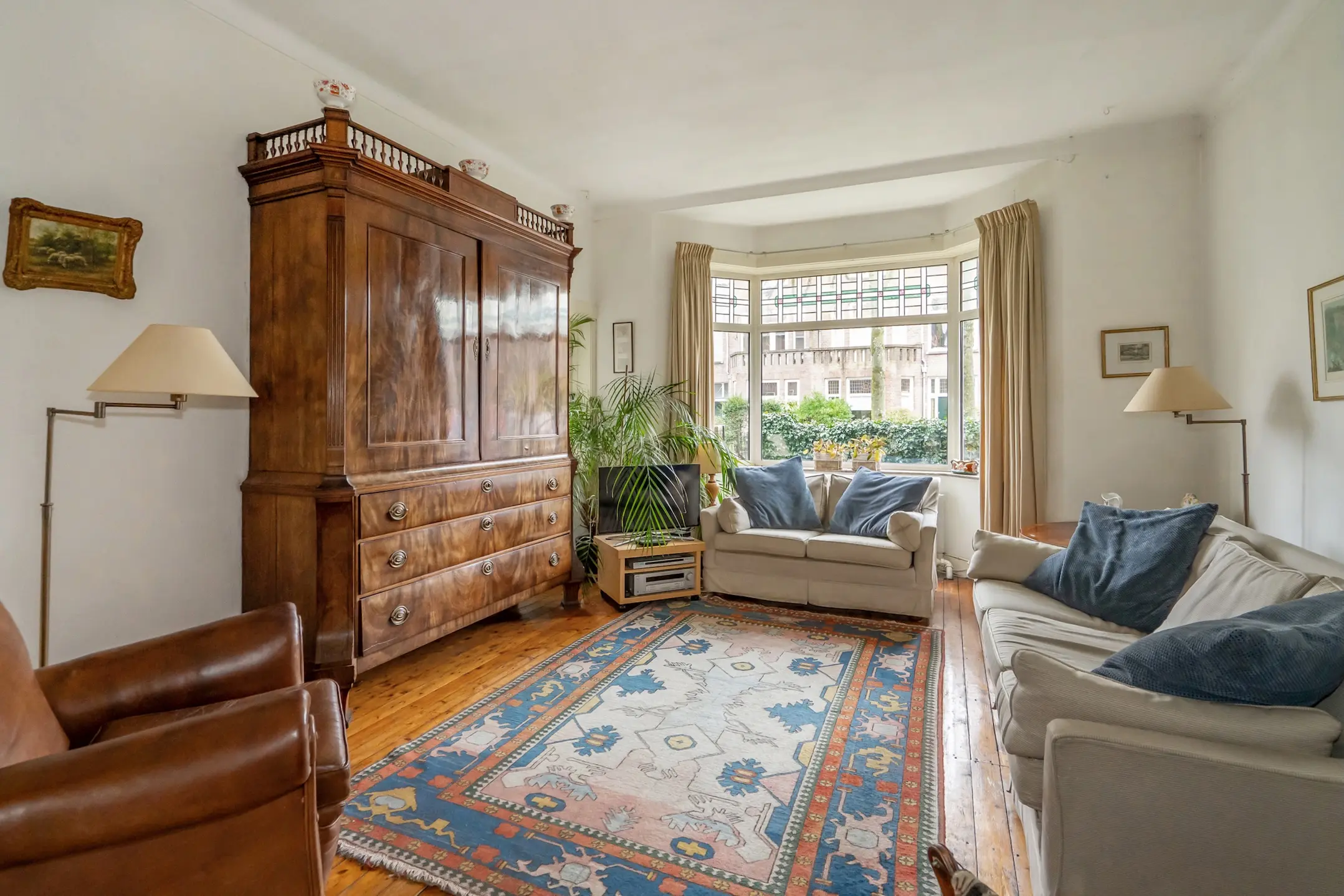 Mooie woon-/eetkamer met erkerraam aan de voorzijde voorzien van glas-in-lood ramen, open haard en dubbele tuindeuren met glas-in-lood ramen aan de achterzijde. De oude suitedeuren zijn nog aanwezig.
