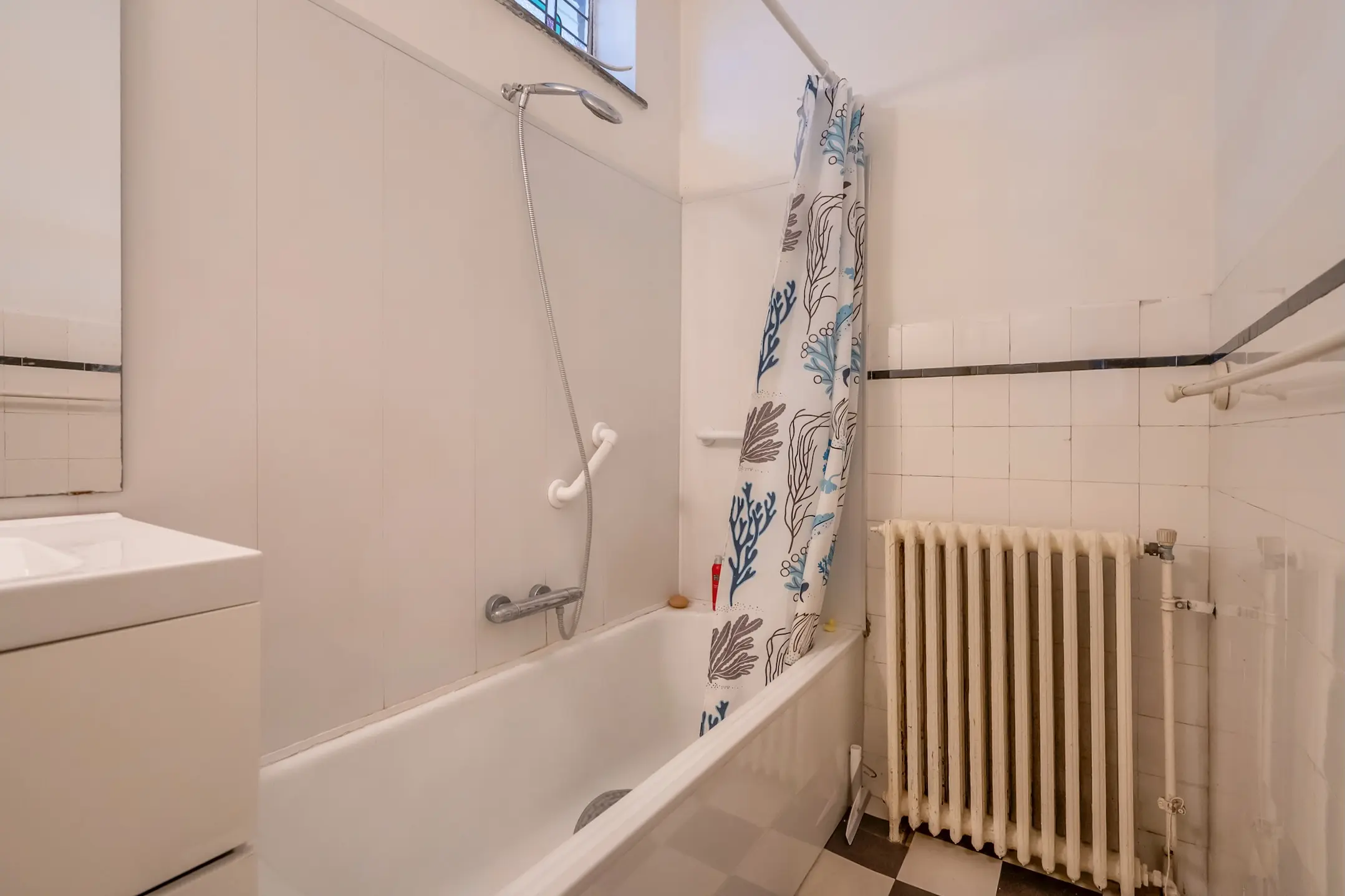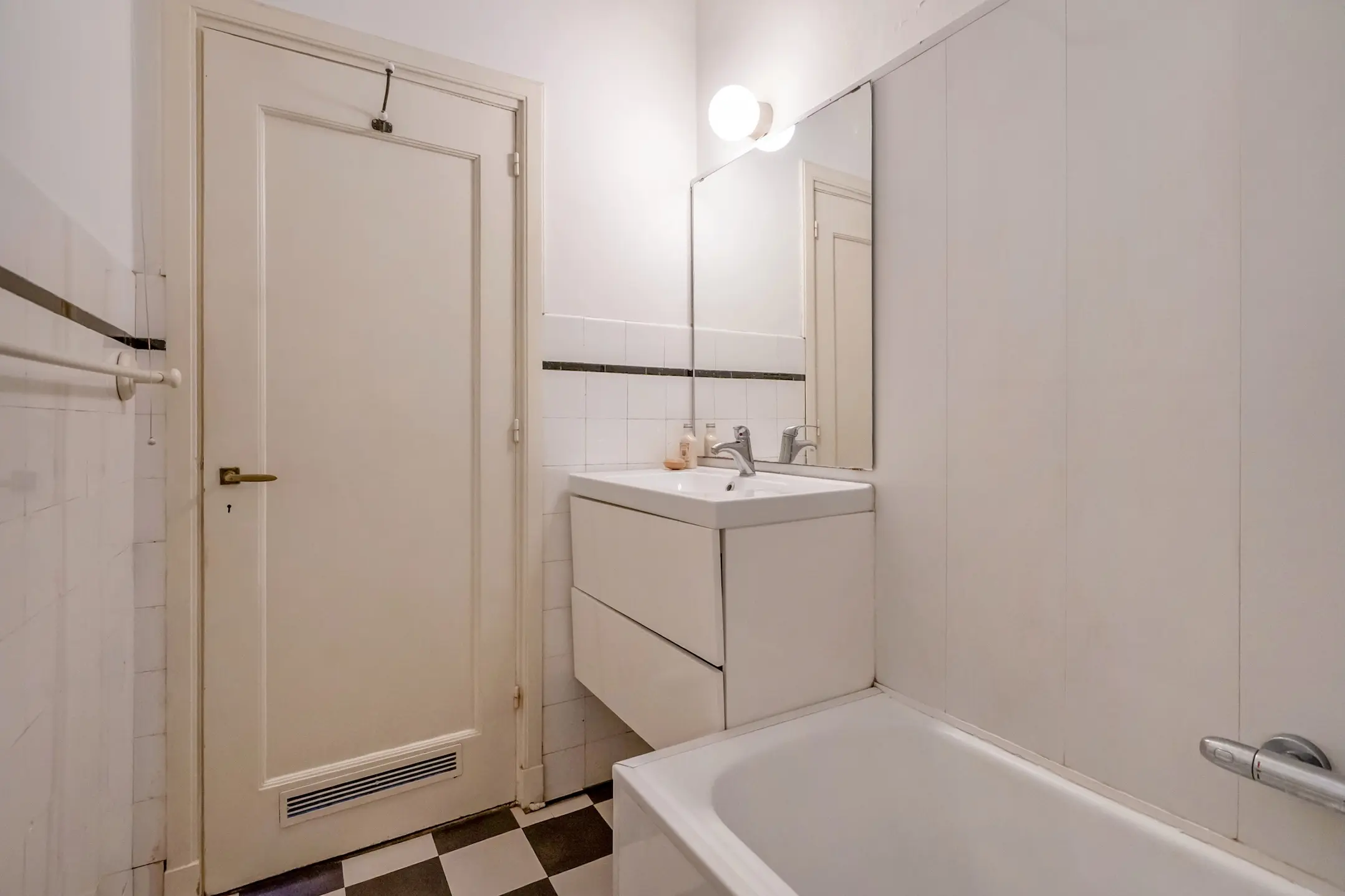 Eenvoudige badkamer met een ligbad/douche en een strak wastafelmeubel, separaat 2e toilet.