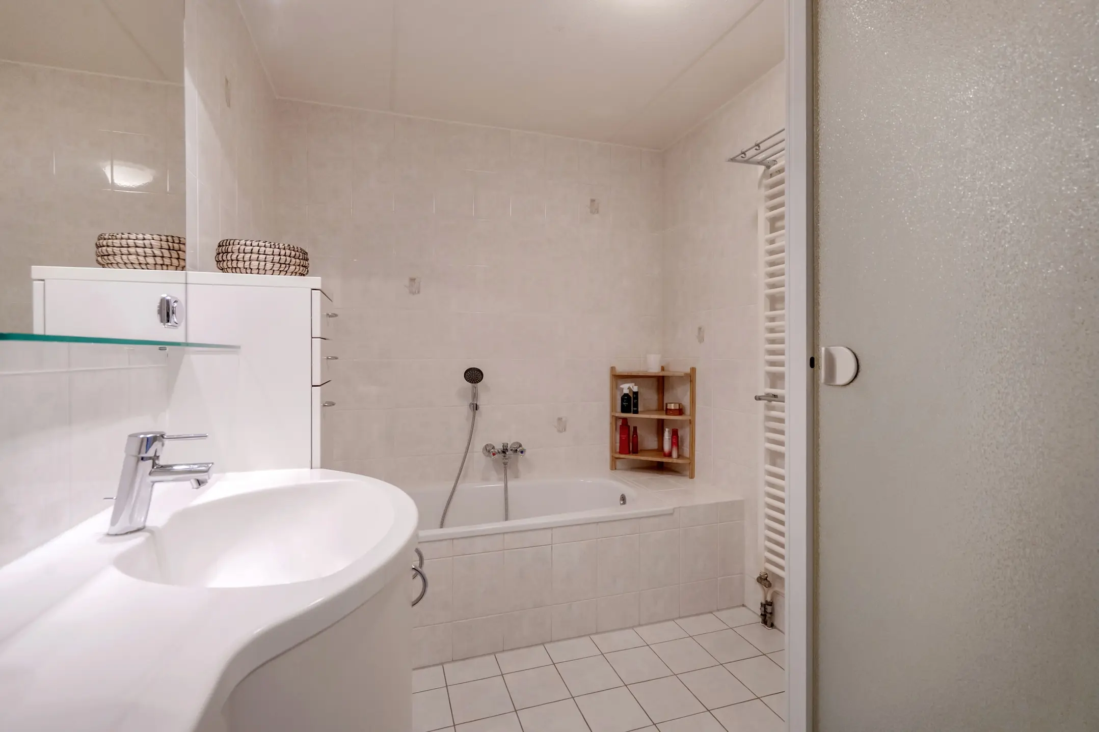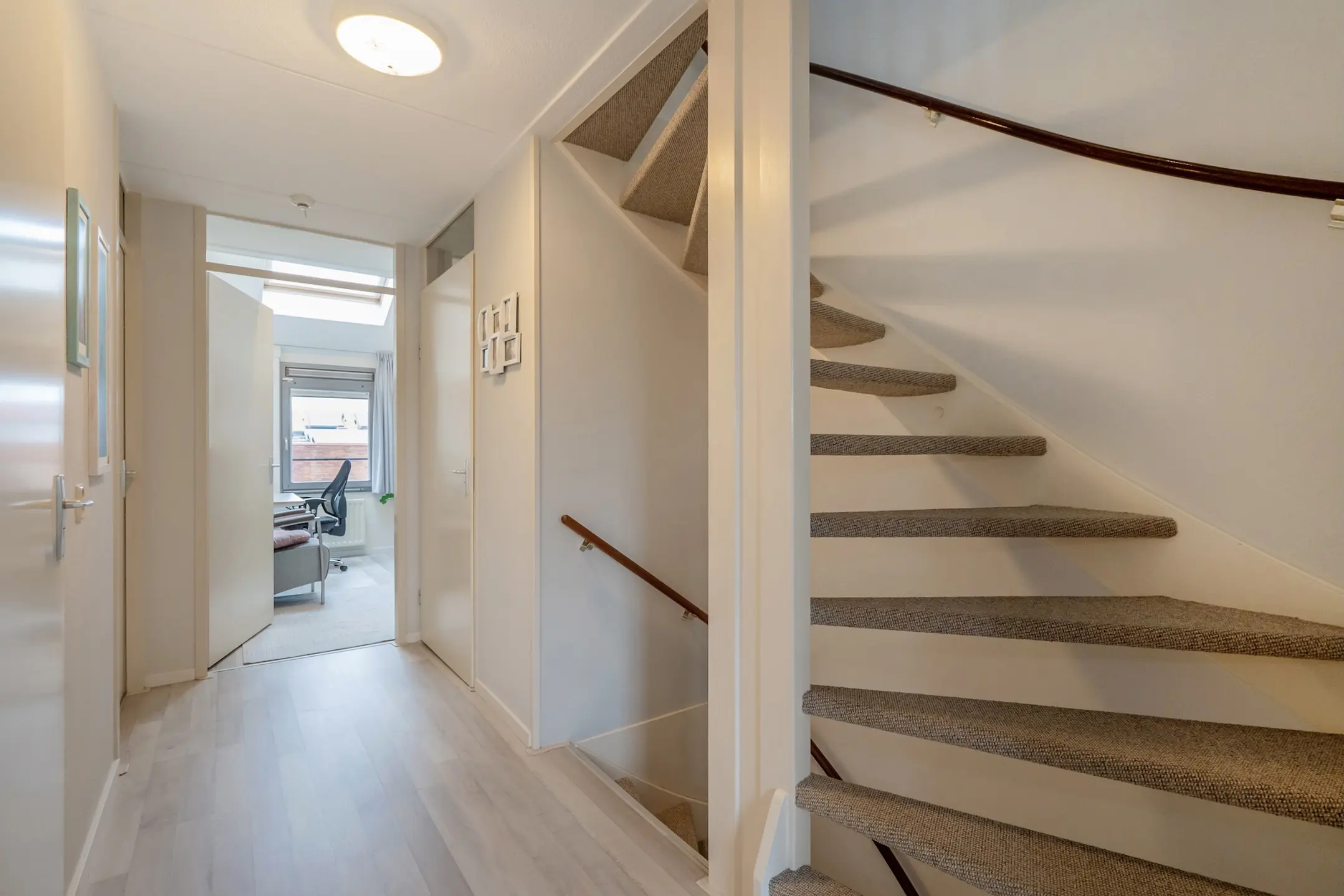 1e verdieping: overloop, toilet met fontein, royale en lichte hoofdslaapkamer aan de voorzijde, 2e ruime slaapkamer aan de achterzijde, volledig betegelde badkamer (geheel betegeld) welke beschikt over een ligbad, wastafelmeubel, design radiator en separate douche, 3e achtergelegen slaapkamer met een Velux dakraam voor extra lichtinval. De gehele verdieping is voorzien van een laminaatvloer.