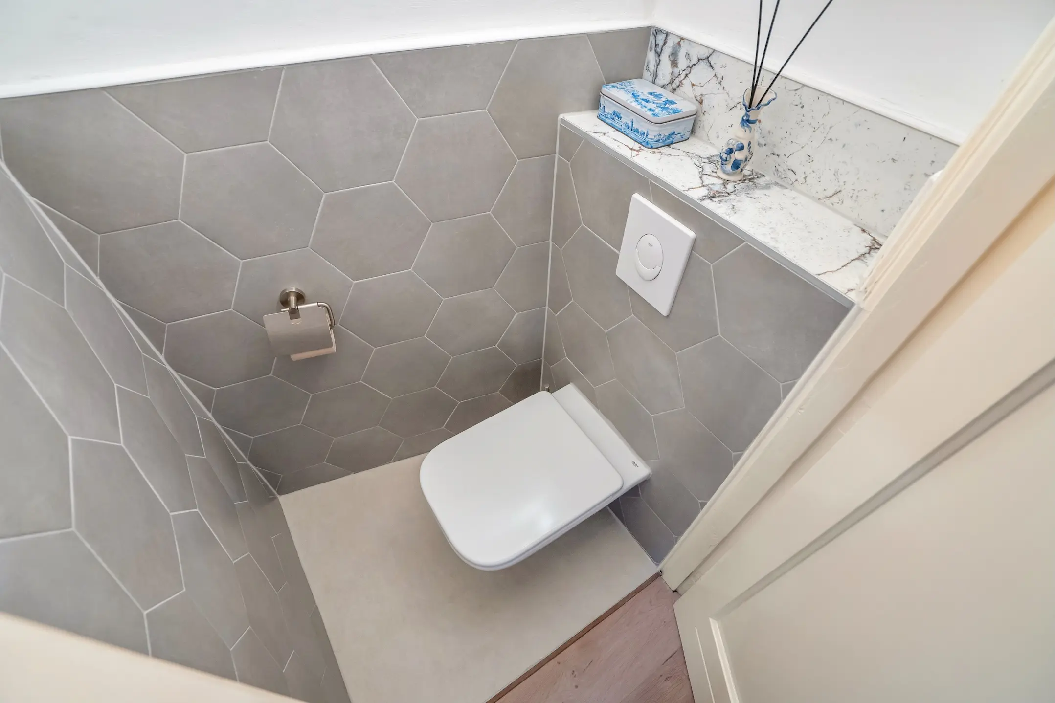 Je komt binnen in de hal met meterkast, modern toilet (2025) en een handige trapkast. Vanuit hier loop je door naar de woonruimte. De woonkamer en eetkamer staan in open verbinding en worden aan twee zijden overspoeld met daglicht door de grote ramen. De schouw zorgt voor extra sfeer en geeft de ruimte karakter.