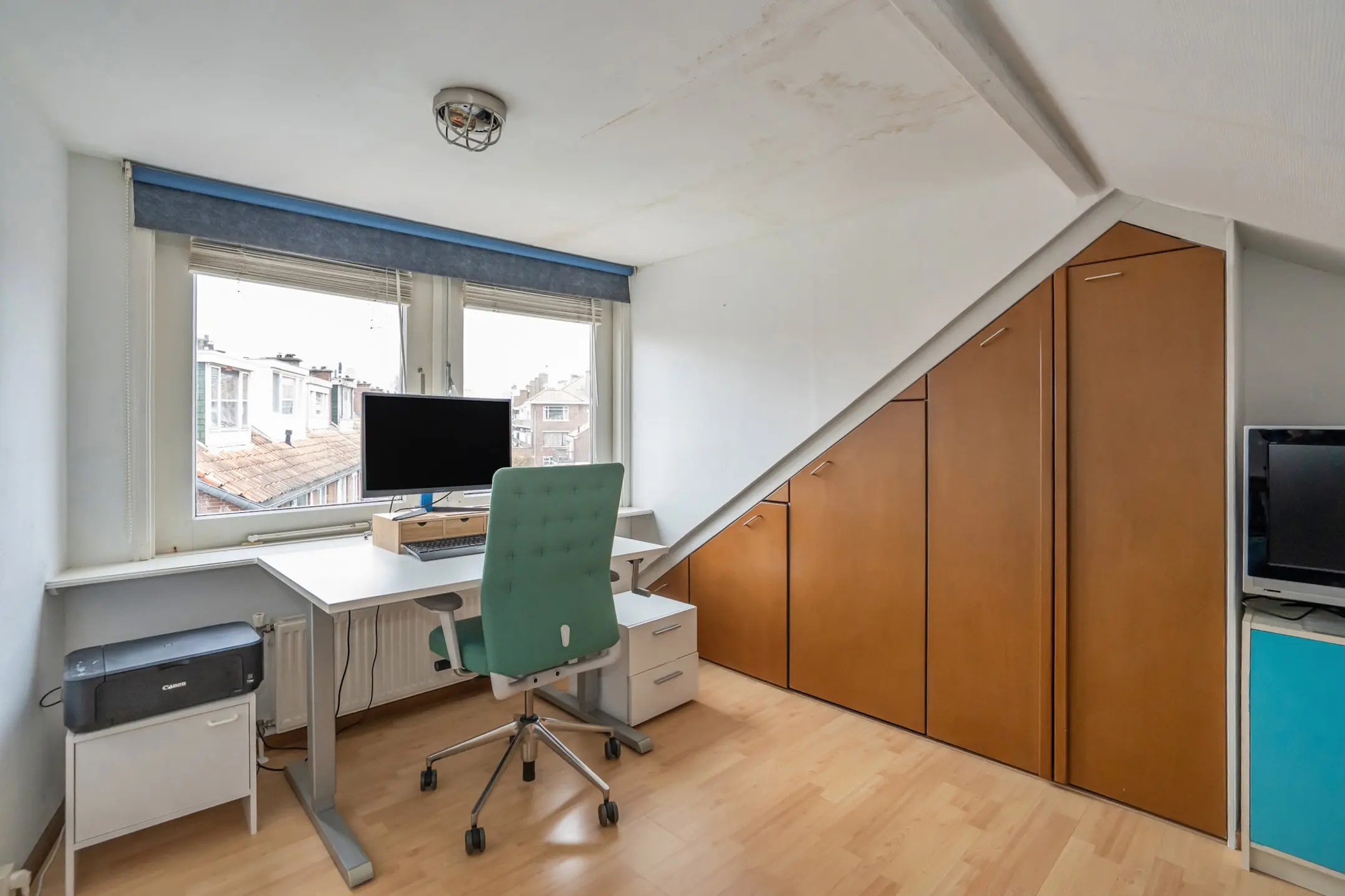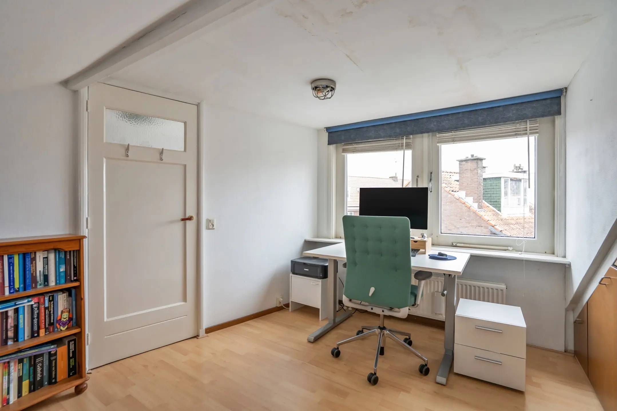 De tweede verdieping biedt nog meer ruimte. Op de overloop vind je de aansluiting voor de wasmachine, een wastafel en de opstelplaats van de cv-ketel (Intergas, 2012). De zolderkamer is ruim en licht en beschikt over veel bergruimte onder de schuine kap — een perfecte extra slaapkamer, werkruimte of hobbykamer.