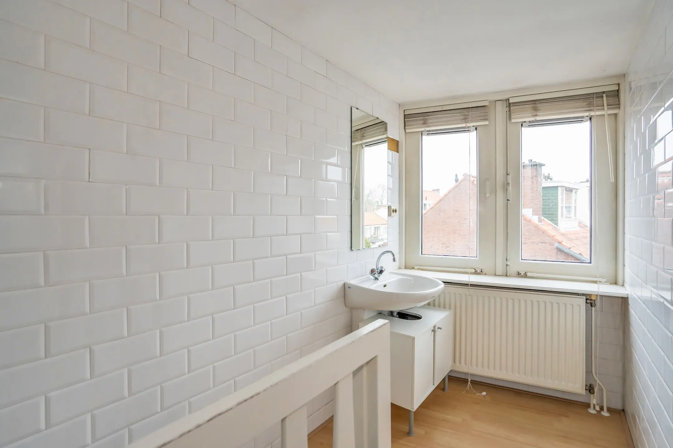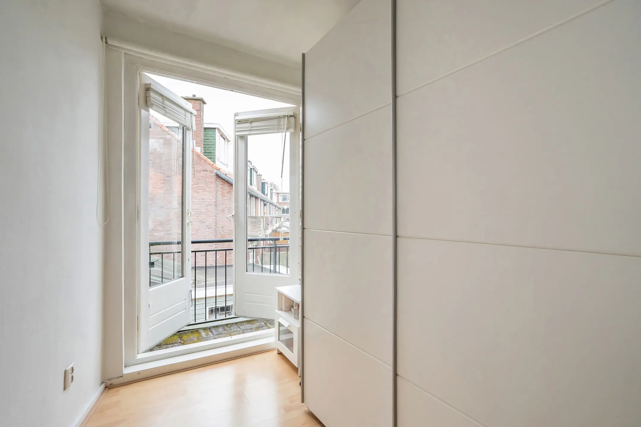 Op de eerste verdieping kom je op een ruime overloop met praktische bergruimte en openslaande deuren naar het balkon aan de achterzijde. Aan de voorzijde ligt de badkamer, voorzien van douche, wastafel en toilet. Ook bevindt zich hier een ruime slaapkamer met kastenwand. Aan de achterzijde ligt de tweede slaapkamer van goed formaat, met uitzicht op het balkon en een vaste kast.