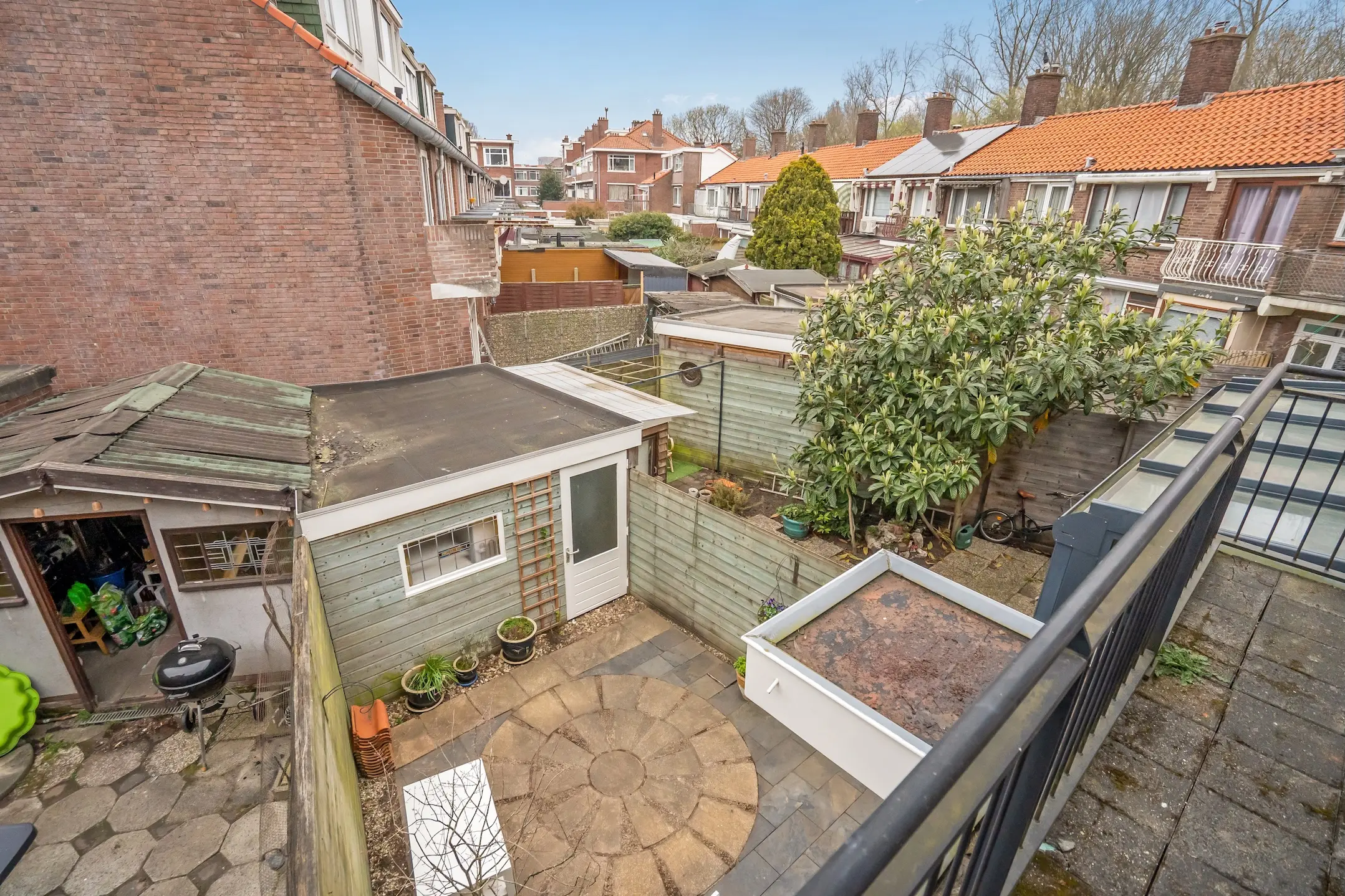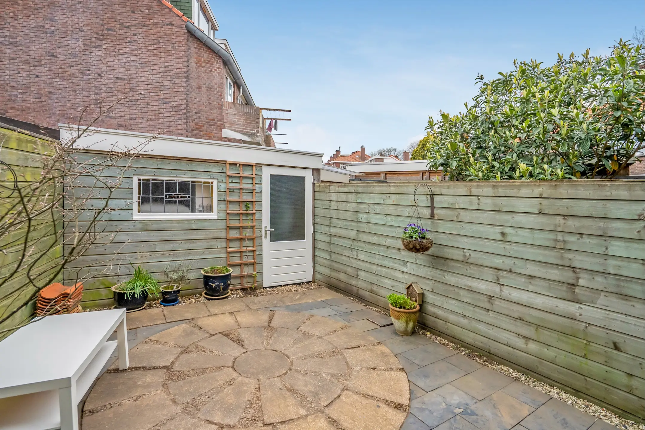 De tuin ligt op het noordwesten, waardoor je hier heerlijk van de middag- en avondzon kunt genieten. Achterin staat een houten schuur met elektra — ideaal voor fietsen, opslag of een klusruimte. Hier bevindt zich ook een achterom.
