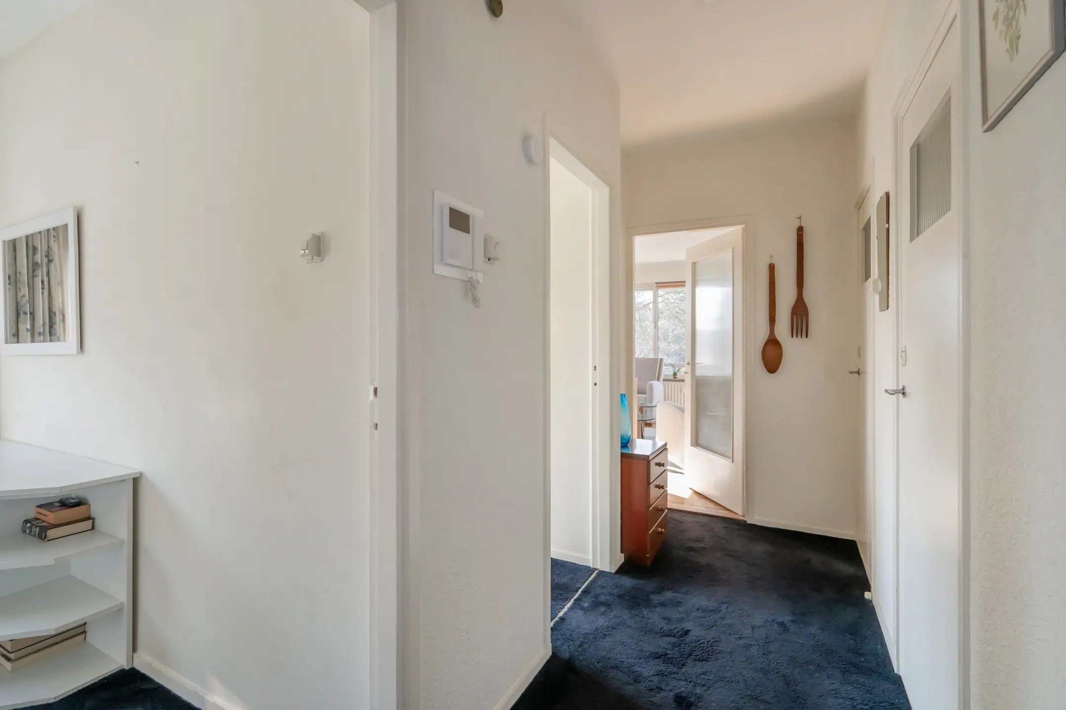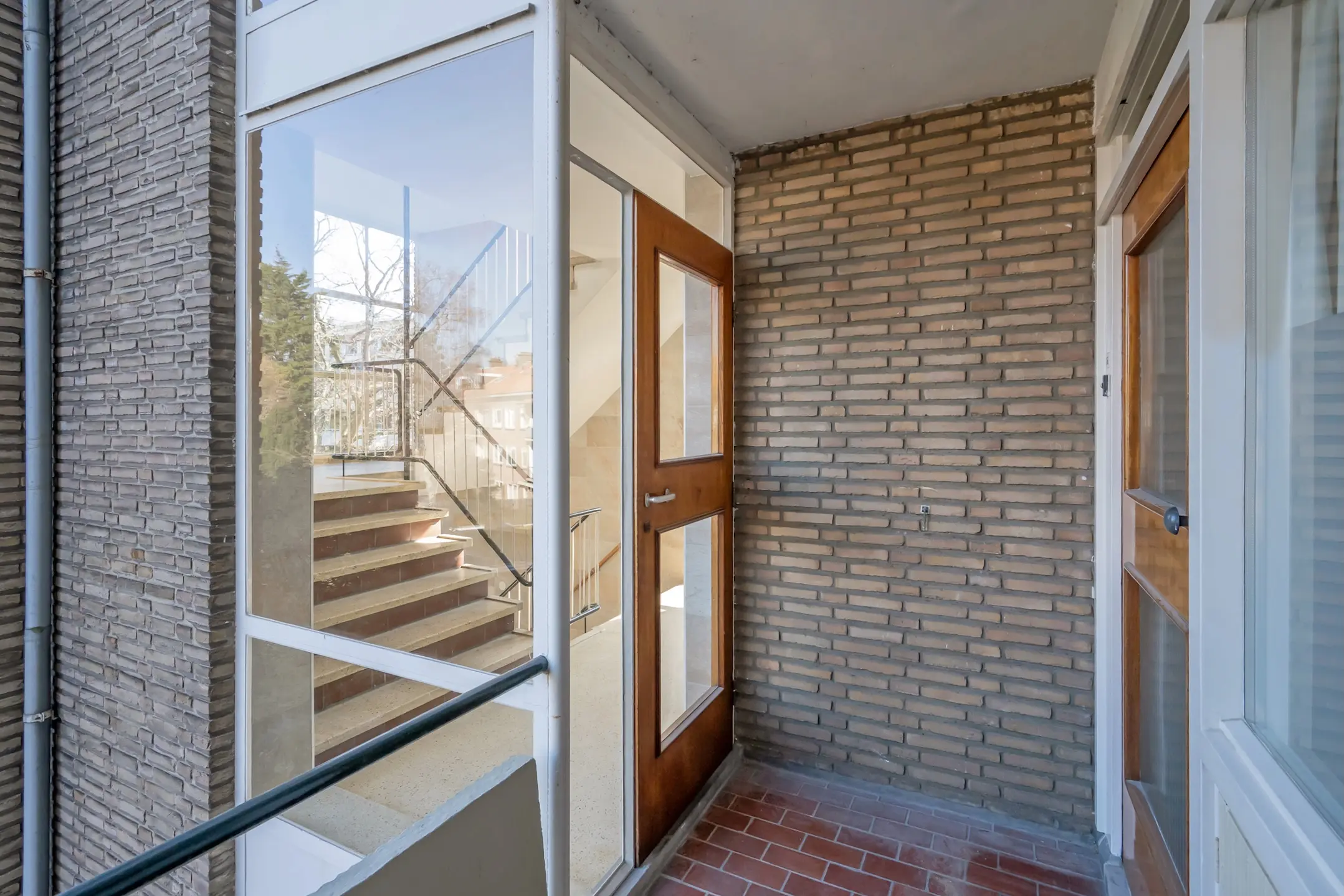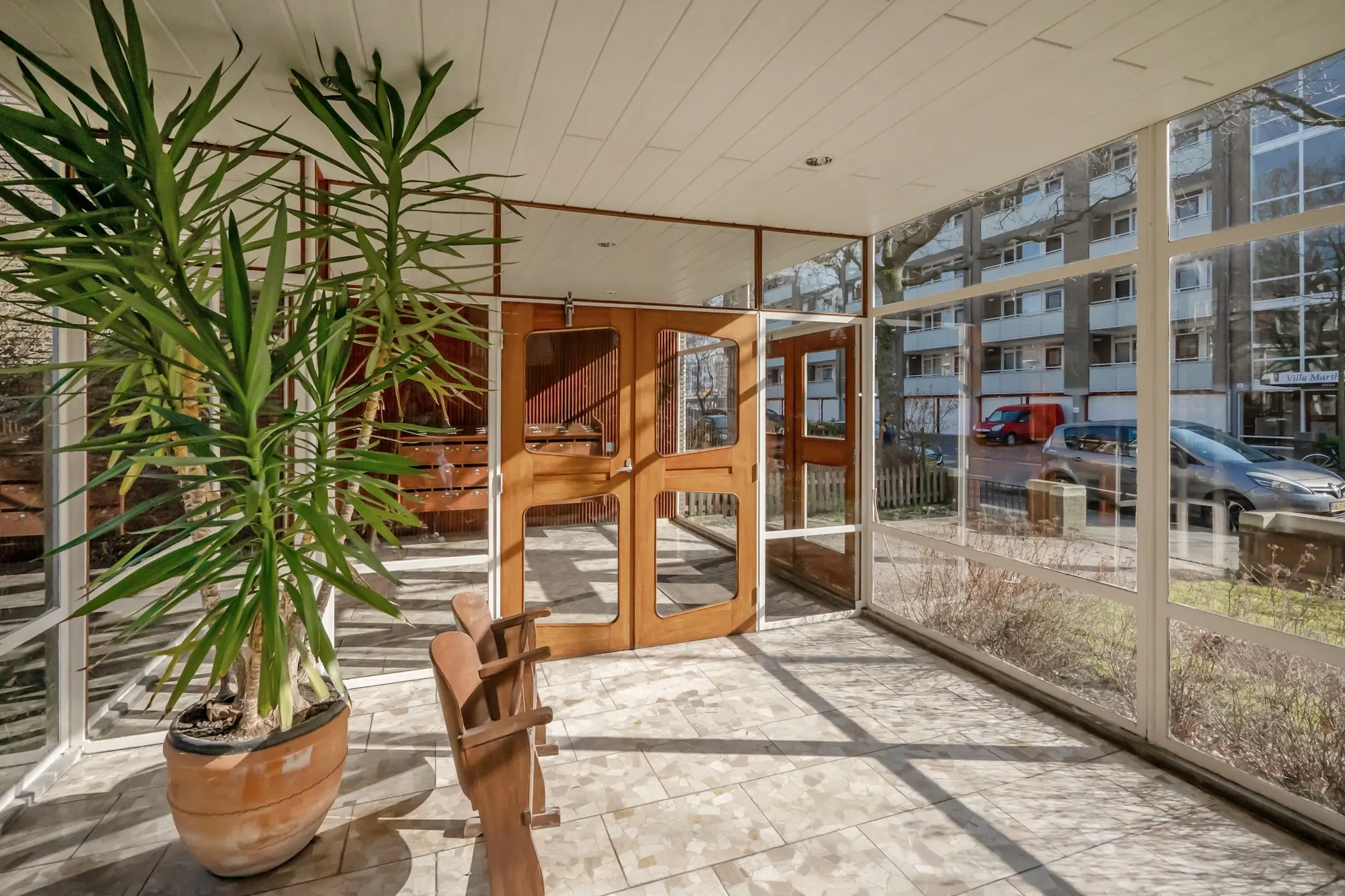 Ruime, centrale entreehal met brievenbussen en bellentableau met videofoon, lift en trappenhuis, toegang tot de woning op de tweede woonlaag, tochthalletje met garderoberuimte, hal met toegang tot alle vertrekken, heerlijk lichte L-vormige woon-/eetkamer met parketvloer en een weids uitzicht over o.a. het Huis te Hoornpark, balkon met een zonnescherm over de breedte van de woning.