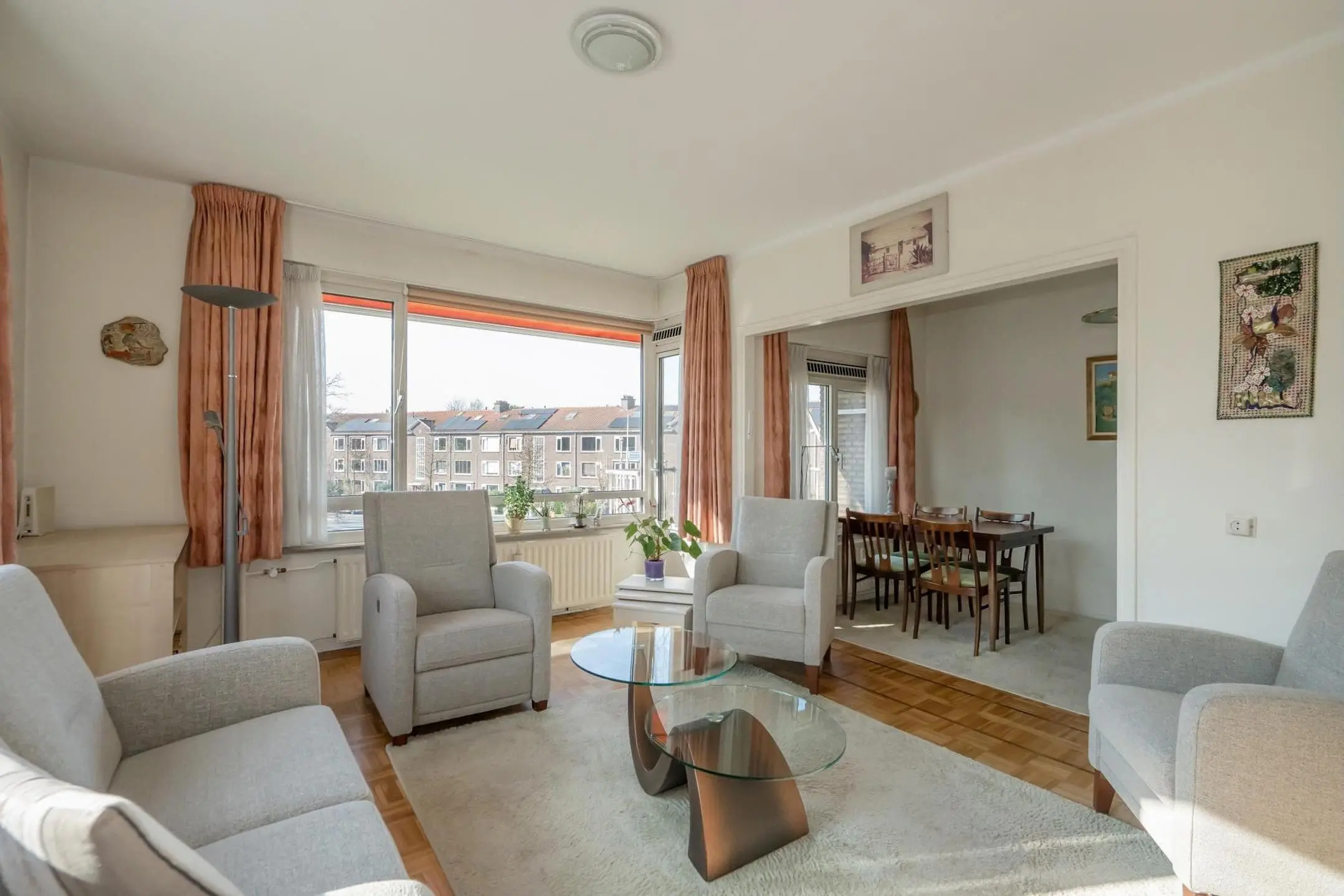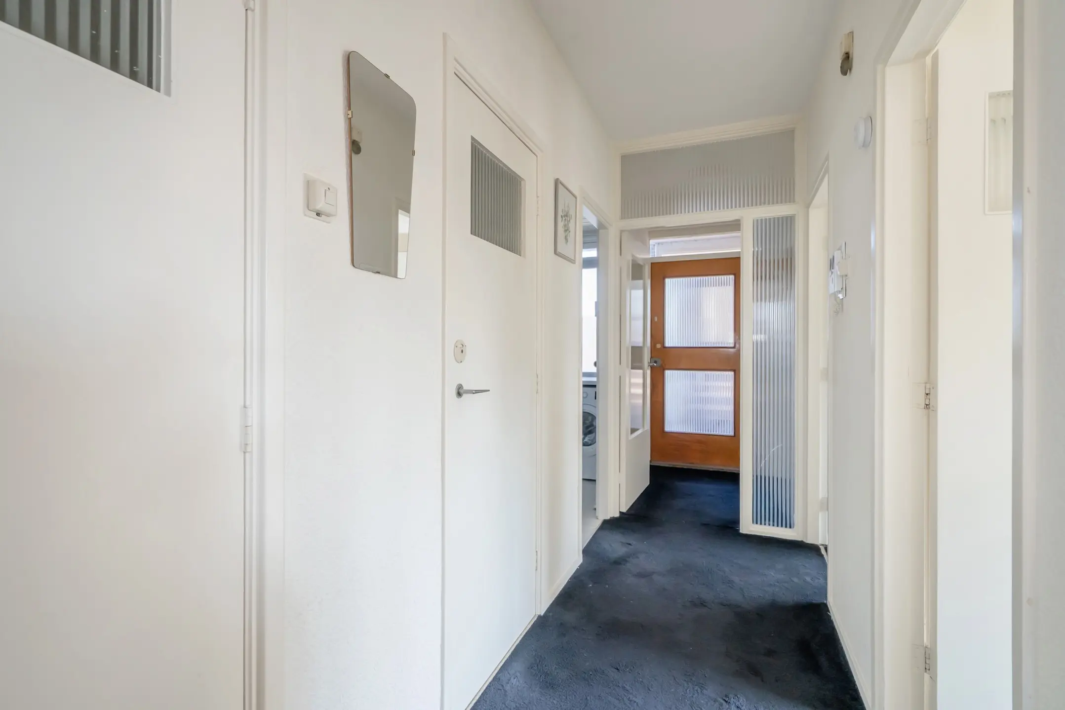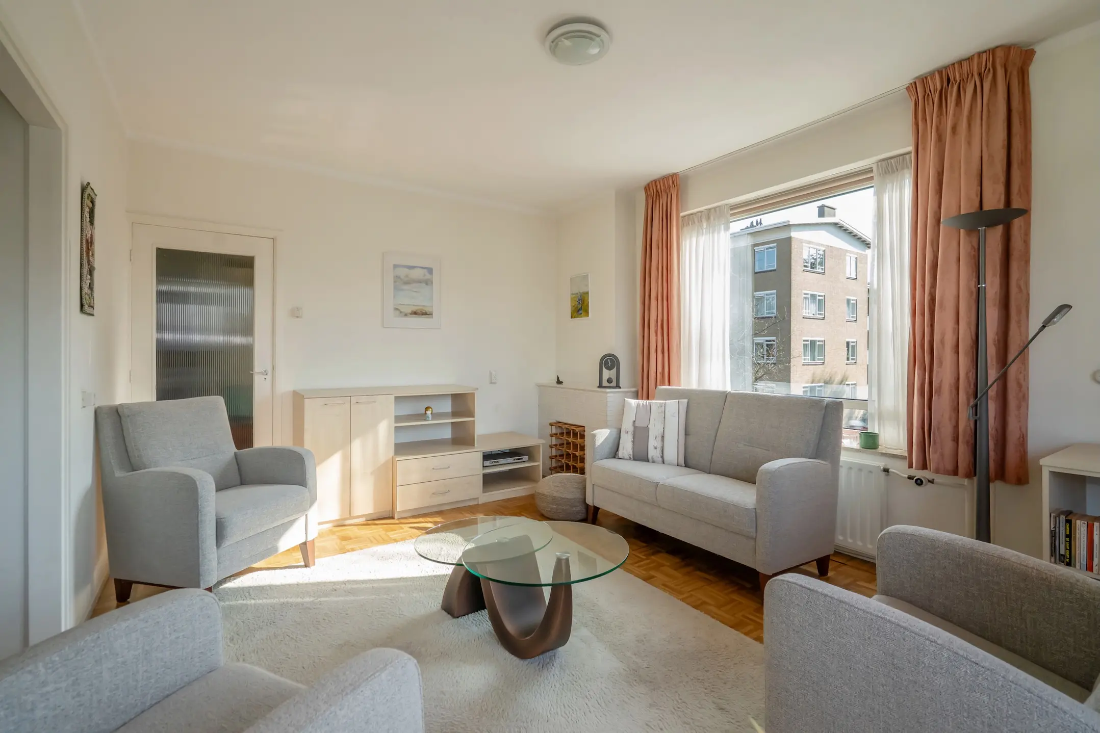 Ruime, centrale entreehal met brievenbussen en bellentableau met videofoon, lift en trappenhuis, toegang tot de woning op de tweede woonlaag, tochthalletje met garderoberuimte, hal met toegang tot alle vertrekken, heerlijk lichte L-vormige woon-/eetkamer met parketvloer en een weids uitzicht over o.a. het Huis te Hoornpark, balkon met een zonnescherm over de breedte van de woning.