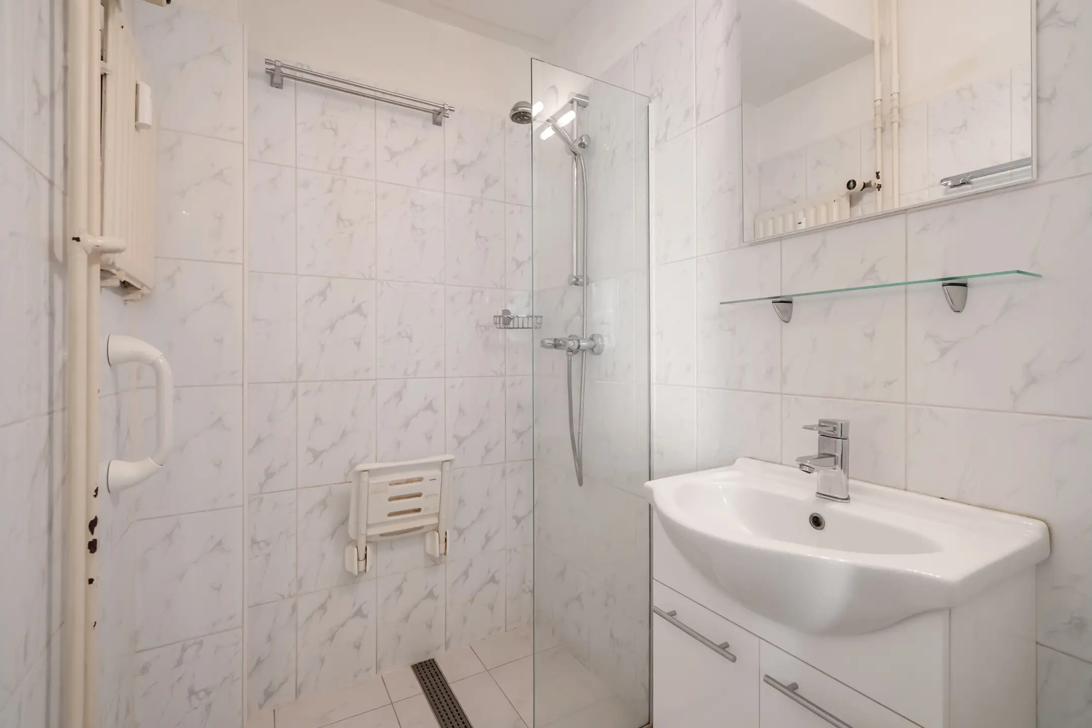 Lichtkleurig betegelde badkamer met douchegelegenheid en een wastafelmeubel.