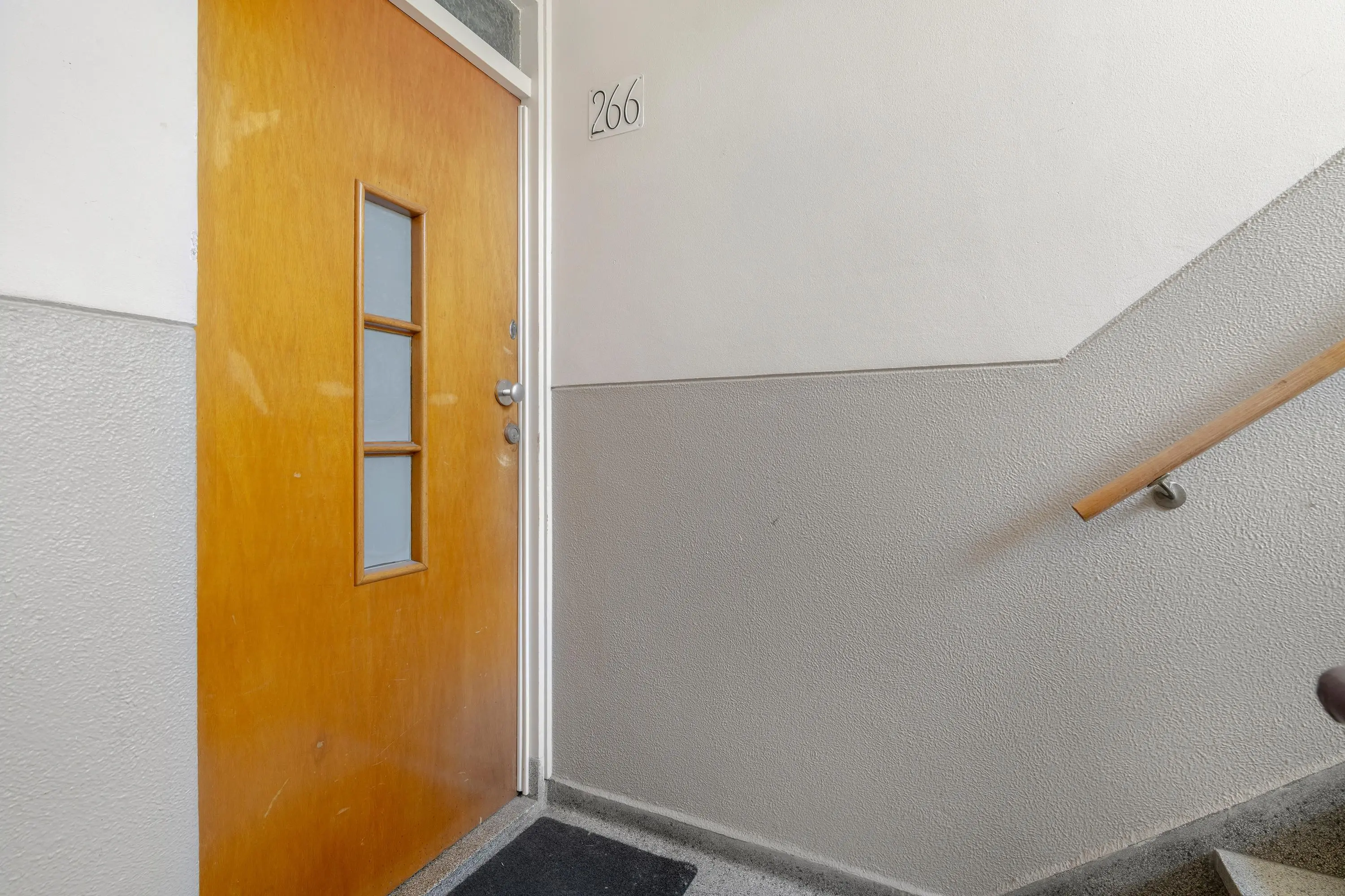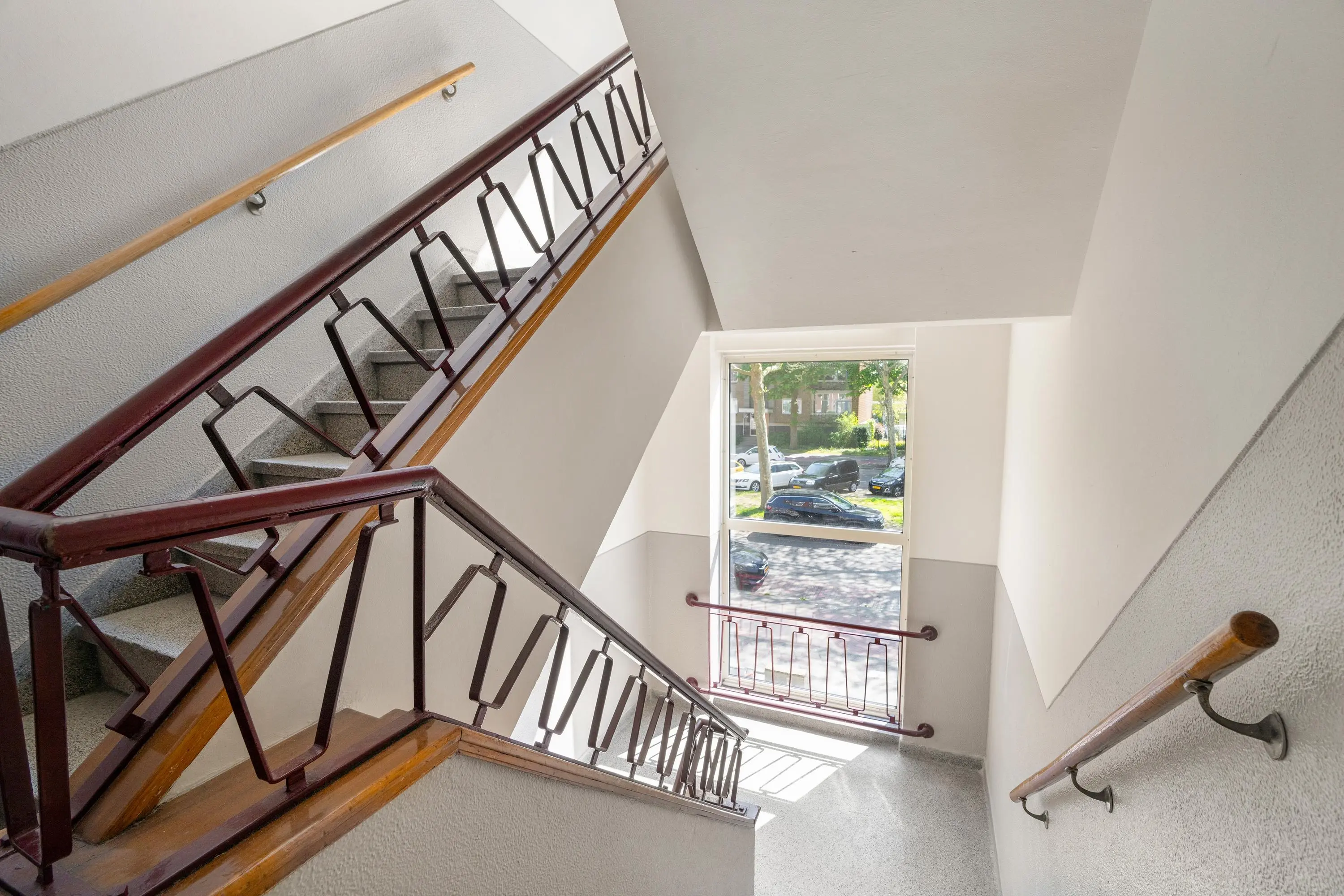 Afgesloten hoofdentree met bellentableau en postboxen, trappenhuis, toegang tot de woning op de tweede woonlaag.