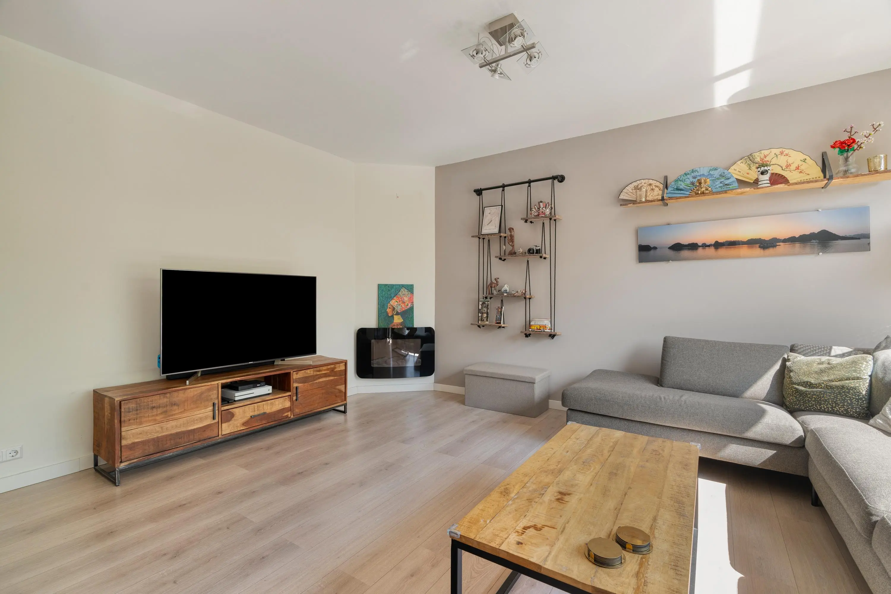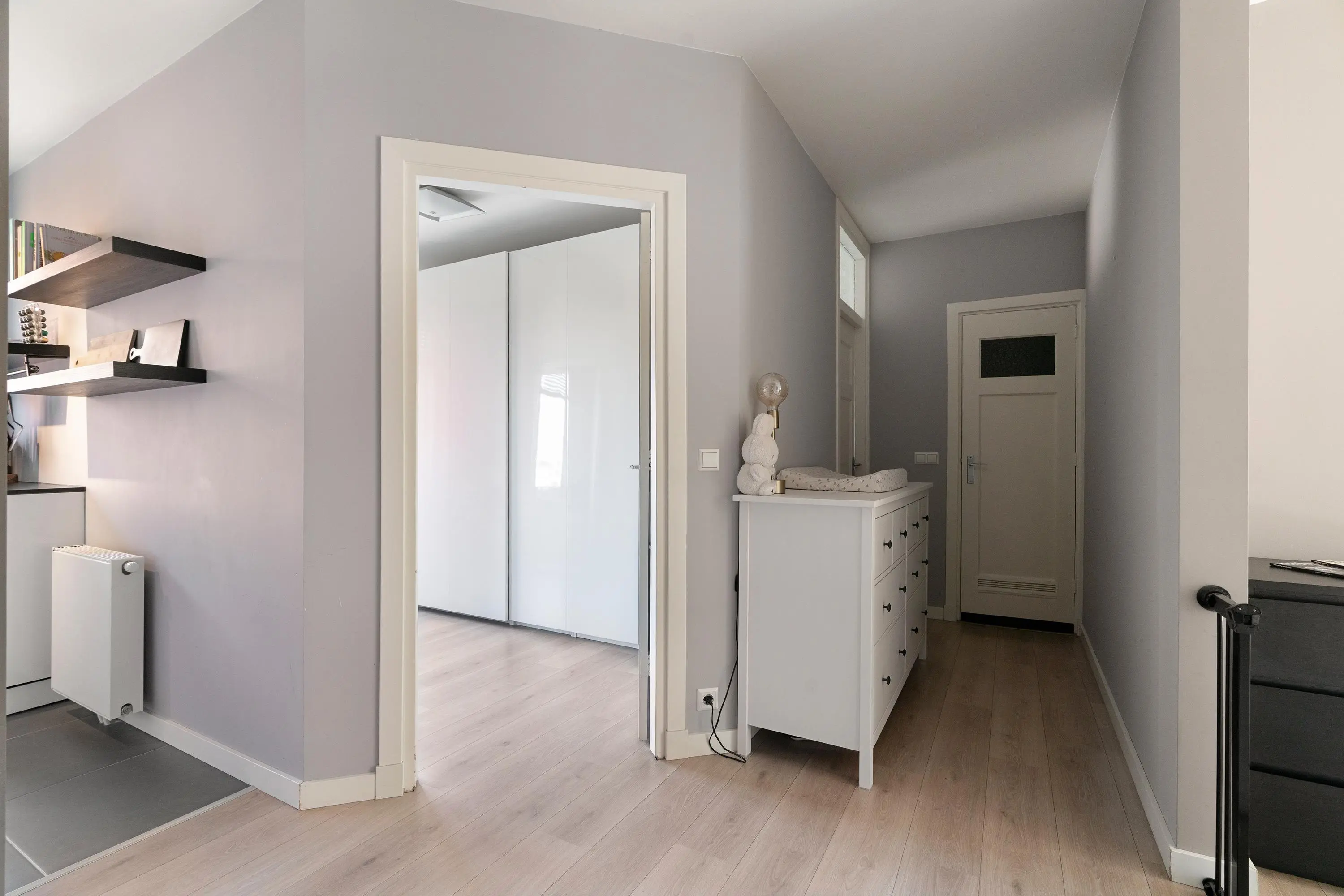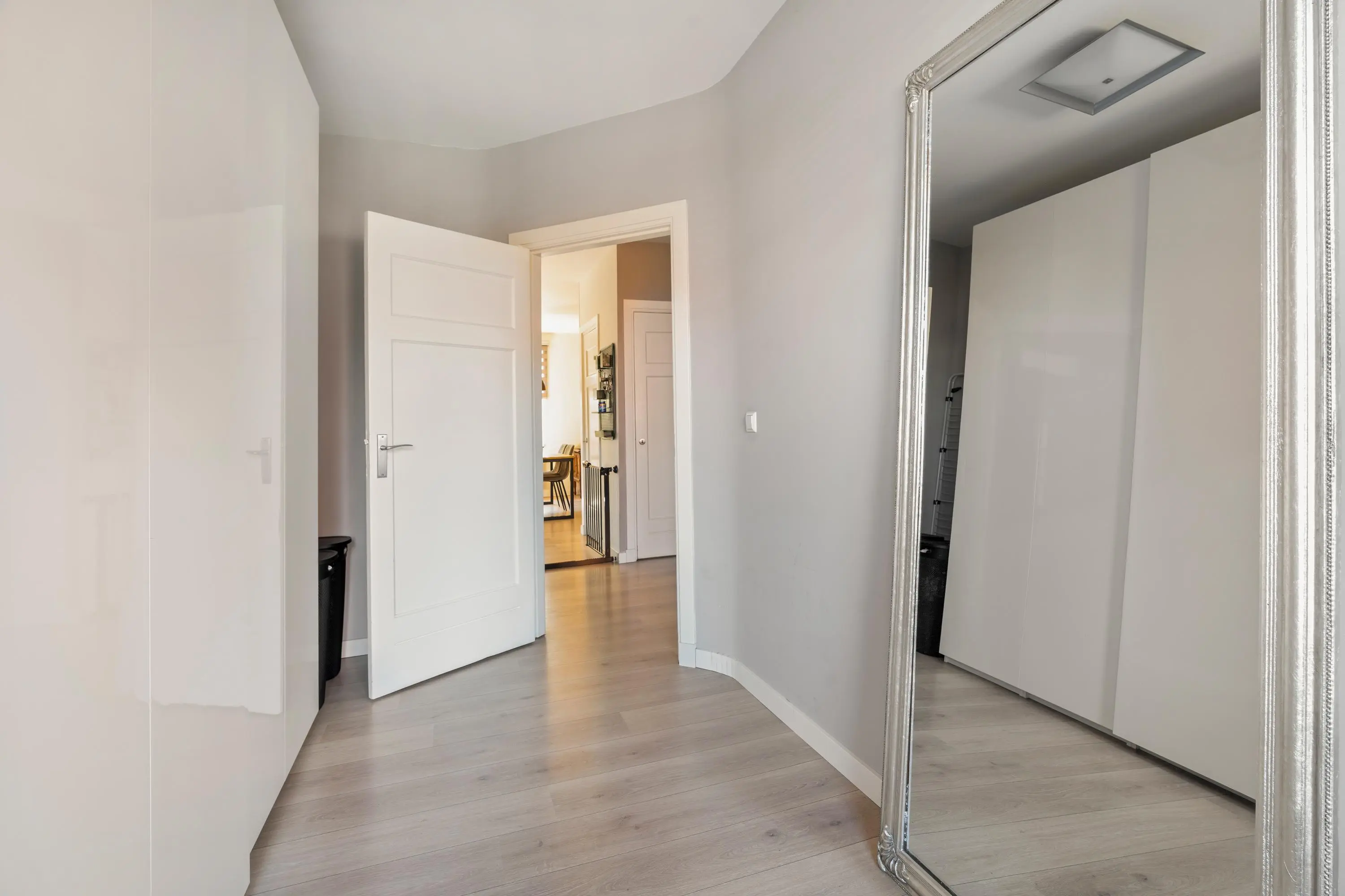 Zeer ruime hal met toegang tot alle vertrekken. Vaste kast met een vernieuwde groepenkast. Aan de voorzijde ligt de woonkamer over de volledige breedte van de woning, dit waren oorspronkelijk twee kamers. Grote ramen met weids uitzicht, vaste kast. Mooie kleurcombinatie van de wanden en de eigentijdse vloer!