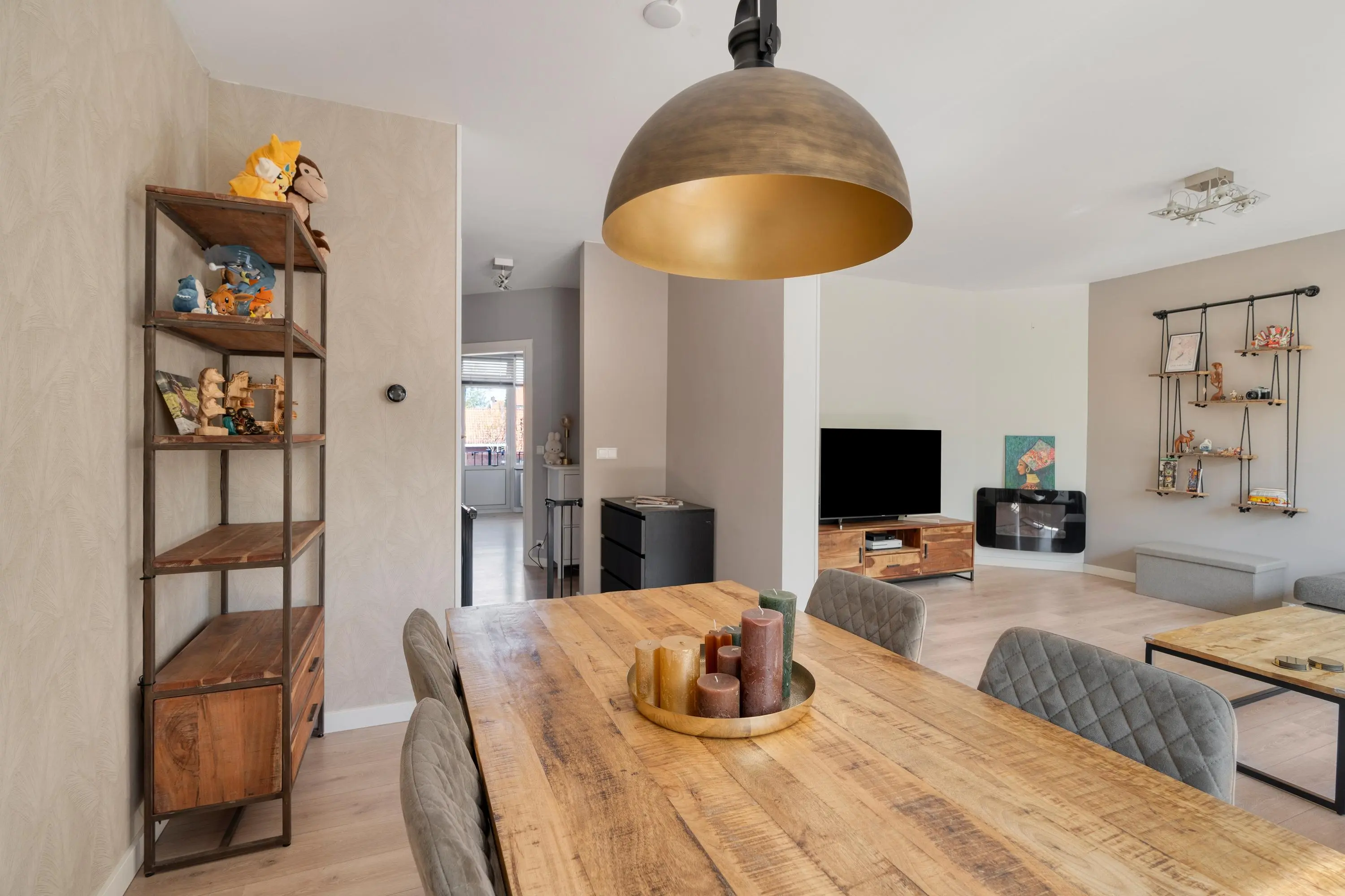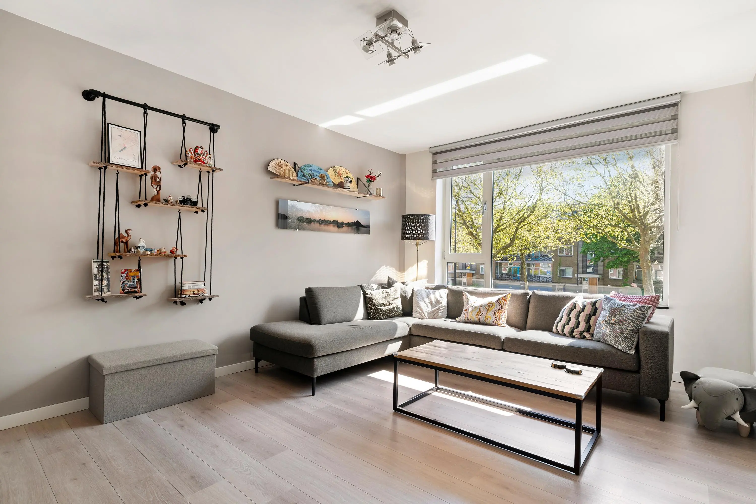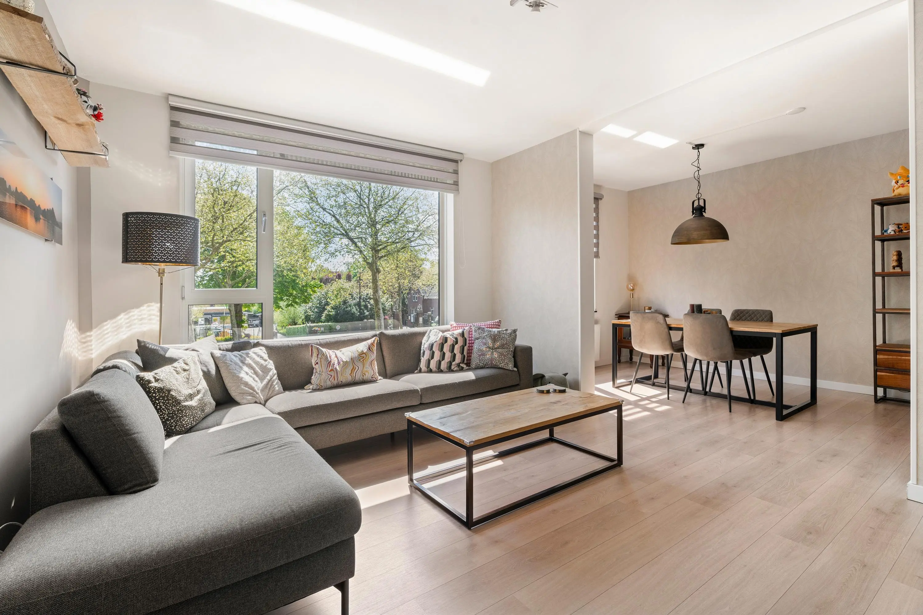 Zeer ruime hal met toegang tot alle vertrekken. Vaste kast met een vernieuwde groepenkast. Aan de voorzijde ligt de woonkamer over de volledige breedte van de woning, dit waren oorspronkelijk twee kamers. Grote ramen met weids uitzicht, vaste kast. Mooie kleurcombinatie van de wanden en de eigentijdse vloer!