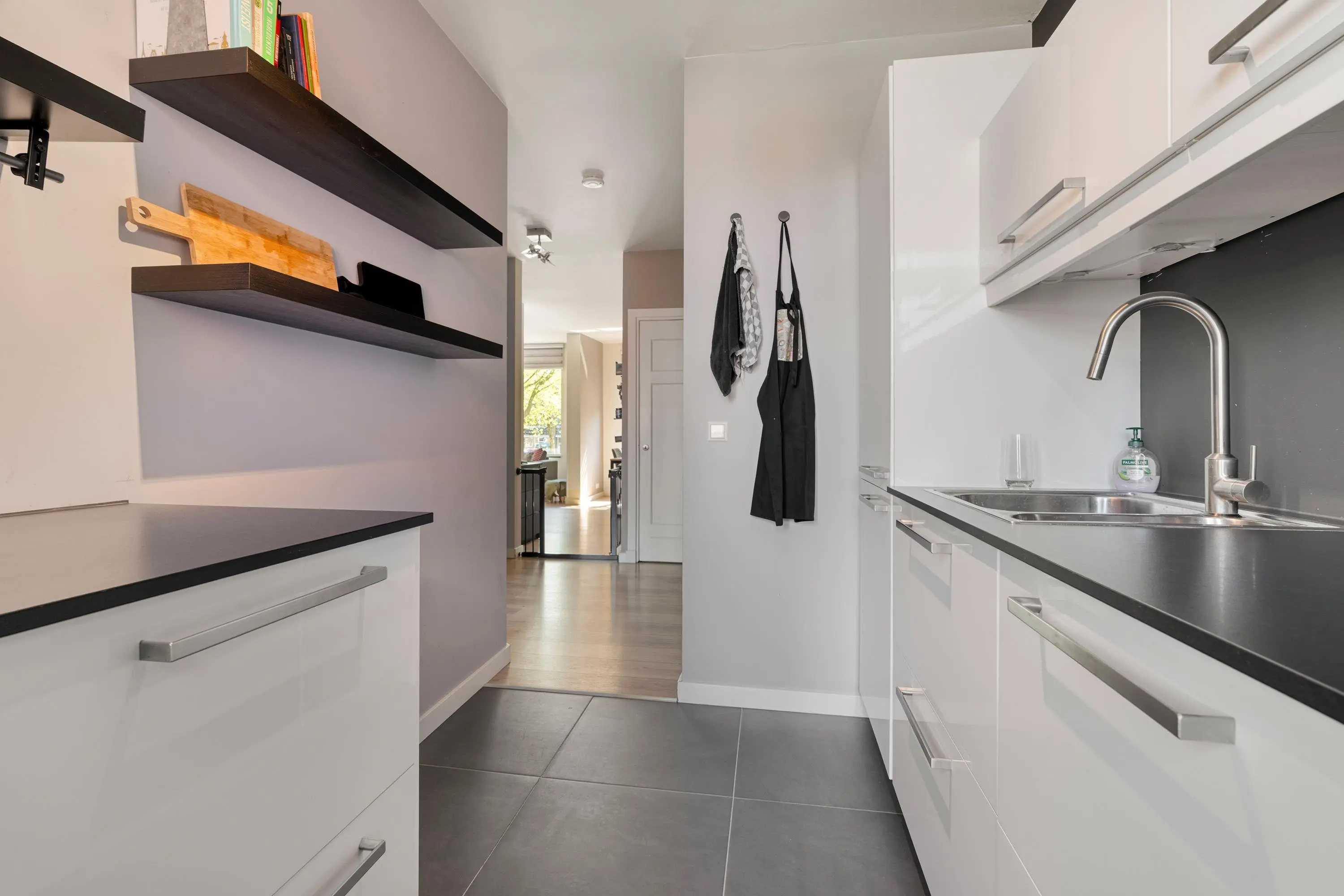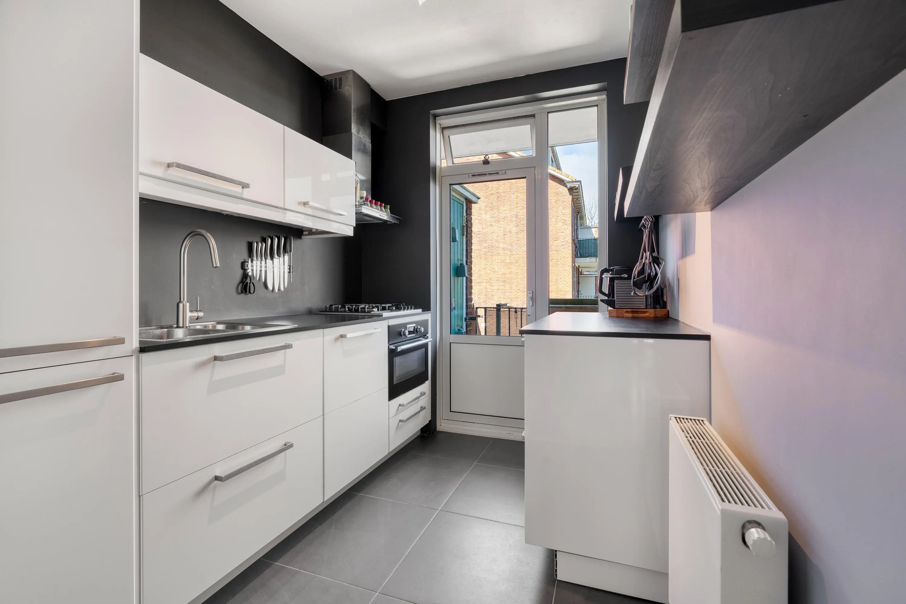Modern uitgevoerde keuken met een witte keukeninrichting met een zwart werkblad, inbouw koel-/vriescombinatie, vaatwasser, gaskookplaat met 4 branders en een combi oven. Vanaf de keuken toegang tot het balkon aan de achterzijde (noordwest ligging, late middag- en avondzon). In de balkonkast staat de Nefit cv-combi ketel opgesteld.