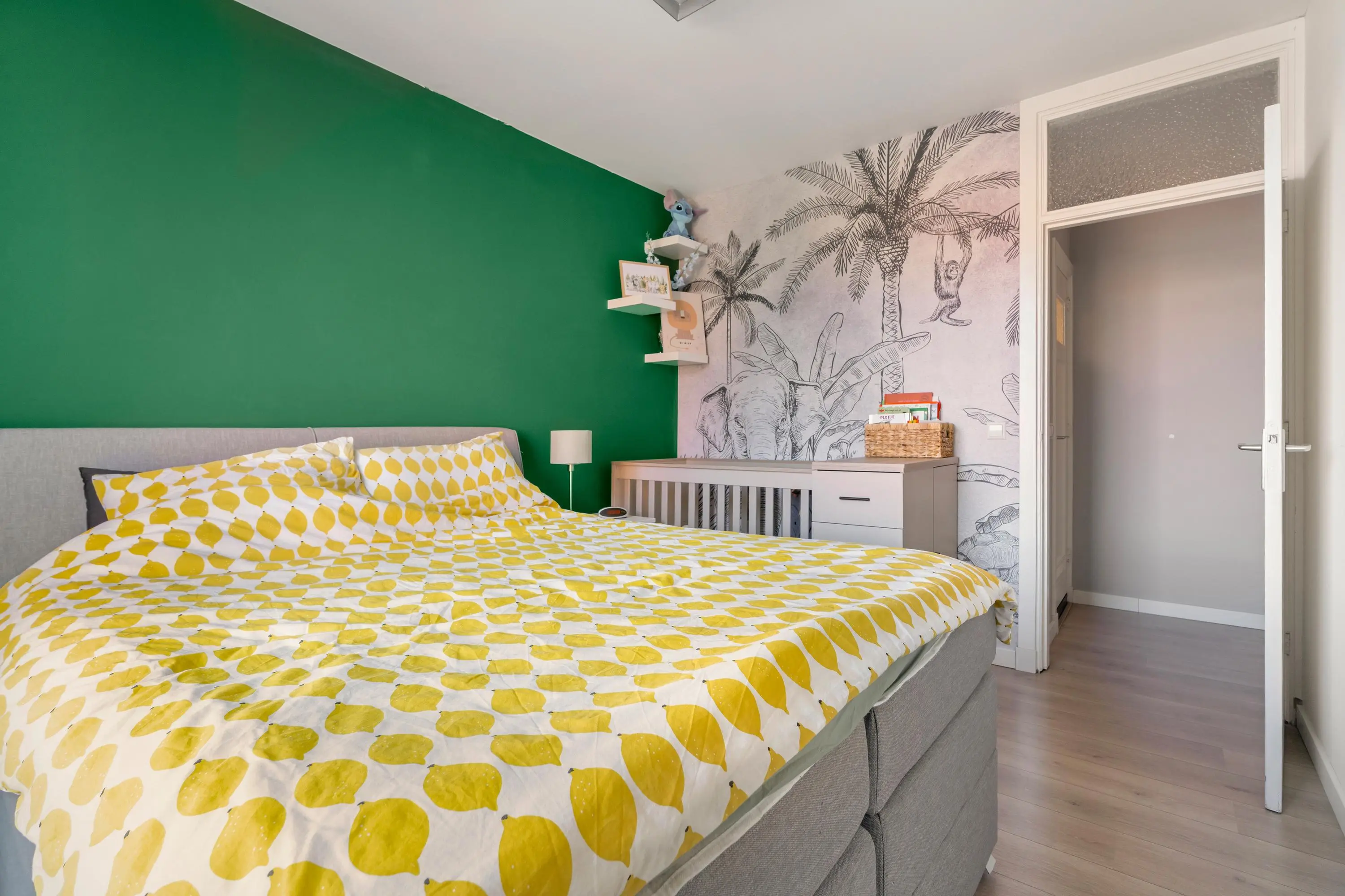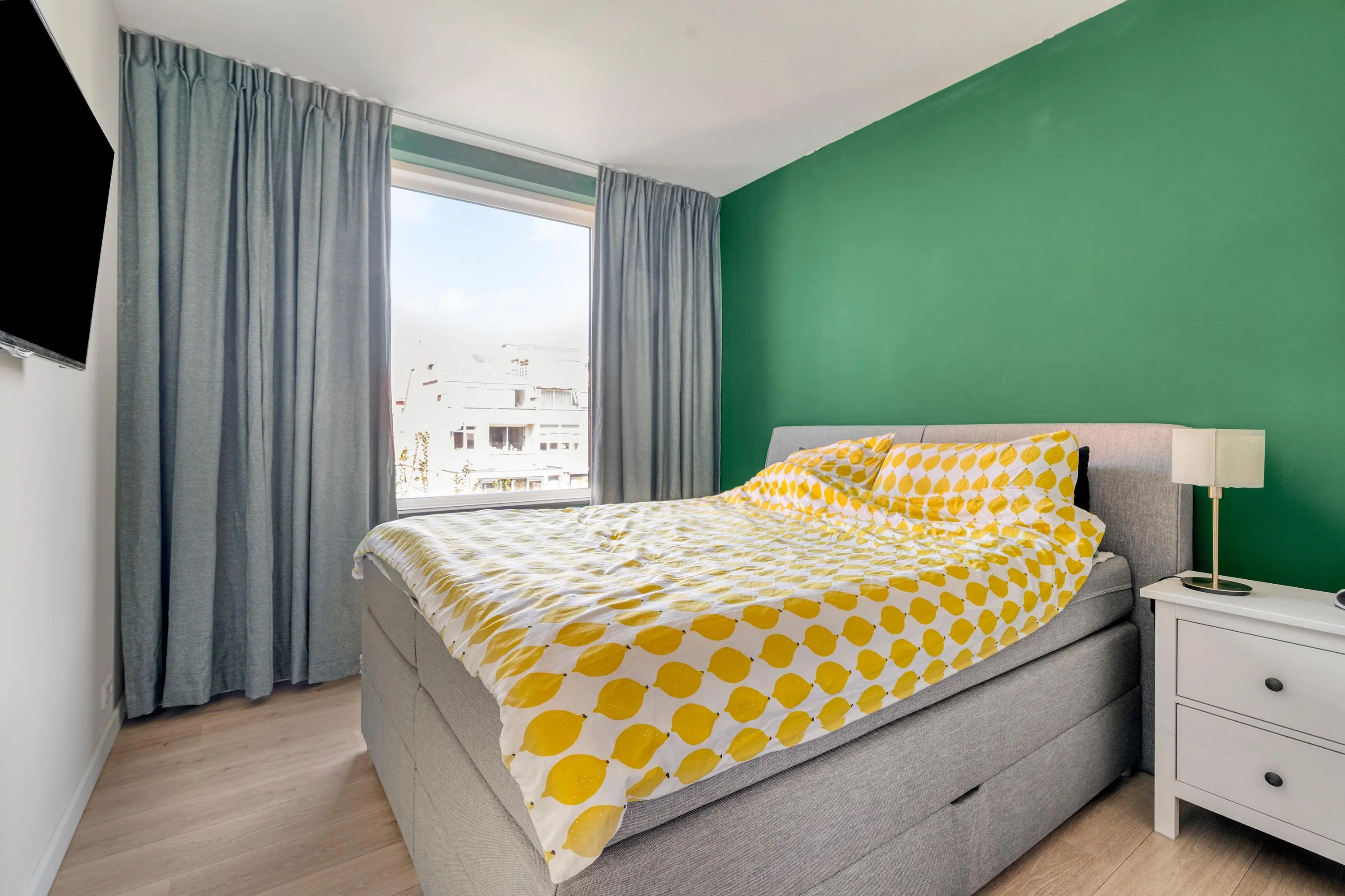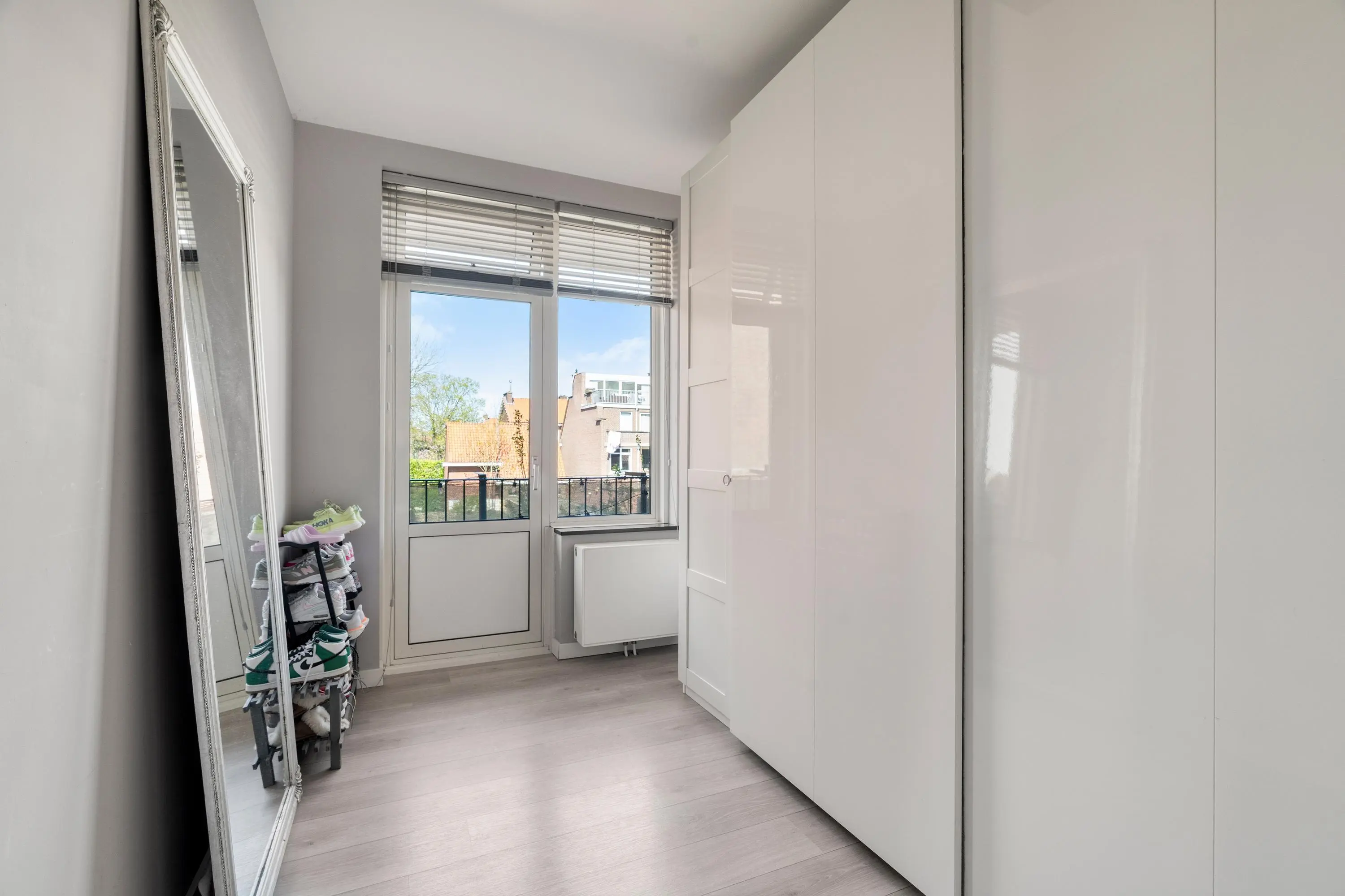 Aan de achterzijde bevinden zich de slaapkamers, de hoofdslaapkamer is riant en een tweede slaapkamer is ideaal om als kantoor of logeerkamer te gebruiken. Deze kamer heeft een deur naar het balkon.