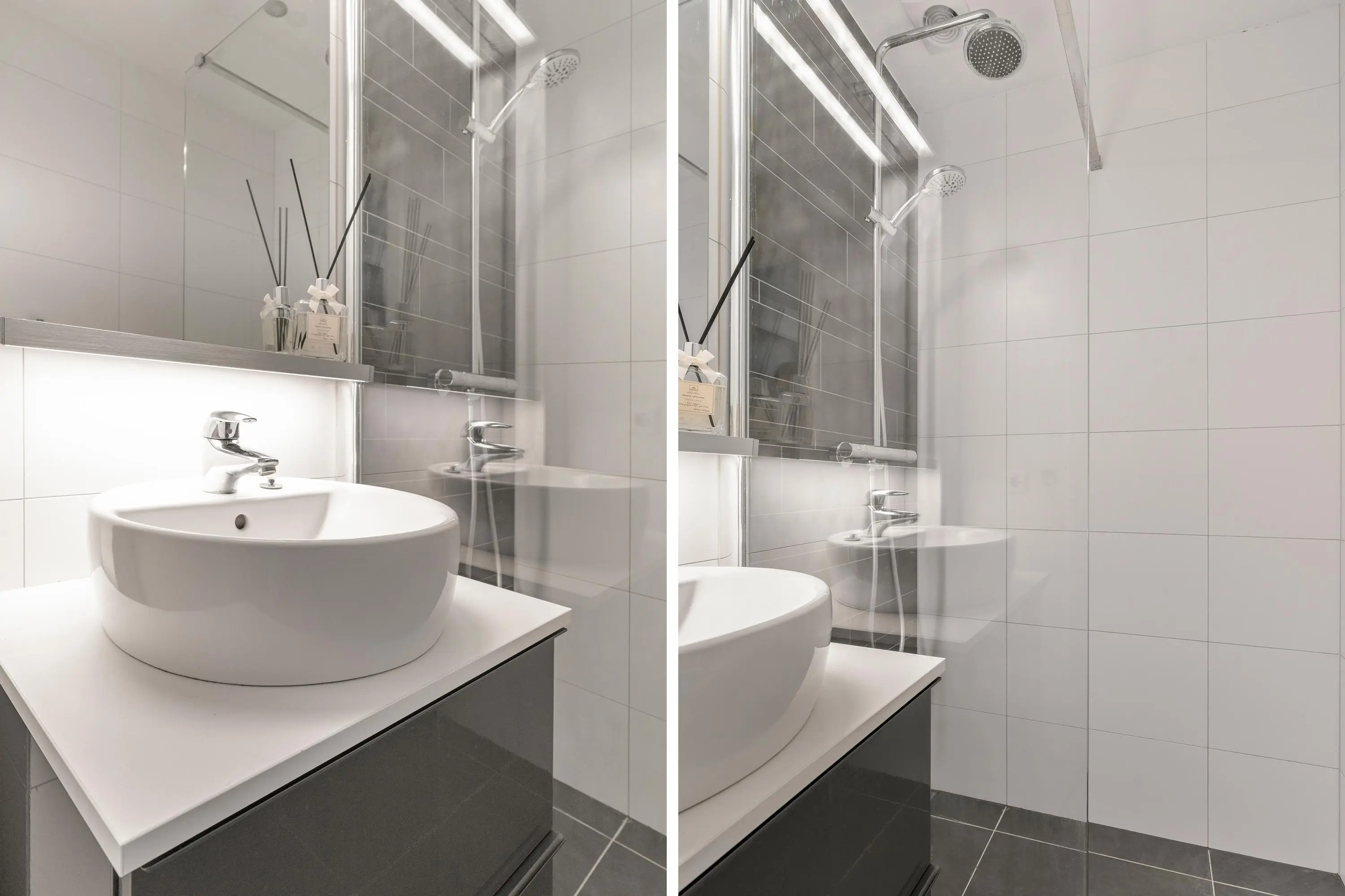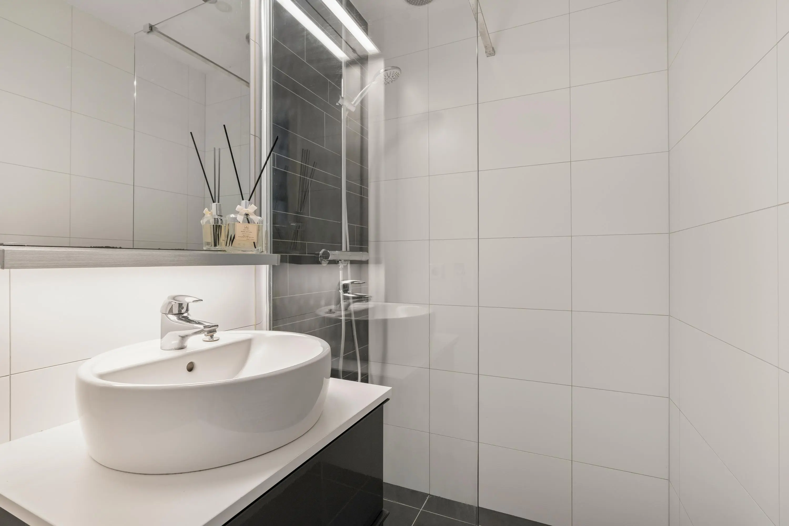 Moderne badkamer uitgevoerd met witte wandtegels en donkergrijze vloertegels, douchegelegenheid met een hardglazen spatscherm en een Rainshower, handdoekenradiator en een wastafelmeubel met een bijpassende spiegel.