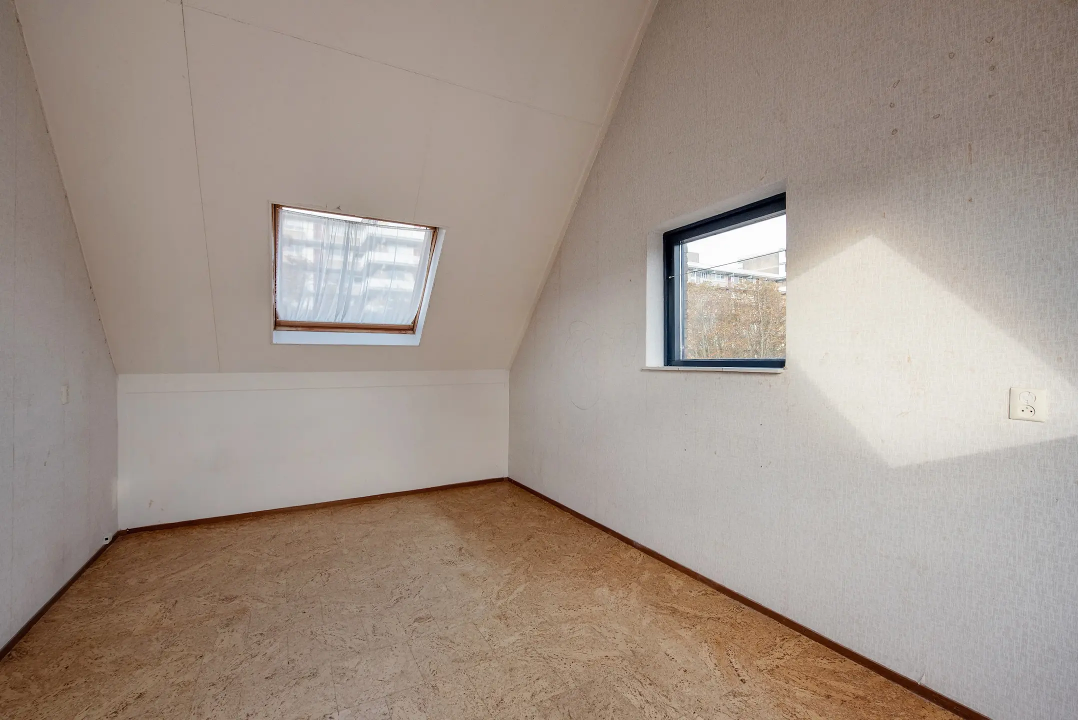 Ruime, hoekgelegen slaapkamer met twee dakramen en een raam in de zijgevel.