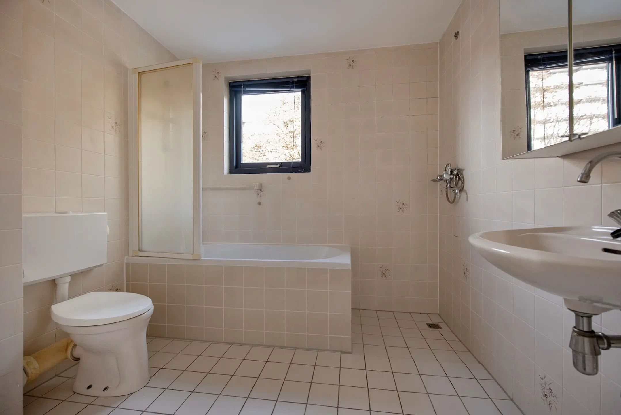 Badkamer met ligbad met douche en een aparte inloopdouche, wastafel, 2e toilet en de aansluiting van de wasmachine.