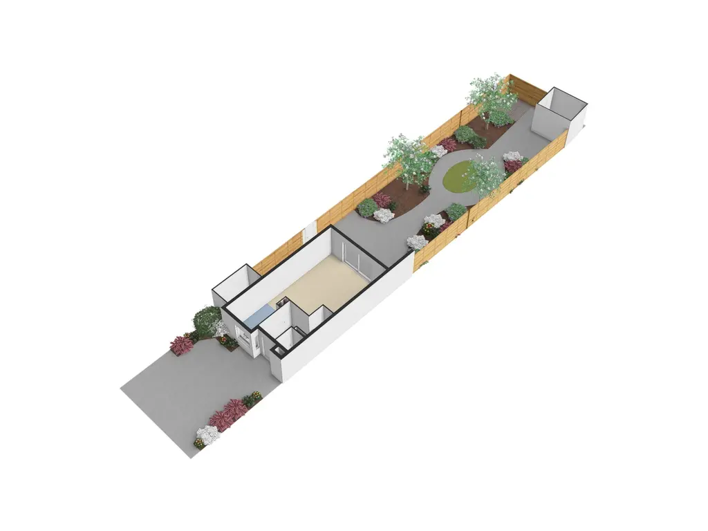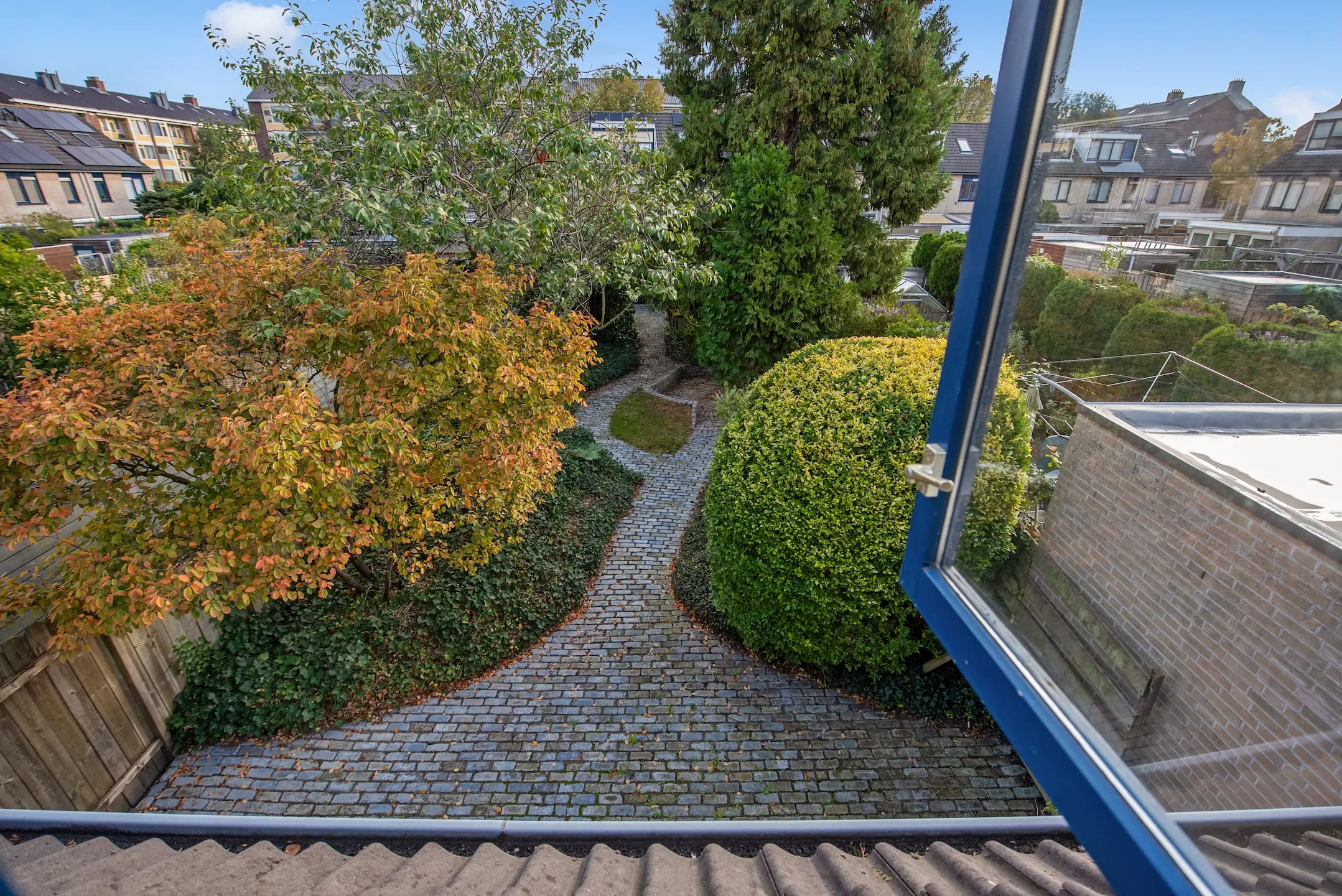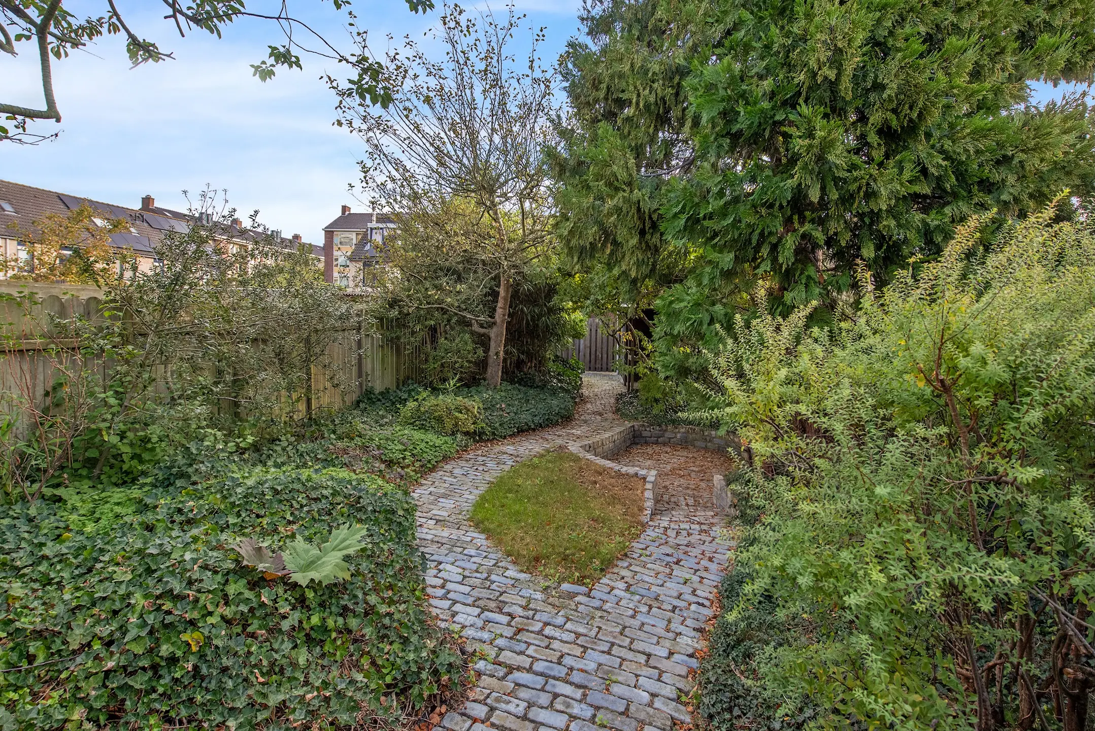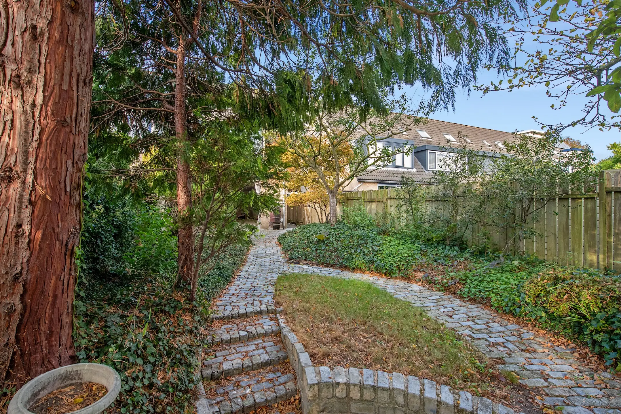 Fantastische, parkachtig aangelegde achtertuin (De tuin werd in 1992 ontworpen en daarna aangelegd door het hoveniersbedrijf Pierre Jacobs) met een wandelpad naar de houten berging alsmede een verdiept zitgedeelte en een discrete rustplek in de vorm van een hardhouten overdekt terrasje. De paden en de zitgedeelte werden gemaakt van 80m2 scoriabricks, een blauwgrijze baksteen.