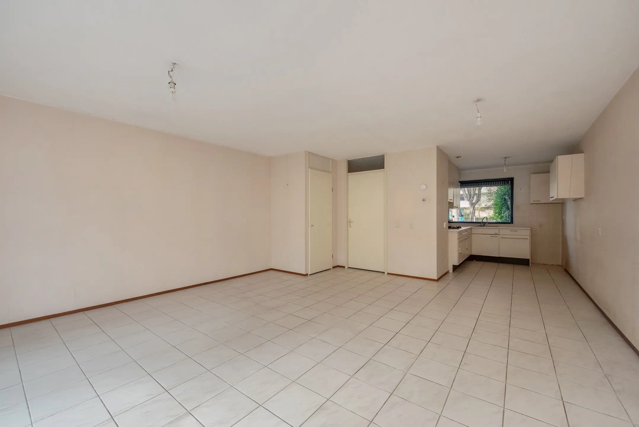 Voortuin met parkeergelegenheid voor 2 auto's, entree woning, ruime hal met een toilet voorzien van een fonteintje, tuingerichte woonkamer met een anti inbraak schuifpui, kastruimte onder de trap en een open keuken aan de voorzijde met een keukeninrichting in een hoekopstelling. Door het grote raam veel licht!