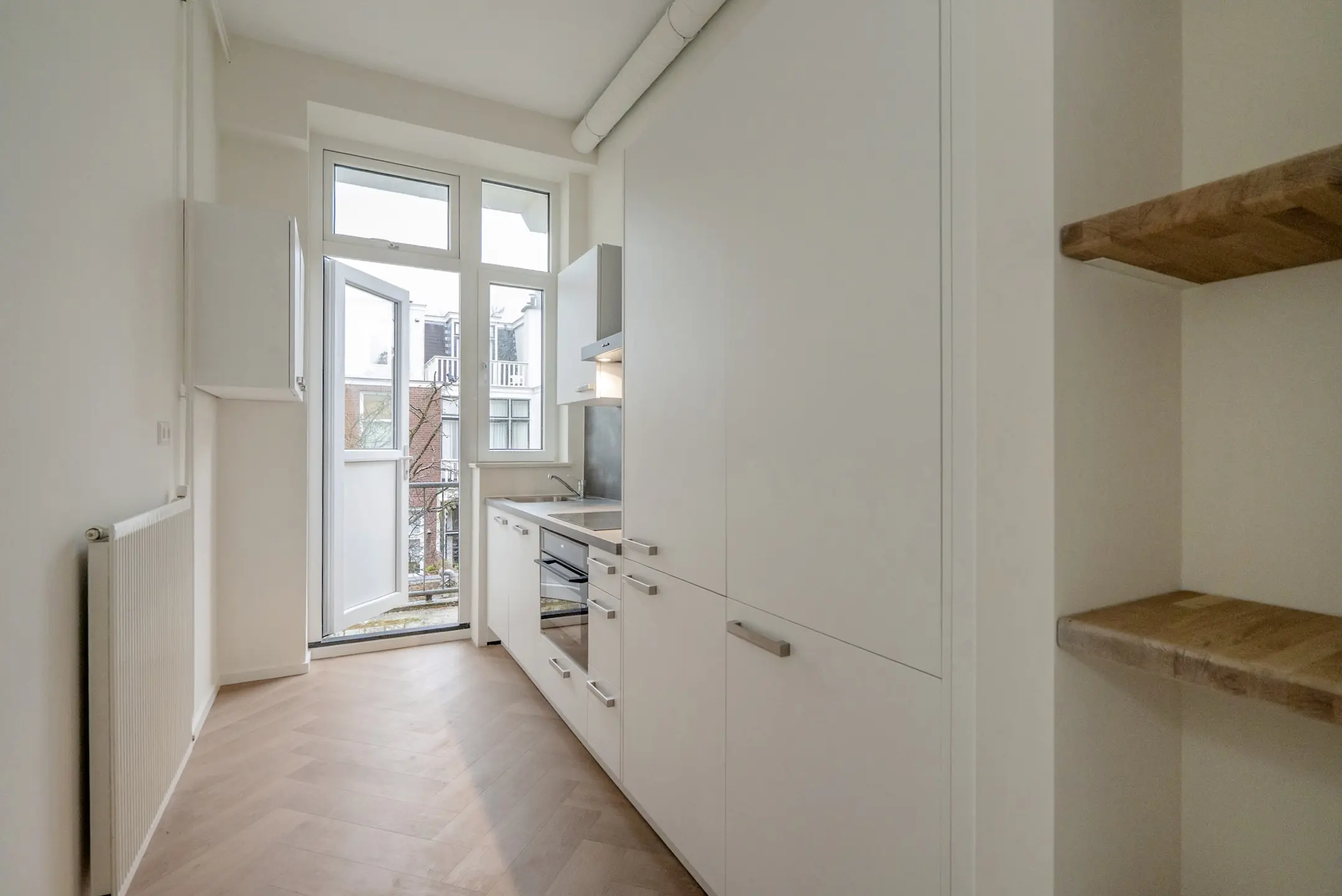 Via de entree op de eerste verdieping stapt u binnen in de ruime en lichte woonkamer met karakteristieke erker en grote raampartijen. De aan de achterzijde gelegen nieuwe keuken is uitgevoerd in een moderne opstelling en voorzien van alle gebruikelijke inbouwapparatuur. Vanuit de keuken is toegang tot het balkon op de ochtendzon.
