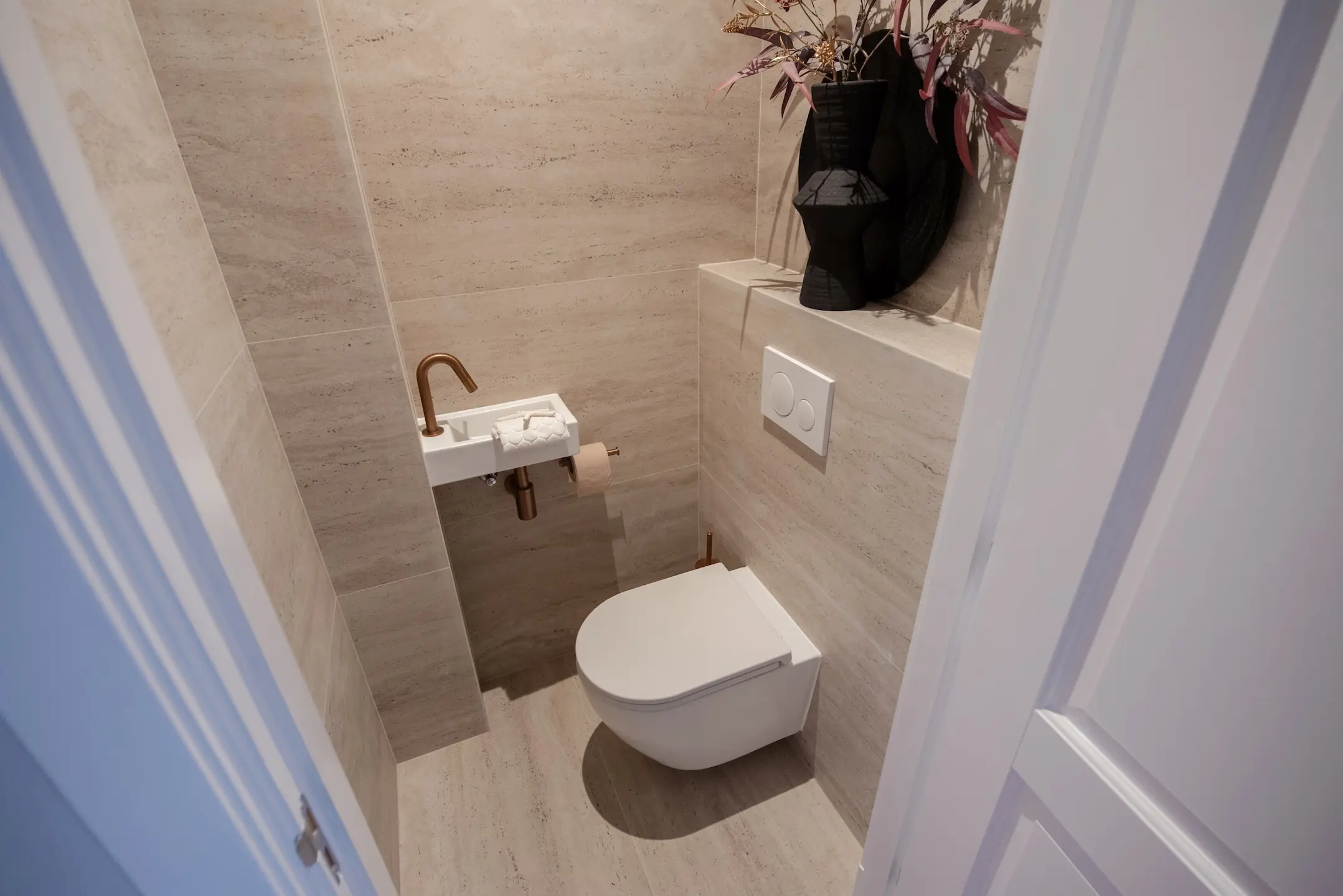 Bij binnenkomst van het appartement betreed je de ruime hal. Hier bevinden zich het zwevende toilet met fontein en inbouwspots, evenals een praktische wasruimte met opstelplaats voor wasmachine en droger. De vernieuwde cv-ketel (Remeha, 2025) is eveneens keurig weggewerkt.