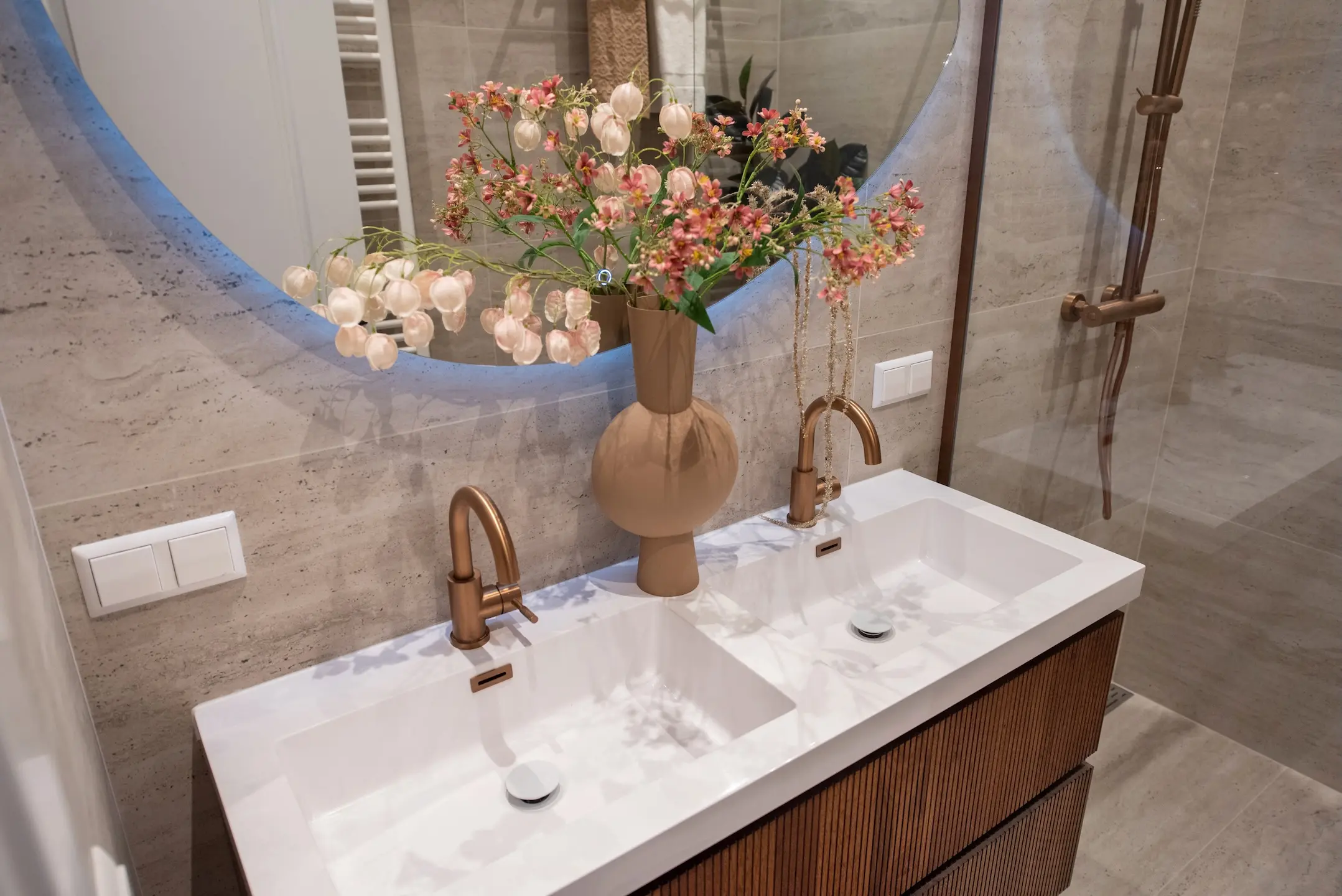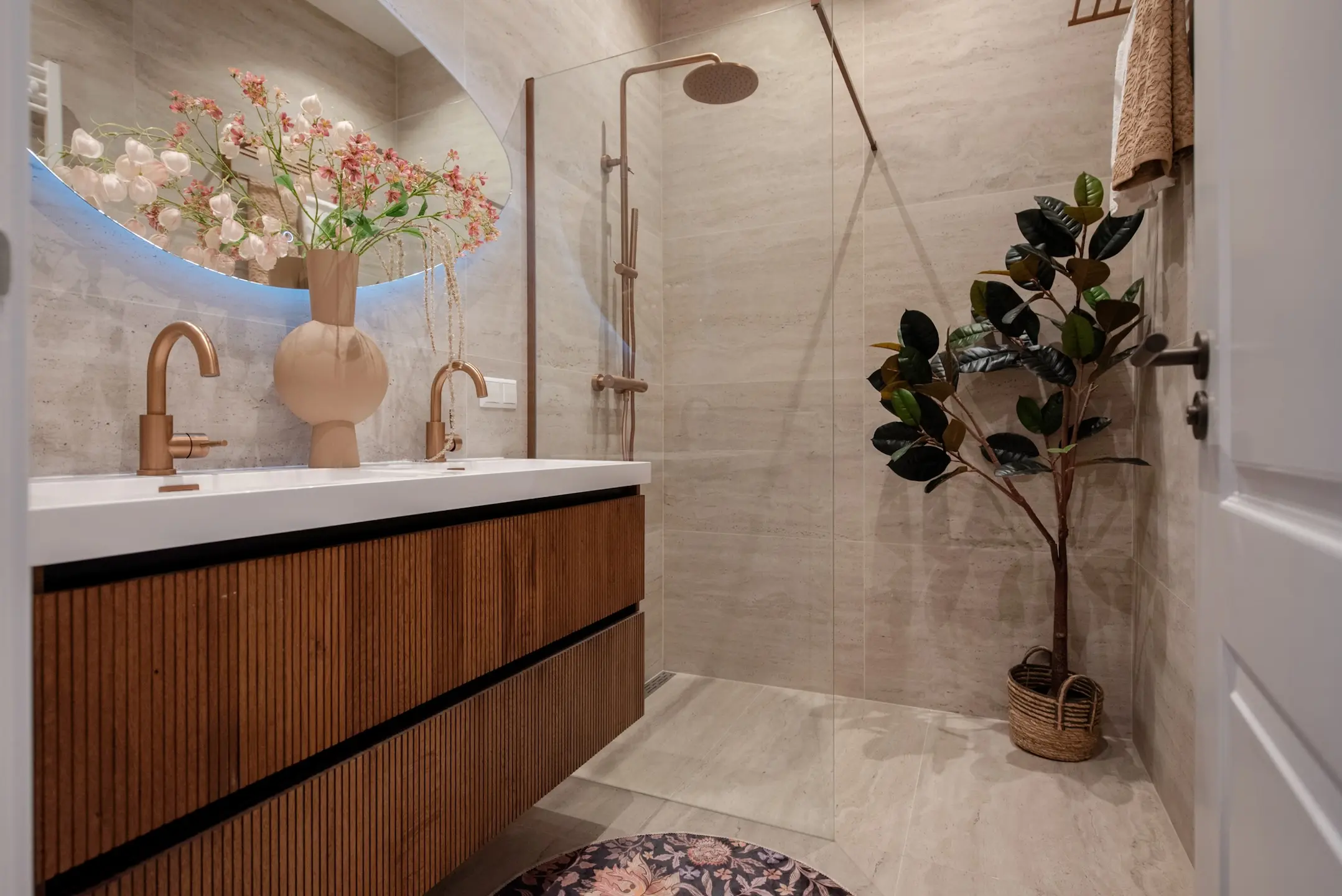 Tussengelegen luxe, moderne badkamer. Fraai afgewerkt met eigentijdse wand- en vloertegels, een breed wastafelmeubel met koperen kranen, spiegel met verlichting, royale inloopdouche met hand- en stortdouche, designradiator, ventilatie en inbouwspots.