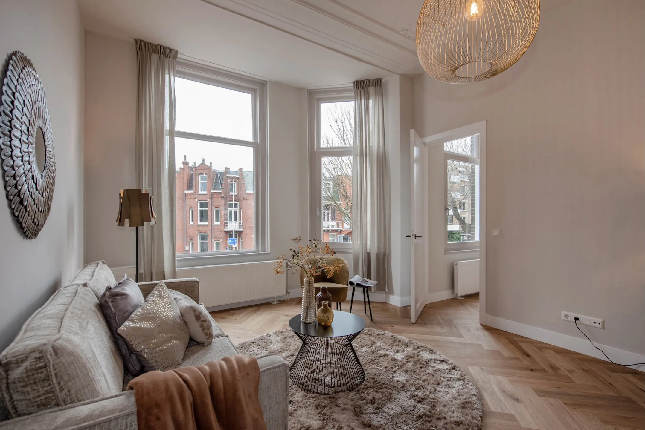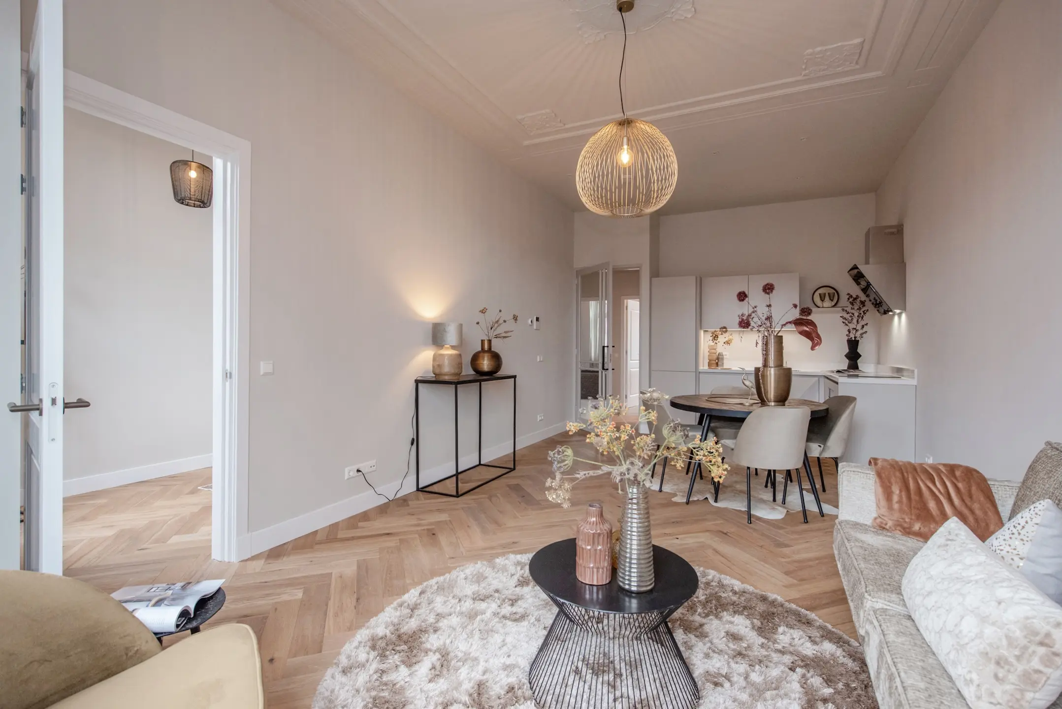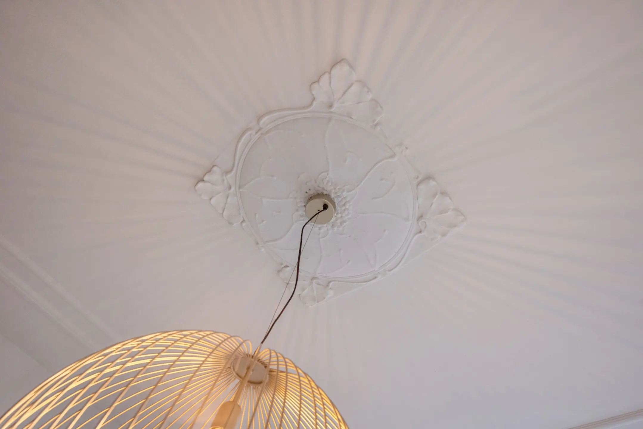 De sfeervolle woonkamer is een heerlijk lichte leefruimte, voorzien van houten vloer, hoge afgelakte plinten en strak gestuukte wanden en plafonds. De combinatie van plafondornamenten en inbouwspots creëert een elegante en warme sfeer.