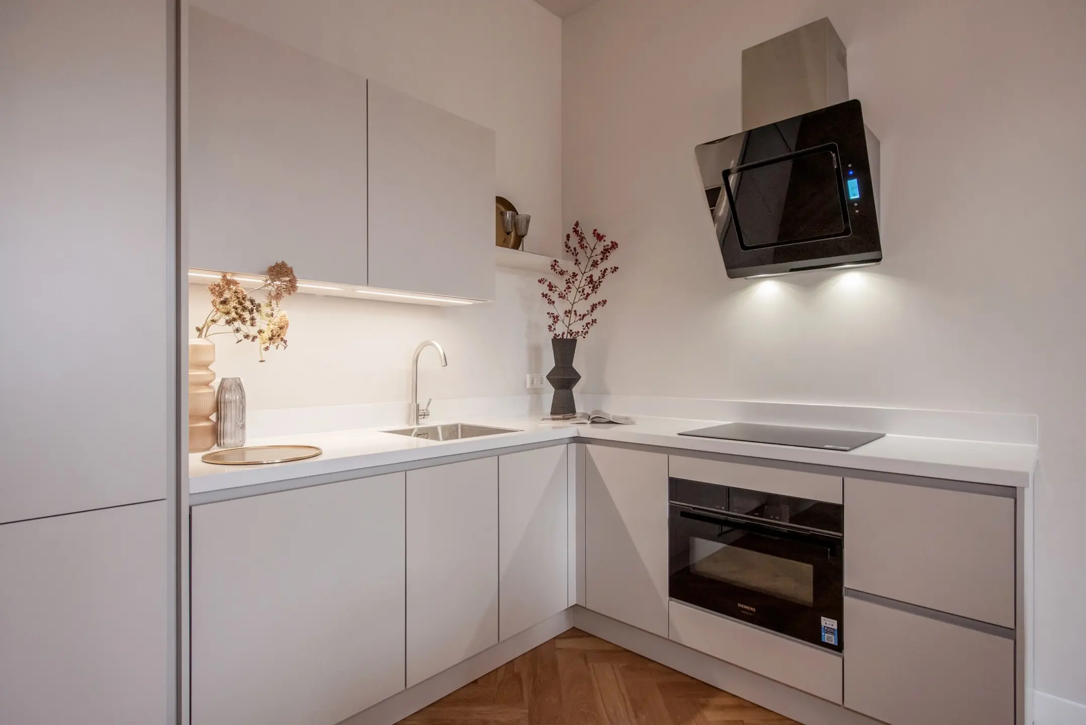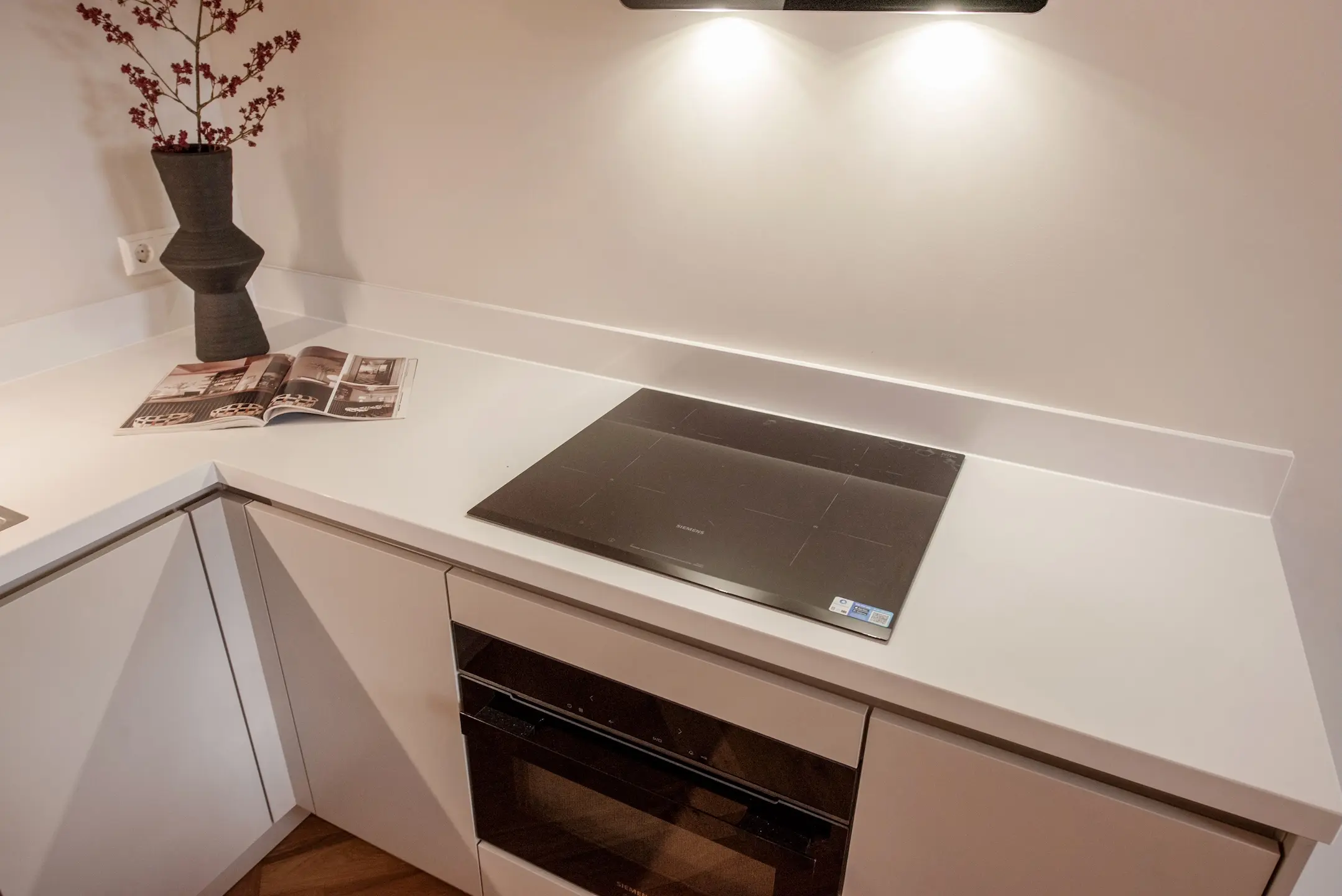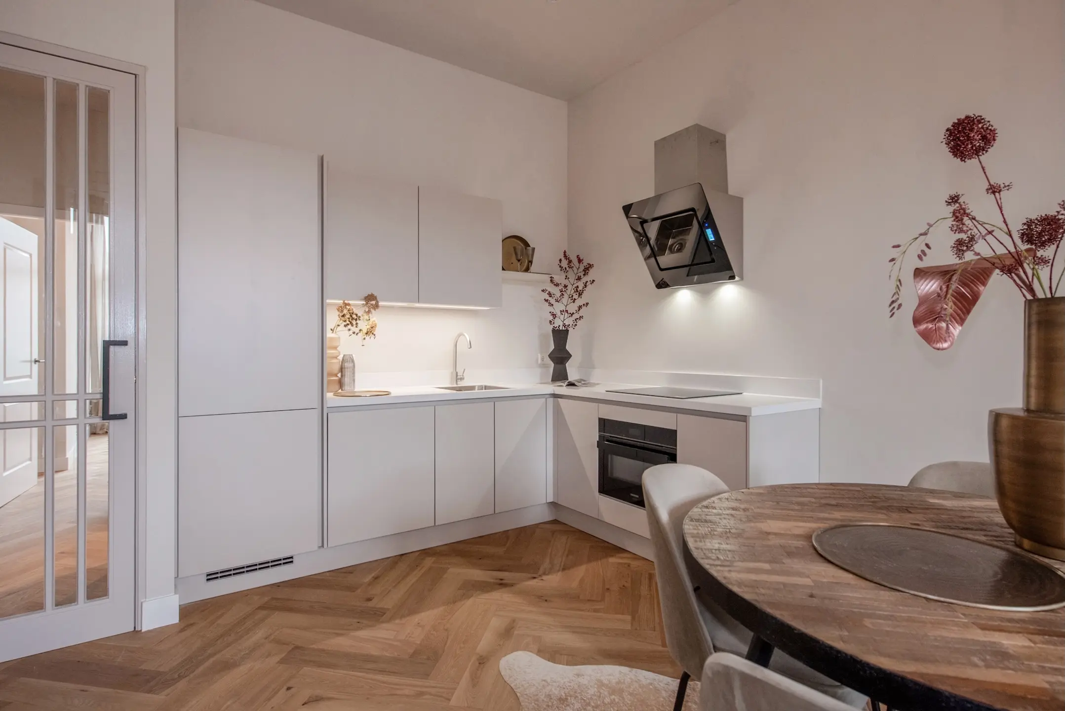 De volledig uitgeruste luxe open keuken, uitgevoerd in een stijlvolle L-opstelling, is een echte eyecatcher. Een modieuze taupekleurige opstelling, strak wit aanrechtblad en hoogwaardige inbouwapparatuur maken dit een keuken waar koken een plezier is. Voorzien van koel-/vriescombinatie, 4-pits inductiekookplaat met afzuigunit, combimagnetron, vaatwasser en spoelbak met mengkraan.