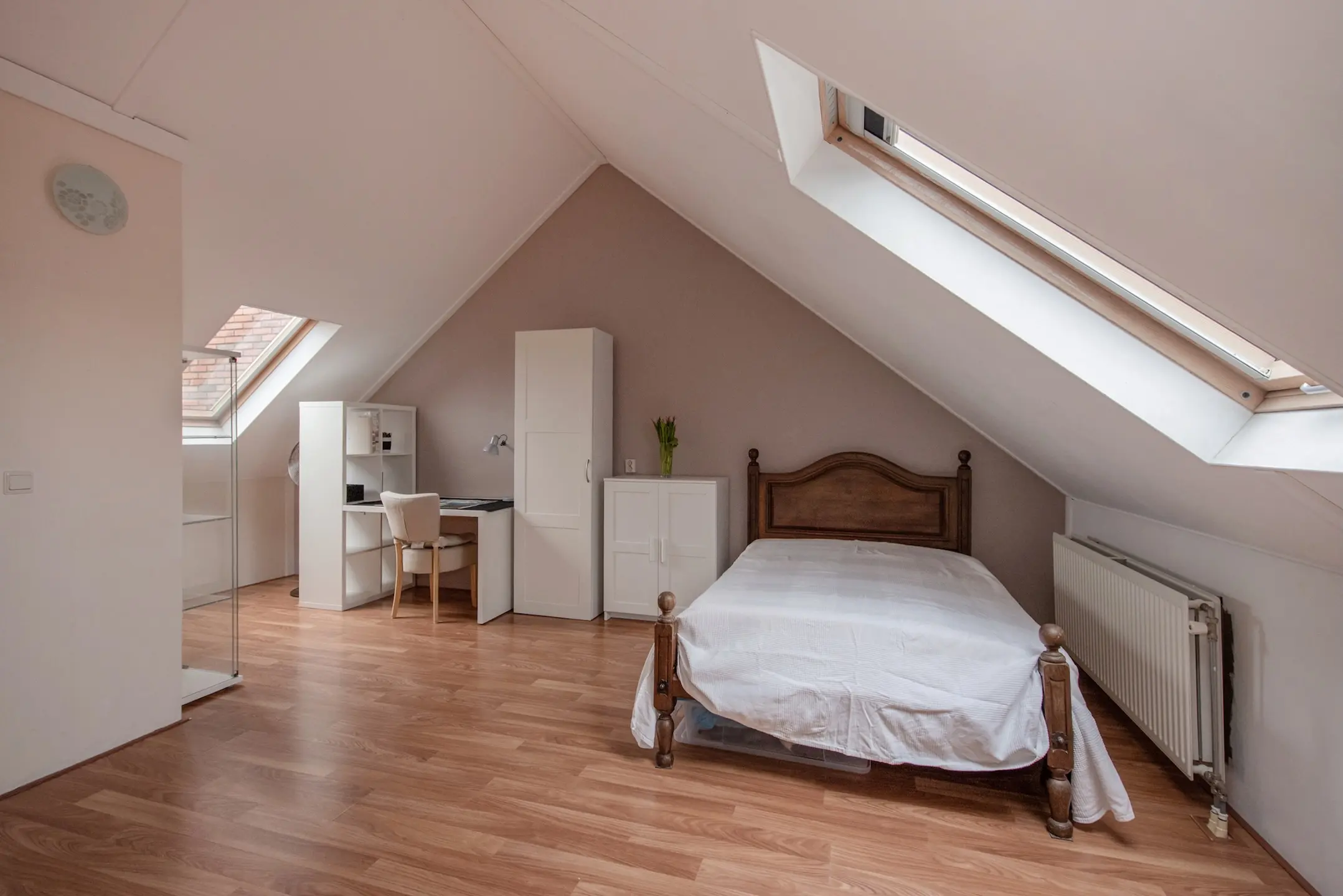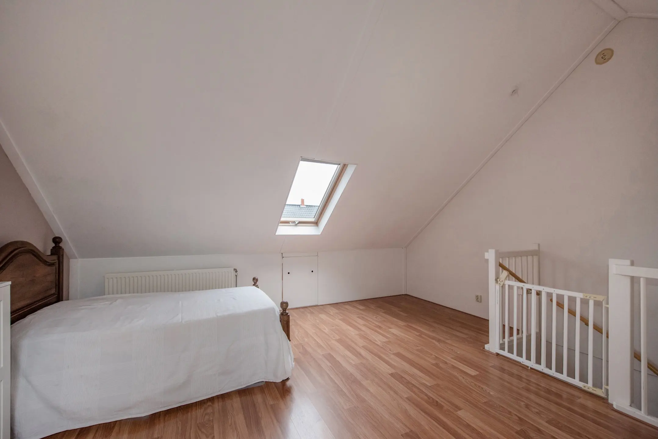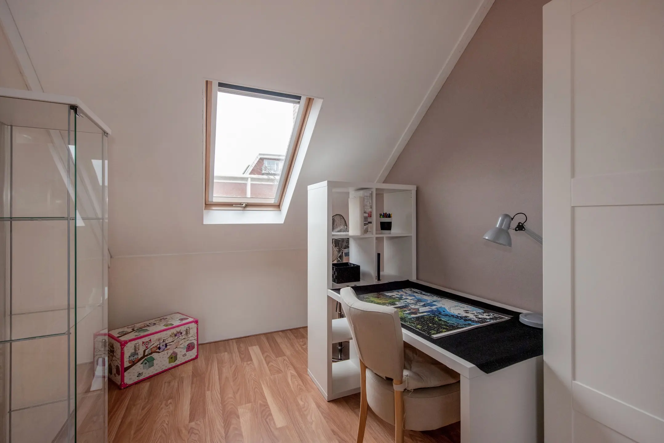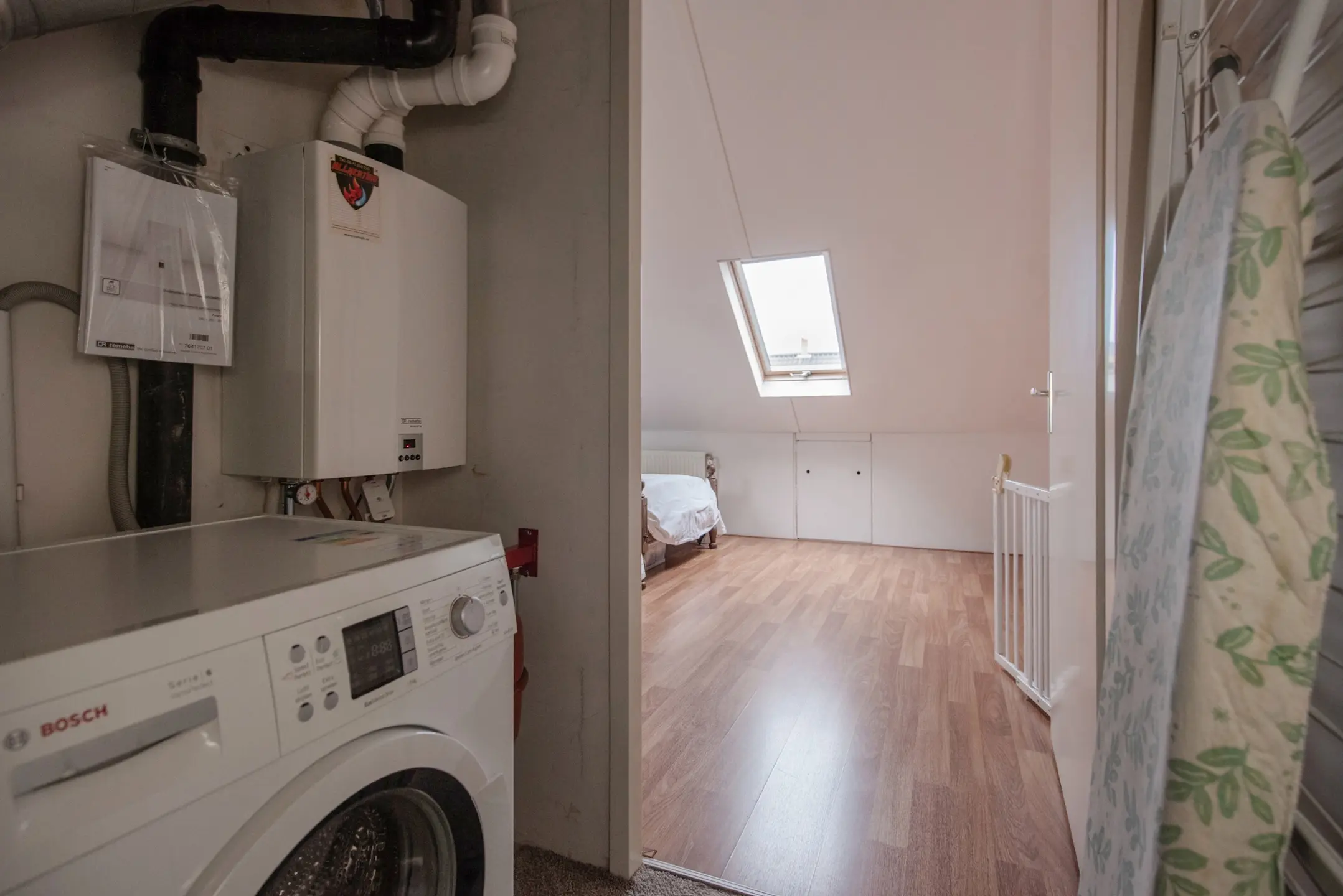 2e verdieping: deze verdieping is voorzien van een mooie laminaatvloer en 1 grote slaap-/werkkamer met 2 dakramen, veel berging en een aparte afgesloten wasruimte met opstelplaats voor CV combiketel, mechanische ventilatie en wasmachine/droger aansluiting.