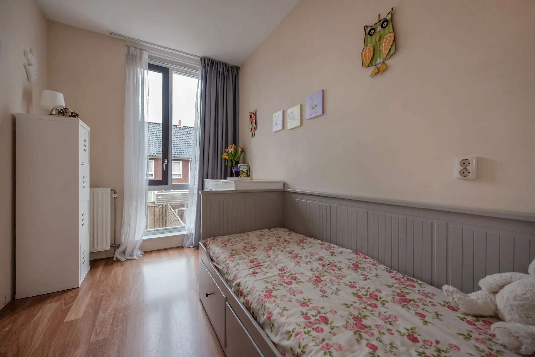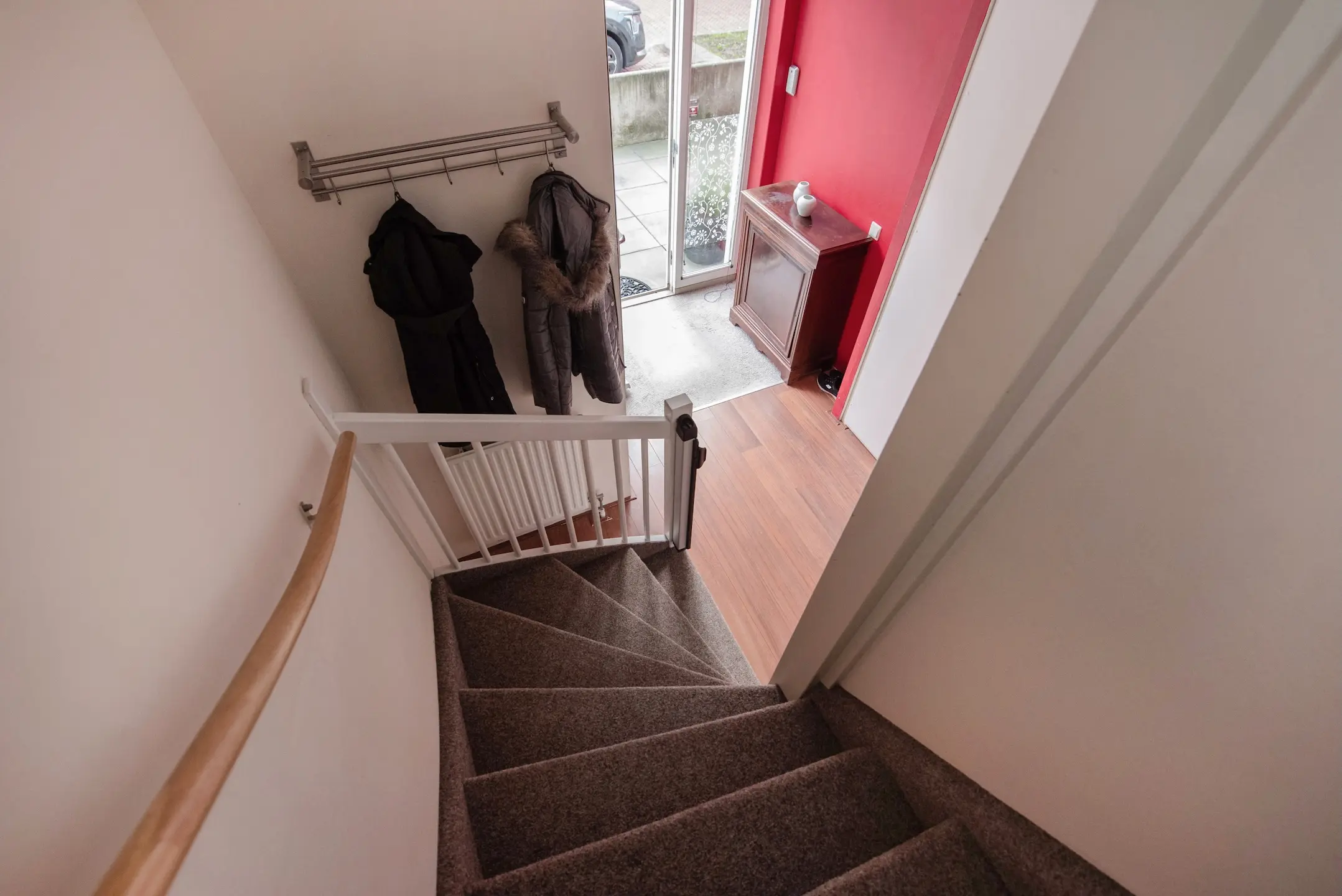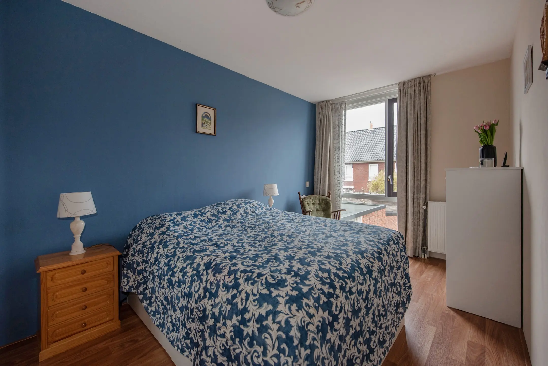 1e verdieping: overloop, (de gehele verdieping is voorzien van een laminaatvloer), achtergelegen slaapkamer, mooie achtergelegen hoofdslaapkamer en een goed formaat voorslaapkamer, moderne geheel betegelde badkamer met inloop douche met rainshower en drain, wastafelmeubel, design radiator en 2e vrij hangend toilet.