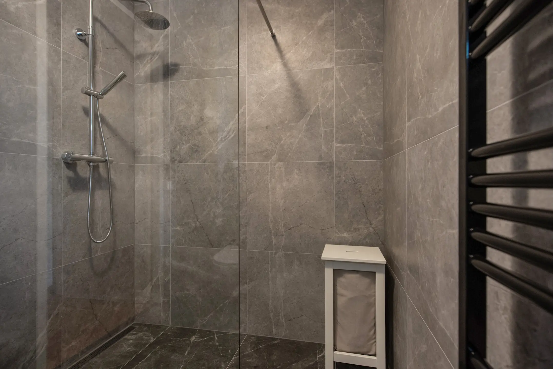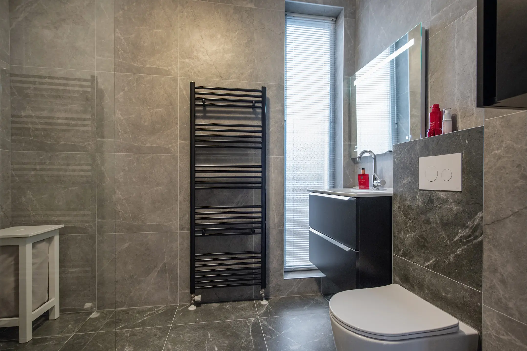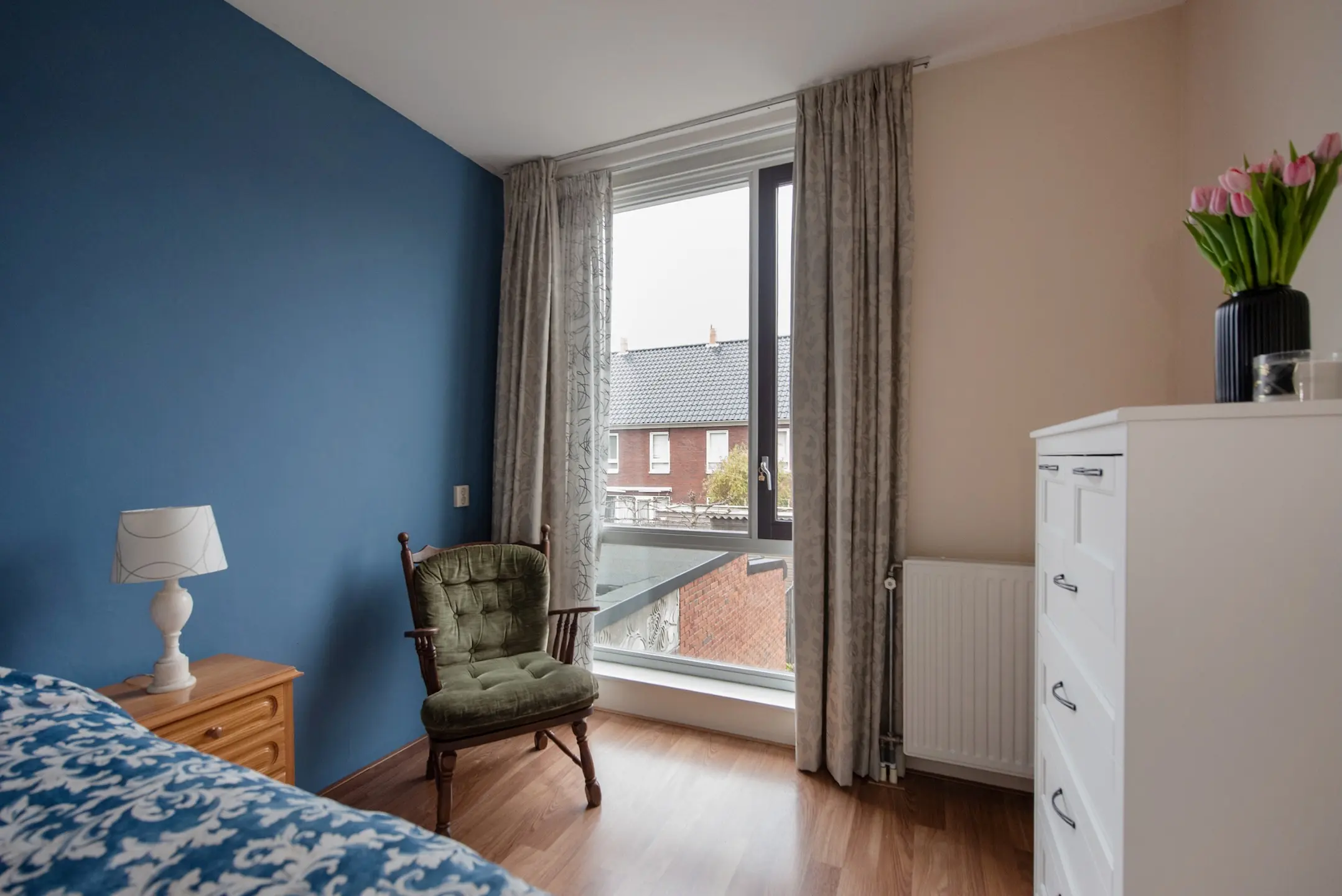 1e verdieping: overloop, (de gehele verdieping is voorzien van een laminaatvloer), achtergelegen slaapkamer, mooie achtergelegen hoofdslaapkamer en een goed formaat voorslaapkamer, moderne geheel betegelde badkamer met inloop douche met rainshower en drain, wastafelmeubel, design radiator en 2e vrij hangend toilet.