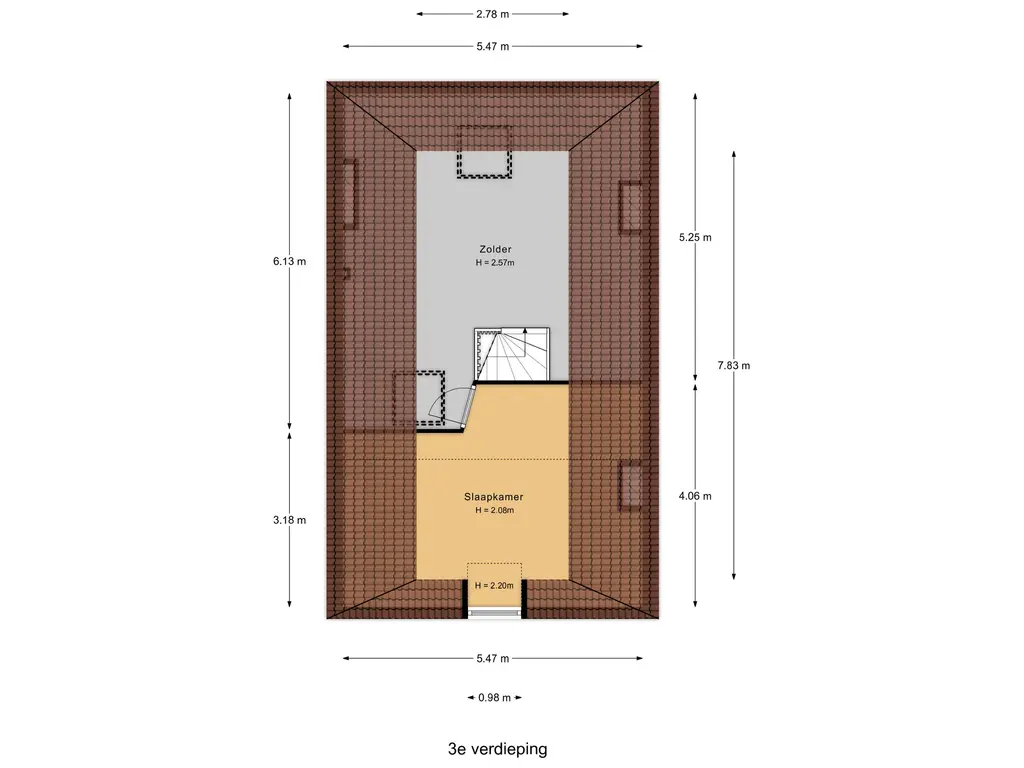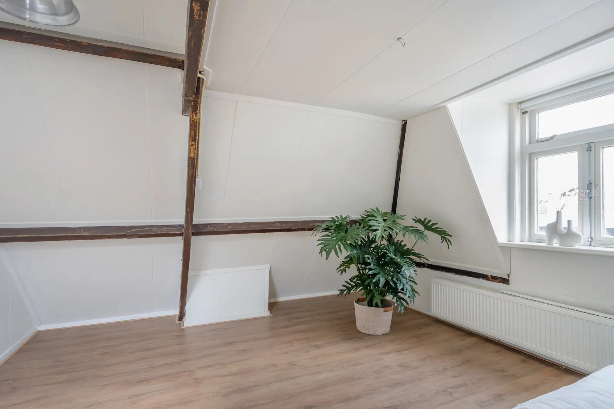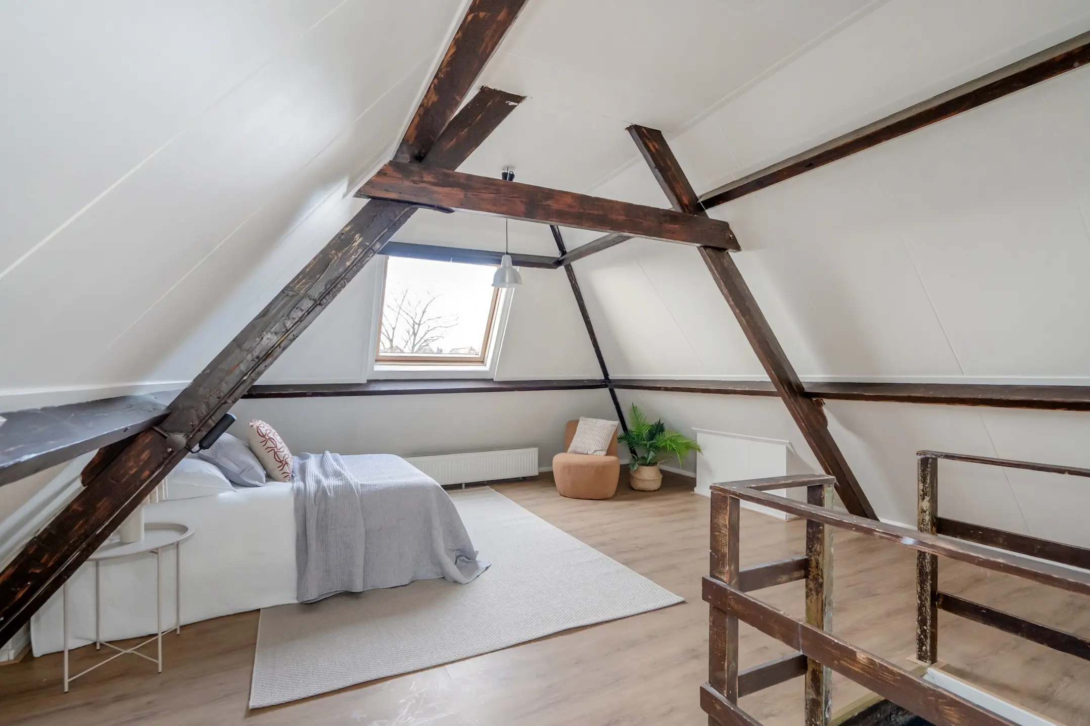 Derde verdieping: Op de derde verdieping bevindt zich een multifunctionele ruimte met twee dakramen en een laminaatvloer. Aan de voorzijde is een slaapkamer, waarbij de sfeervolle en originele dakspanten zichtbaar zijn.
