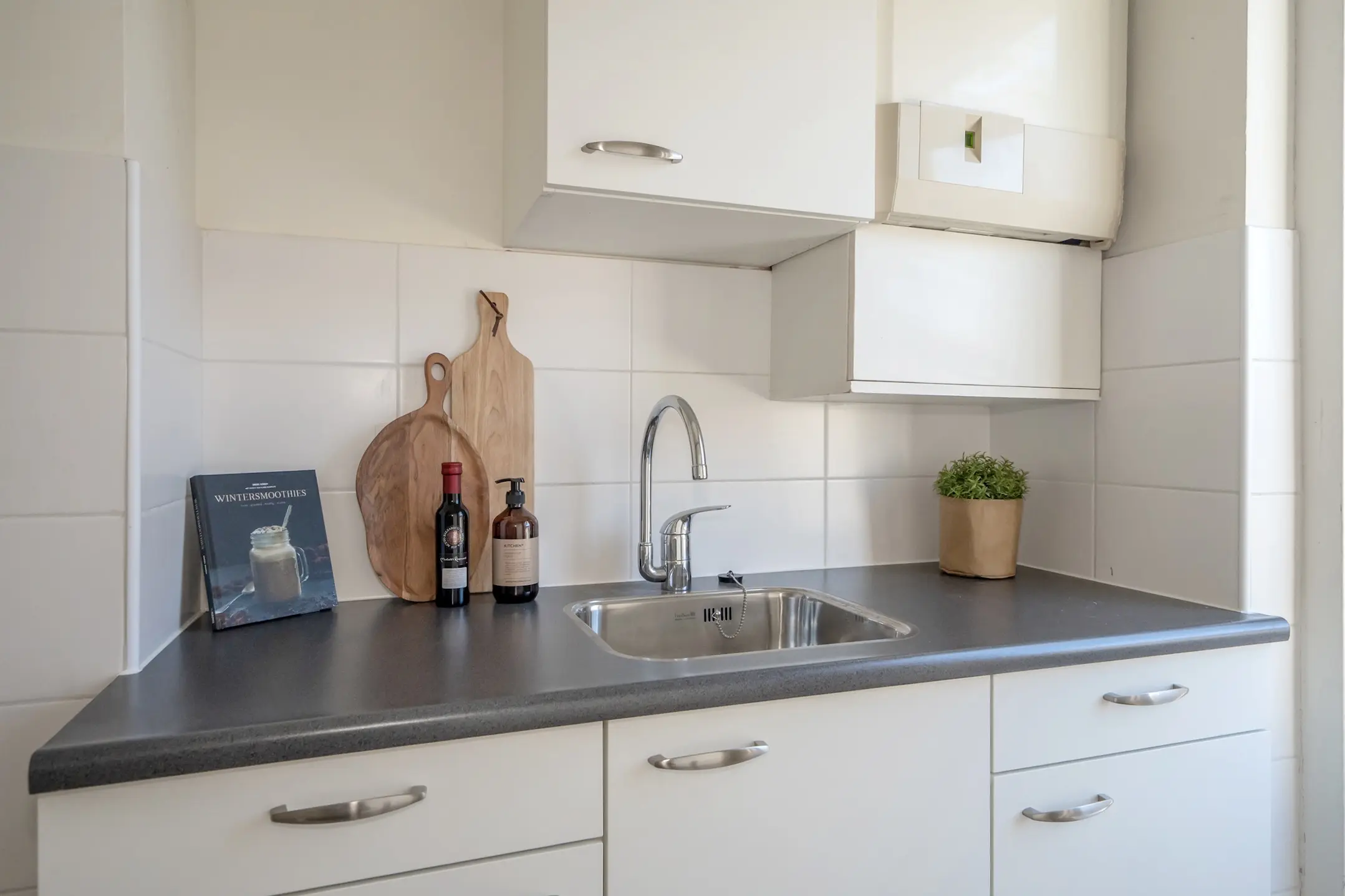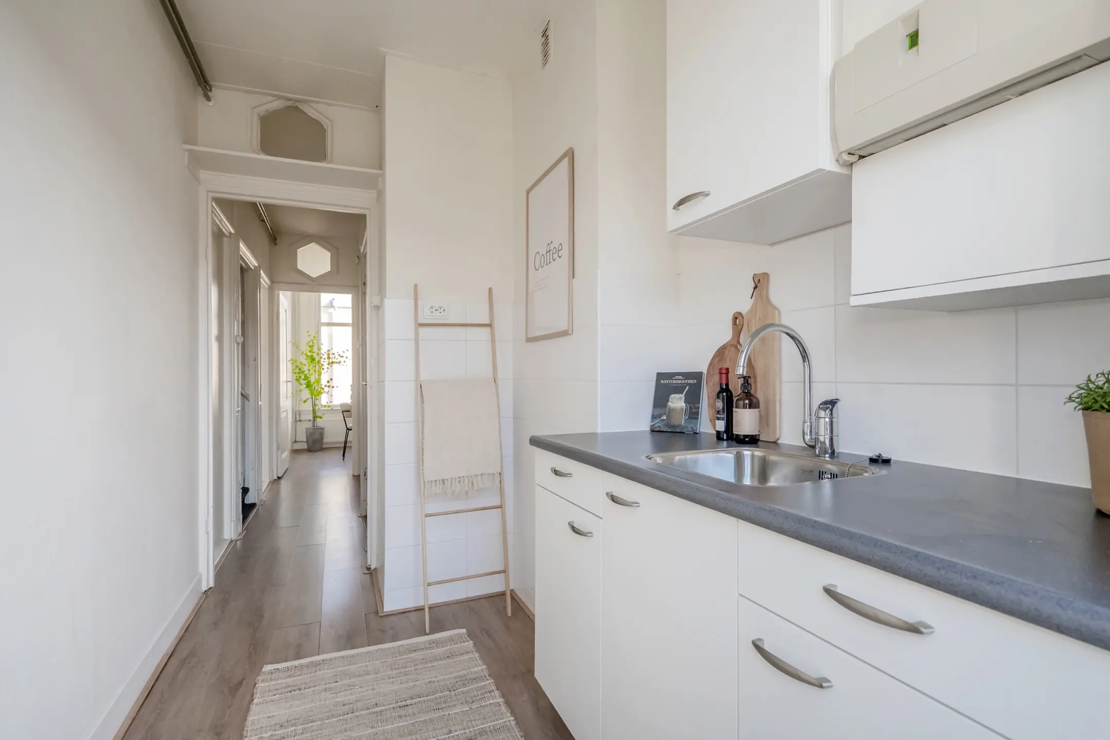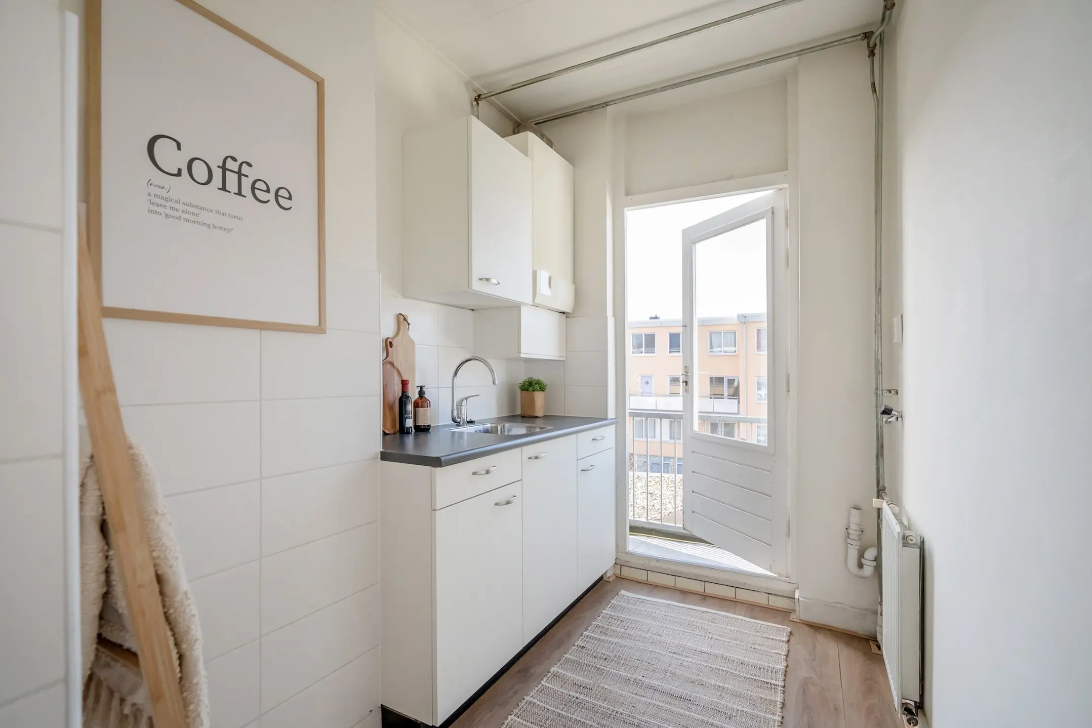 Aan de achterzijde bevindt zich de keuken, die is voorzien van een Bosch cv-ketel (25 VRC, 2001) en een aansluiting voor een wasmachine. Vanuit de keuken is er toegang tot het royale balkon, dat gelegen is op het zonnige zuidwesten.
