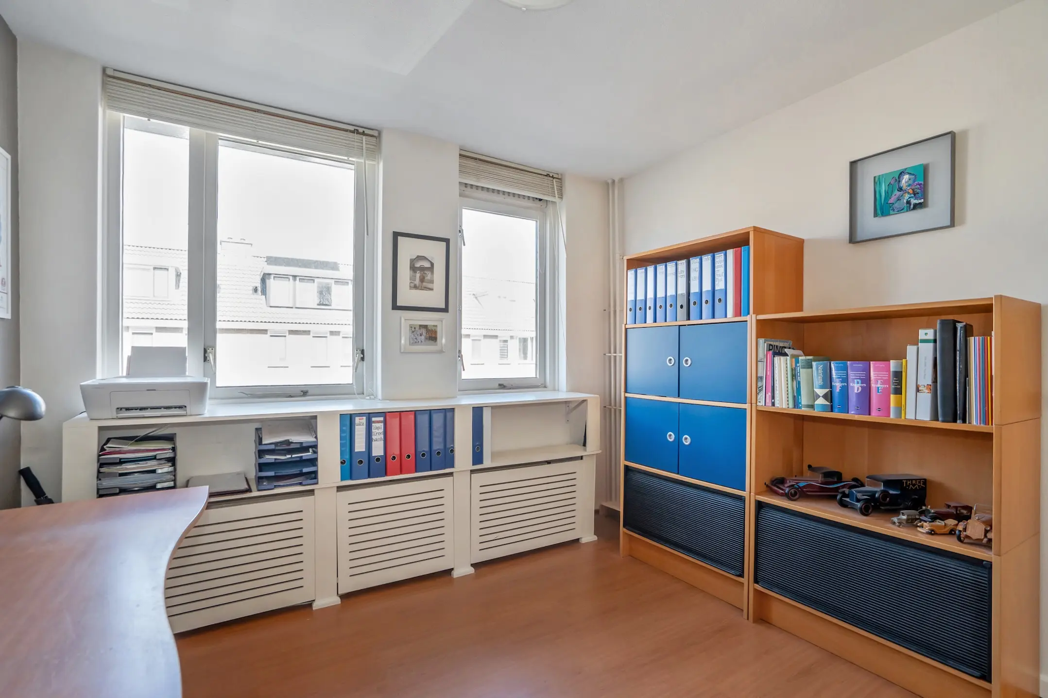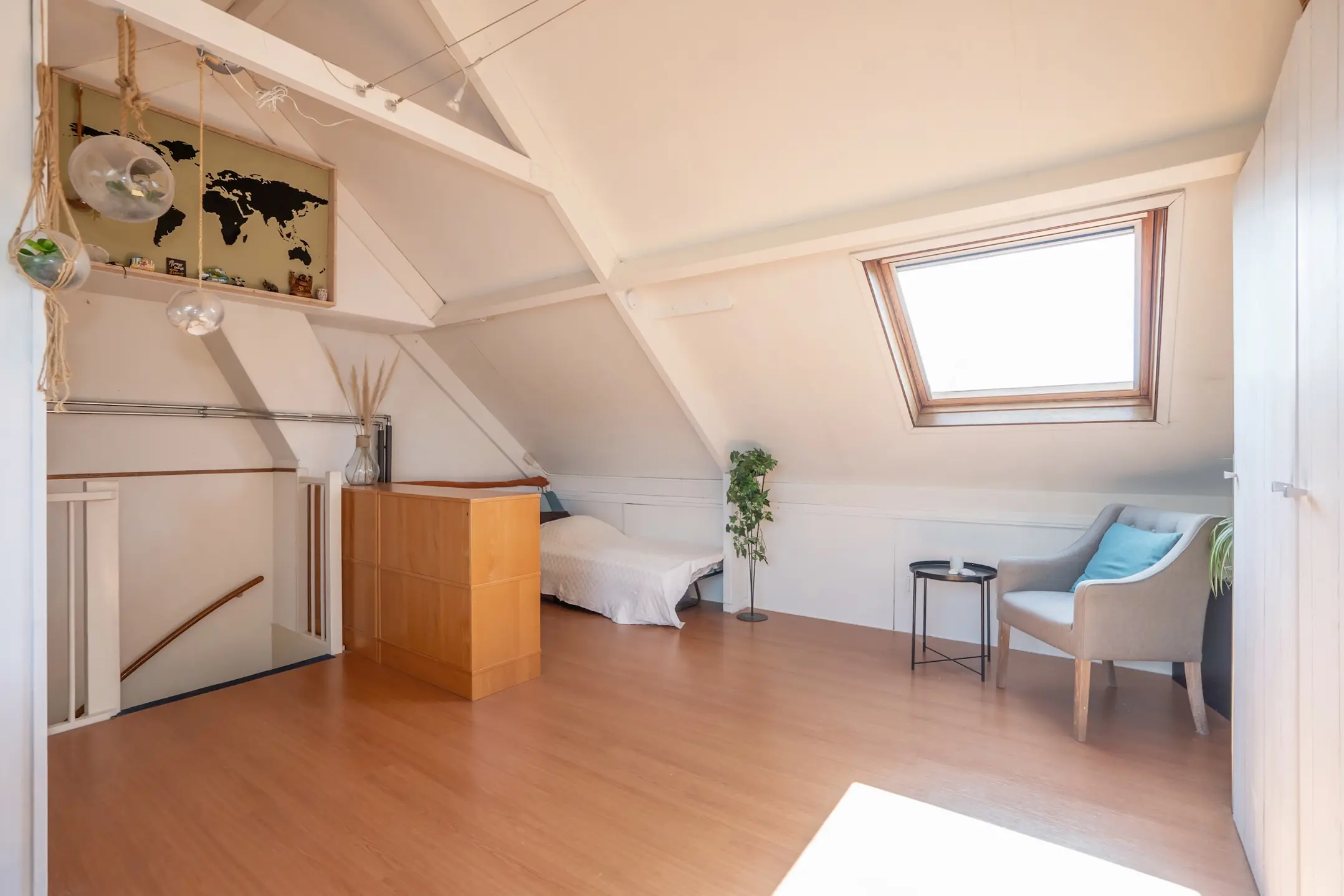 2e verdieping: grote multifunctionele ruimte met twee dakramen waarvan de ene zijde gebruikt wordt als kantoorruimte en de andere zijde als logeerruimte.