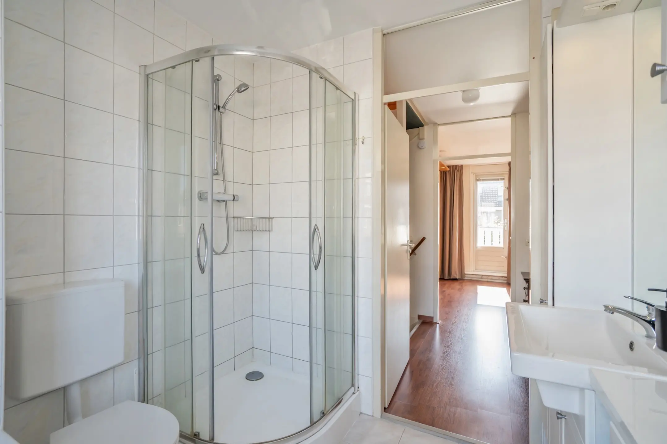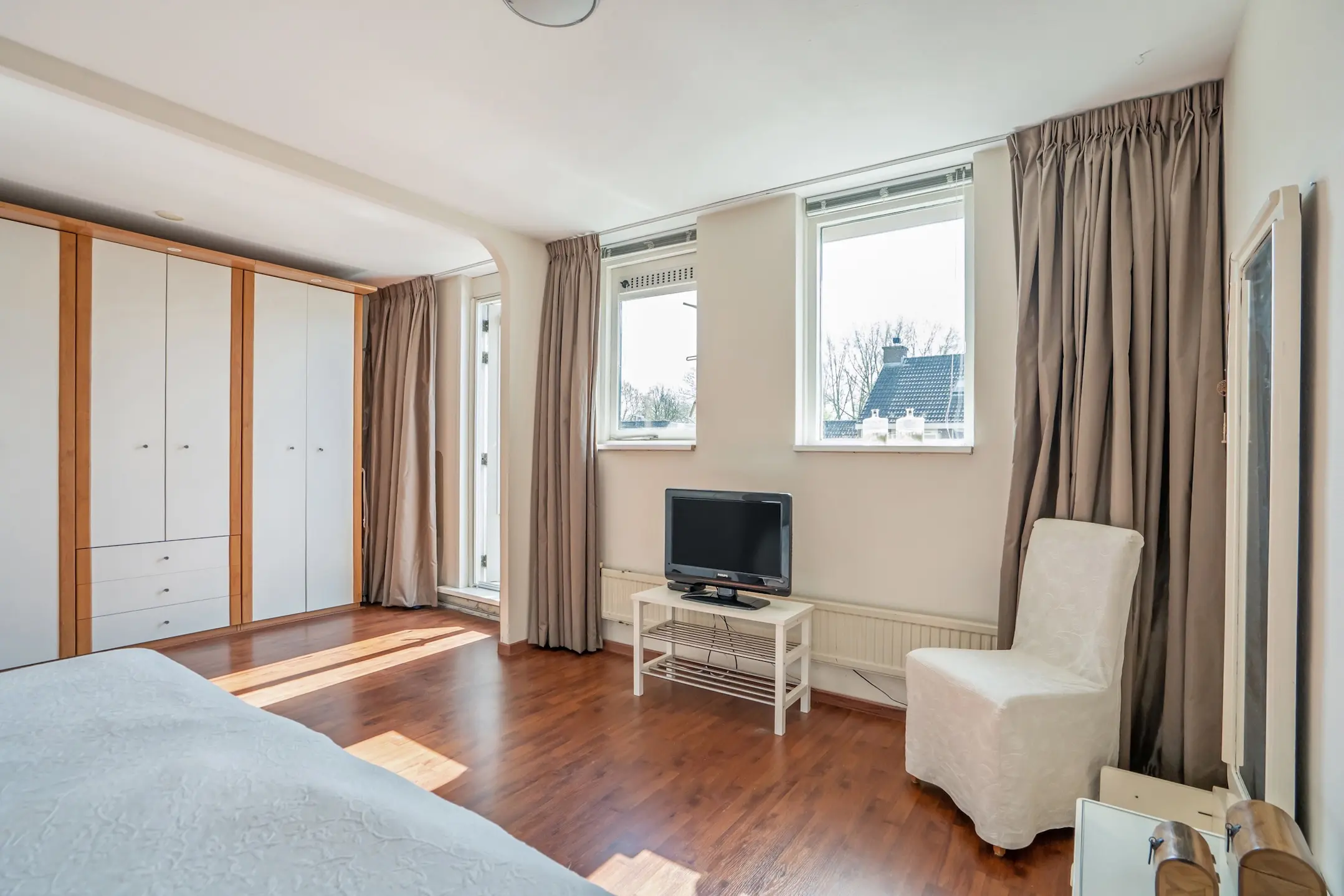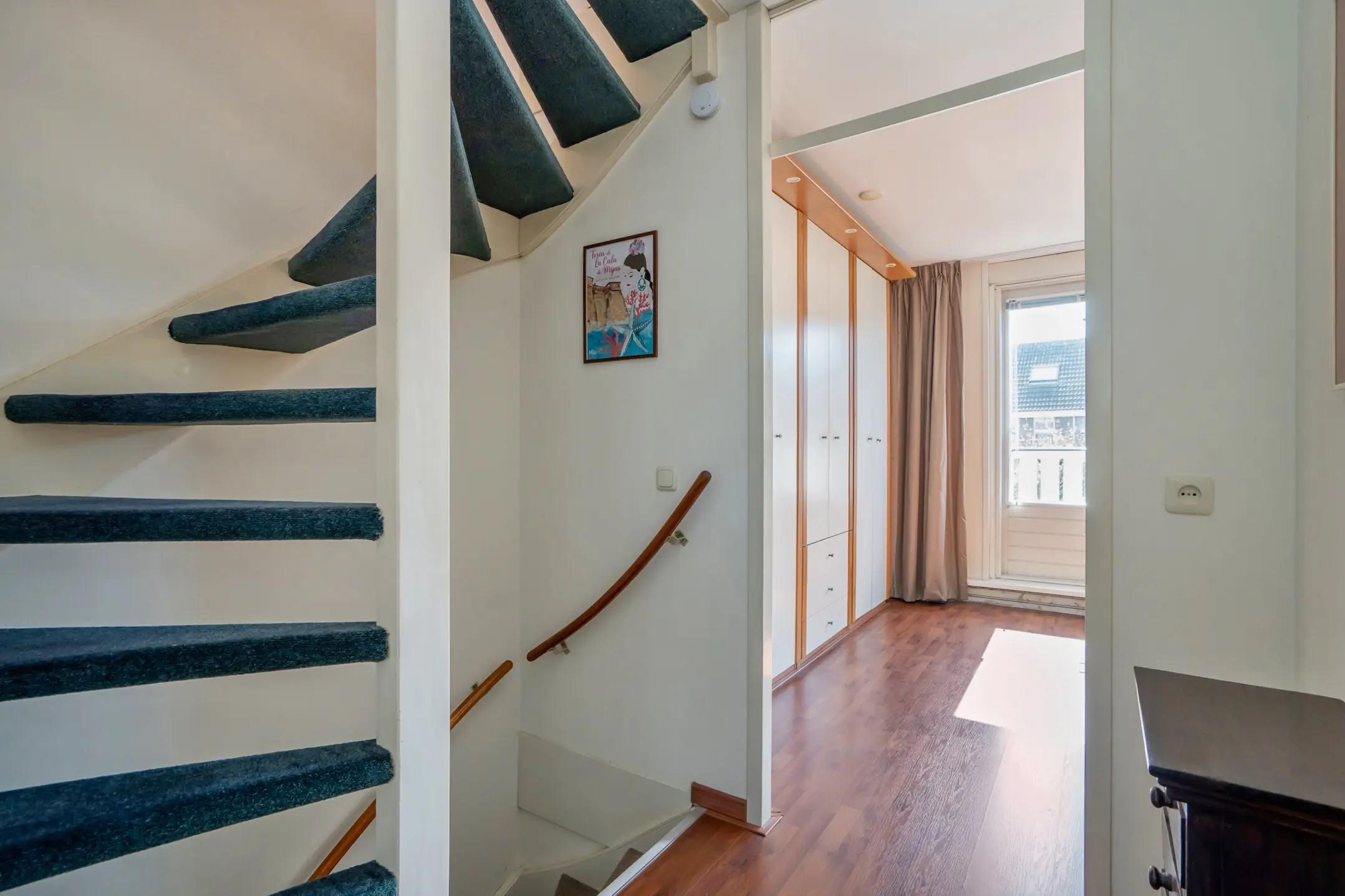 1e verdieping: overloop, ruime slaapkamer (thans werkkamer) aan de voorzijde, aan de achterzijde bevindt zich de hoofdslaapkamer (dit waren oorspronkelijk 2 afzonderlijke kamers) met toegang tot het balkon. Desgewenst kan deze kamer weer gesplitst worden in twee afzonderlijke kamers. De badkamer is voorzien van een wastafelmeubel, een kwartronde douchecabine met een thermostaatkraan, een handdoekenradiator en een tweede toilet. Door het badkamerraam goede lichtinval en ventilatiemogelijkheden