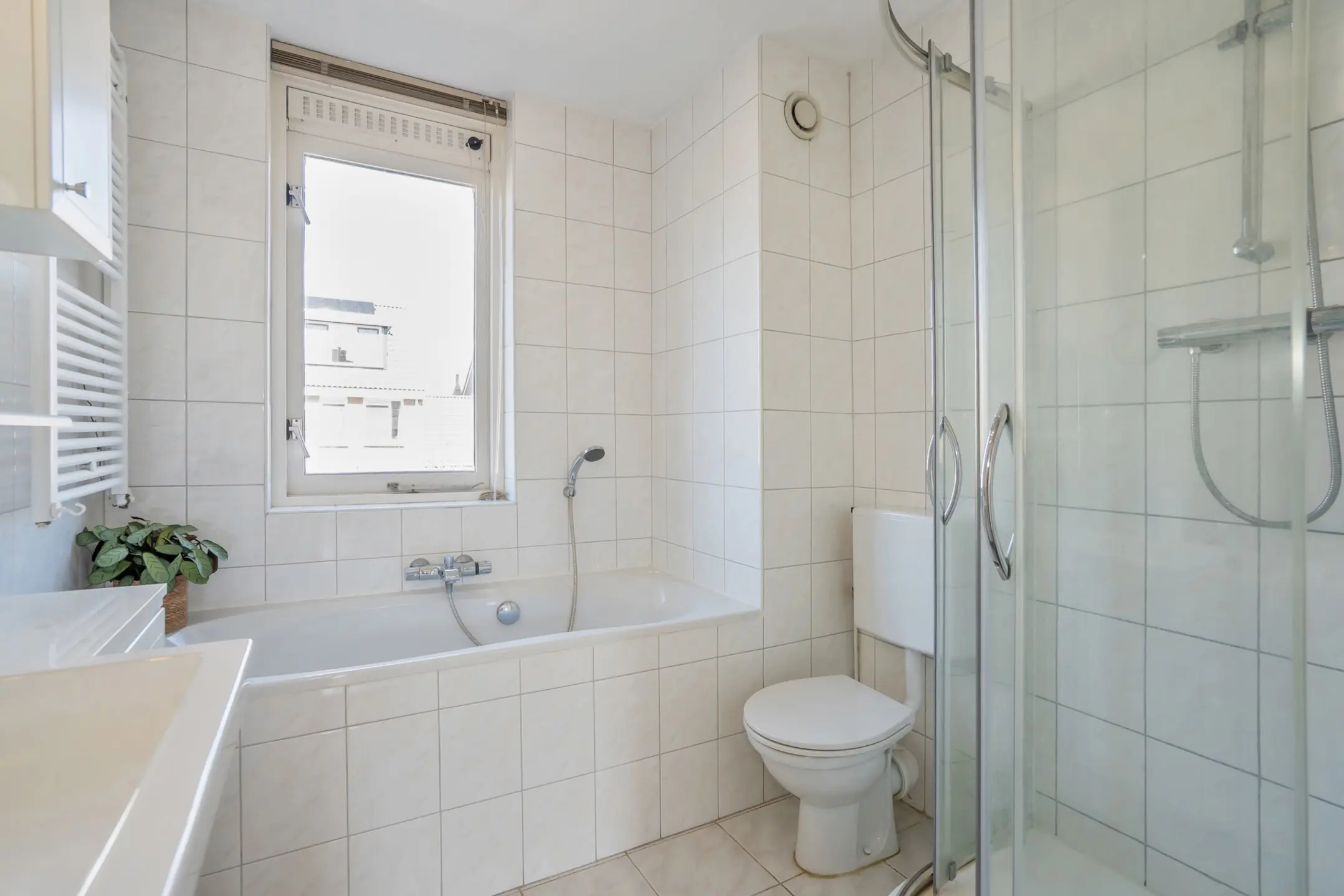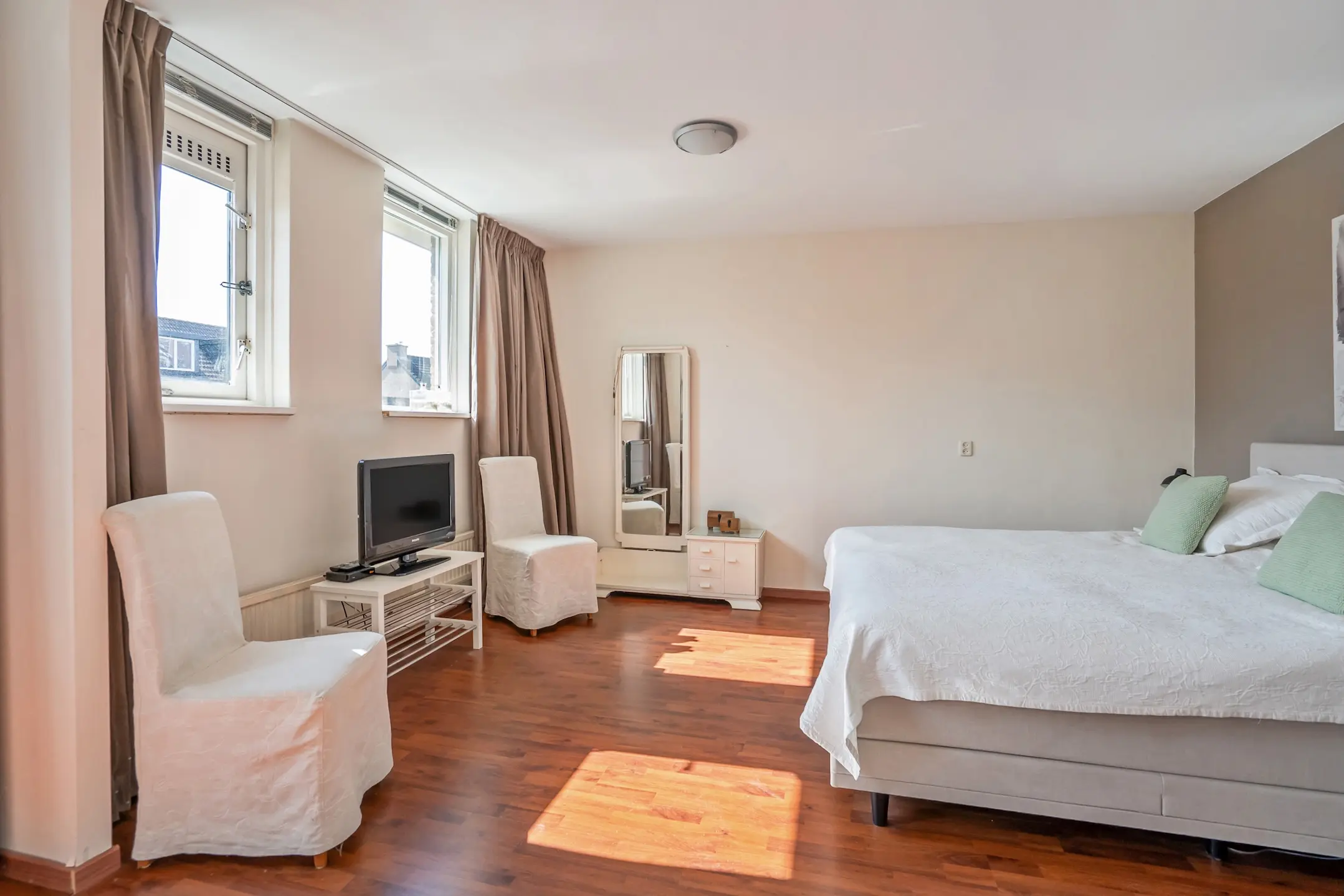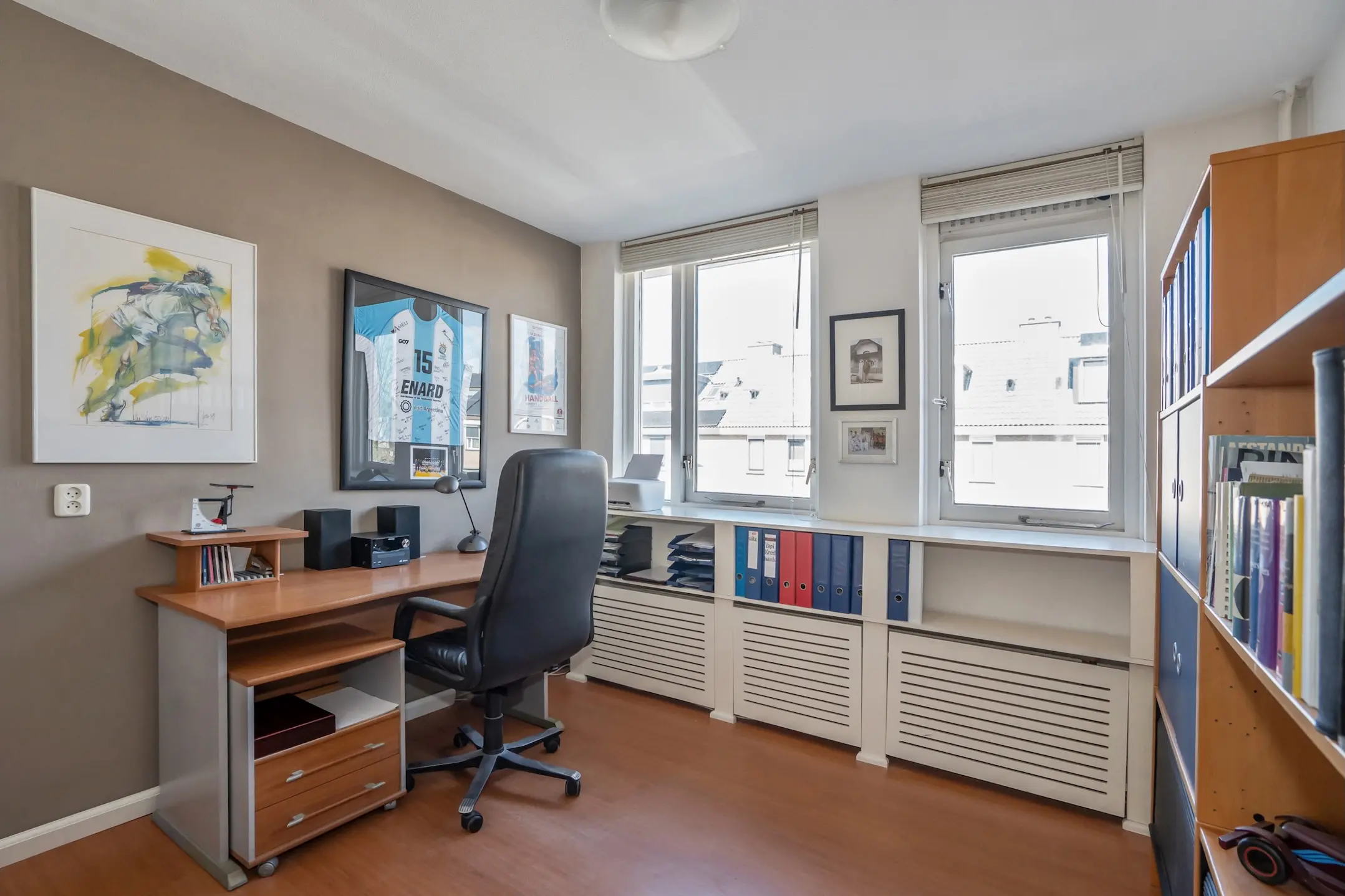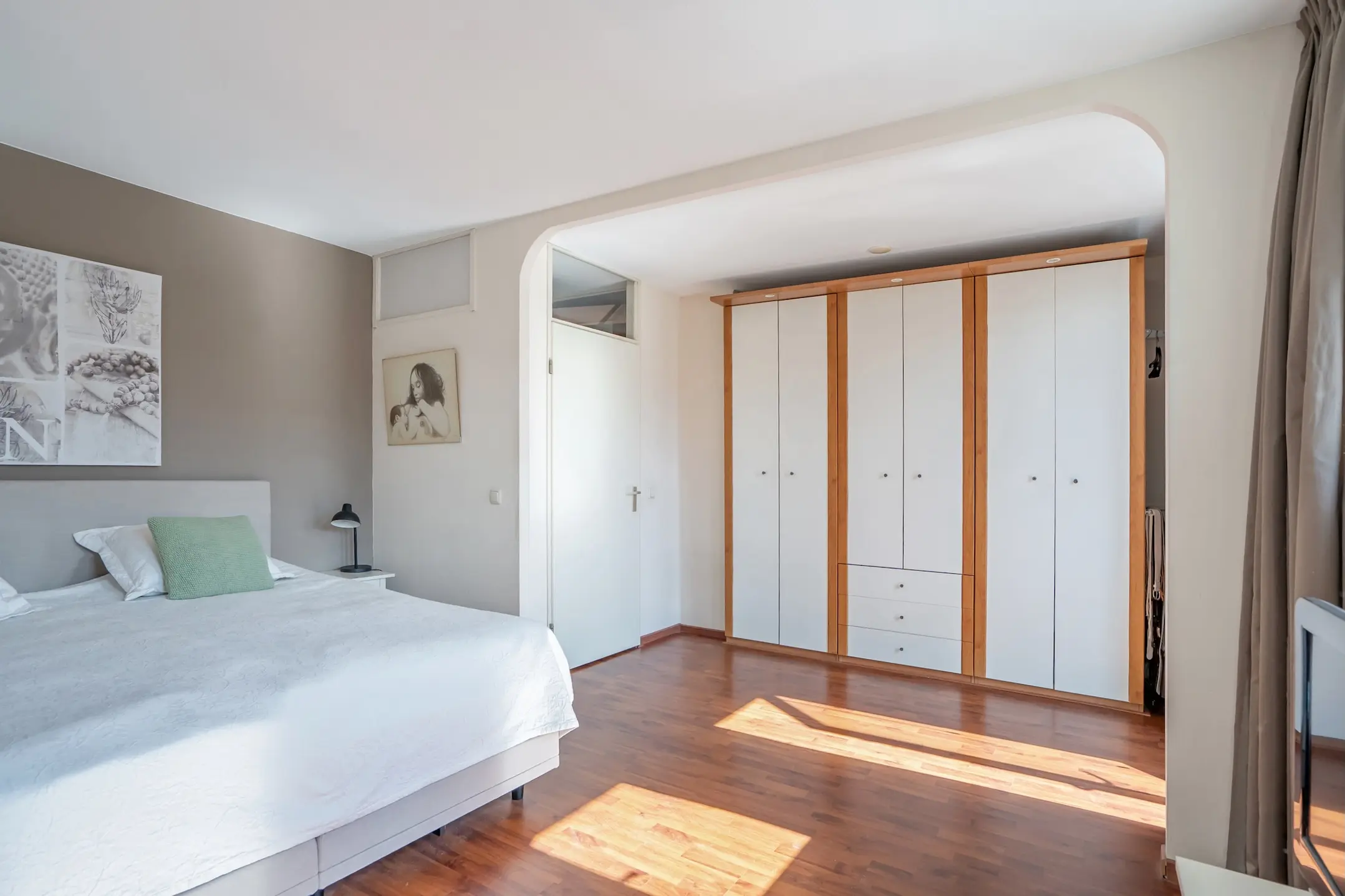 1e verdieping: overloop, ruime slaapkamer (thans werkkamer) aan de voorzijde, aan de achterzijde bevindt zich de hoofdslaapkamer (dit waren oorspronkelijk 2 afzonderlijke kamers) met toegang tot het balkon. Desgewenst kan deze kamer weer gesplitst worden in twee afzonderlijke kamers. De badkamer is voorzien van een wastafelmeubel, een kwartronde douchecabine met een thermostaatkraan, een handdoekenradiator en een tweede toilet. Door het badkamerraam goede lichtinval en ventilatiemogelijkheden