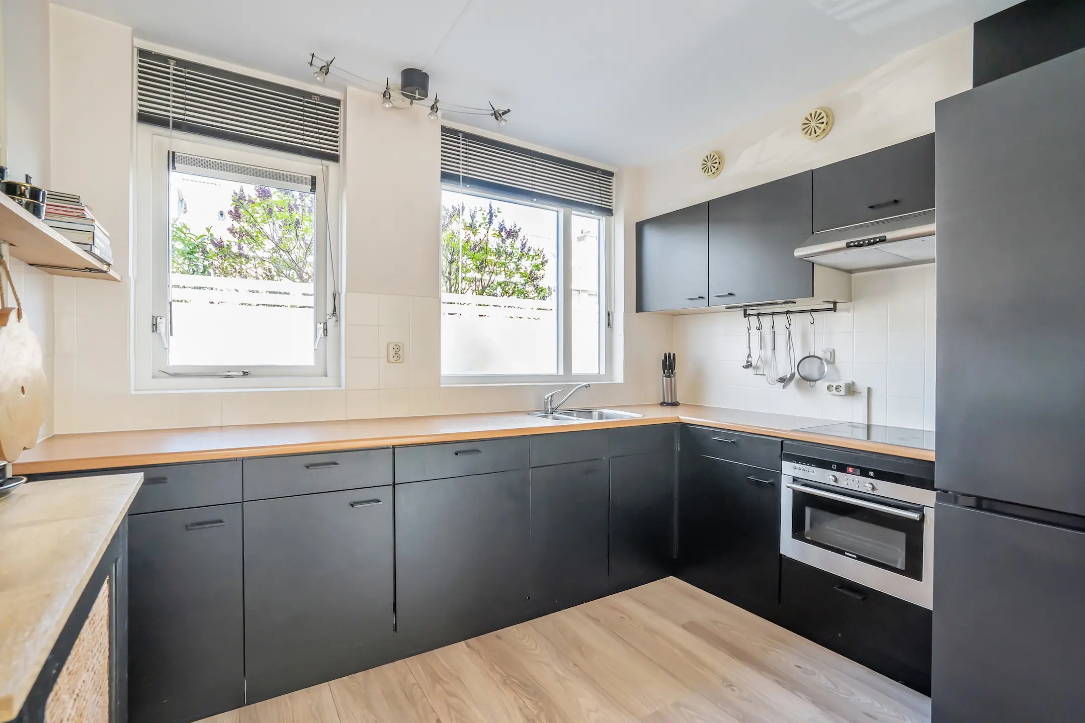 De keuken bevindt zich aan de voorzijde en heeft een groot keukenraam waardoor een aangename lichtinval. In zwart uitgevoerde keukeninrichting in een hoekopstelling, inbouw vaatwasser, keramische kookplaat, rvs afzuigkap, een combi oven en veel kast- en werkruimte.