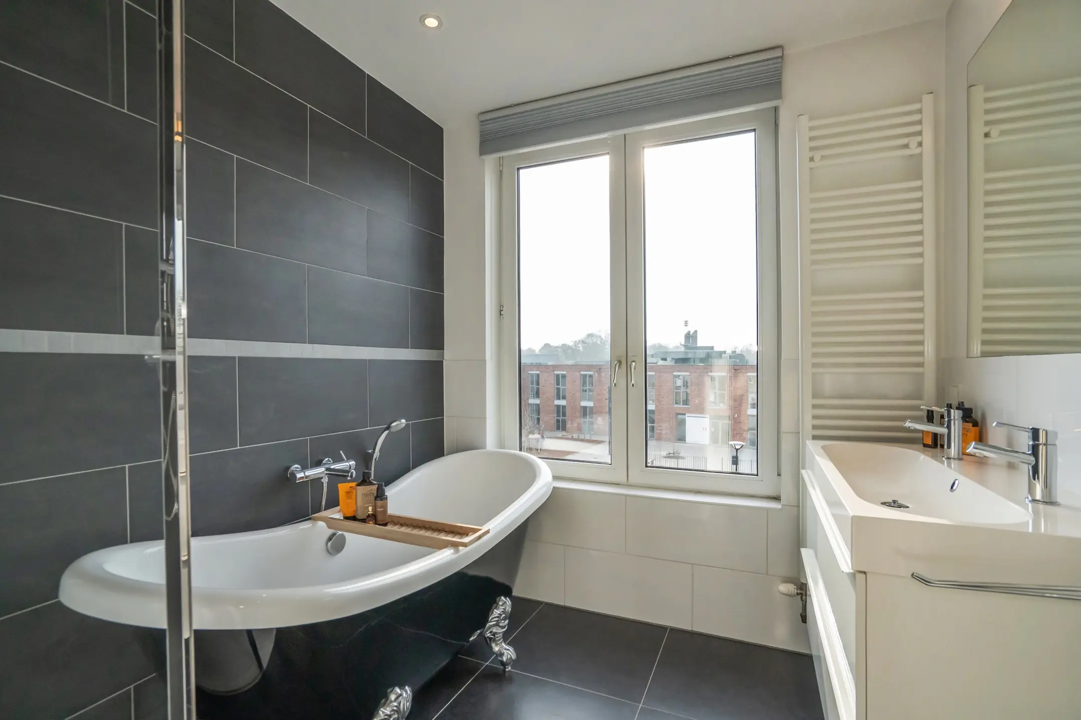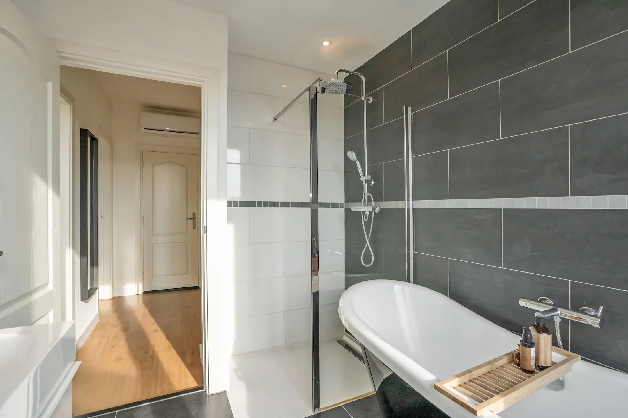 De overloop biedt toegang tot 2 slaapkamers. Aan de voorzijde bevindt zich de ruime hoofdslaapkamer. Aan de achterzijde ligt een tweede royale slaapkamer met een inbouwkast. De indeling van deze verdieping is aangepast: de voormalige badkamer is omgevormd tot een praktische wasruimte met een 2e vrij hangend toilet. De zijkamer aan de voorzijde is ingericht als moderne badkamer voorzien van een ligbad, douche, een “dubbele” wastafelmeubel en een designradiator.