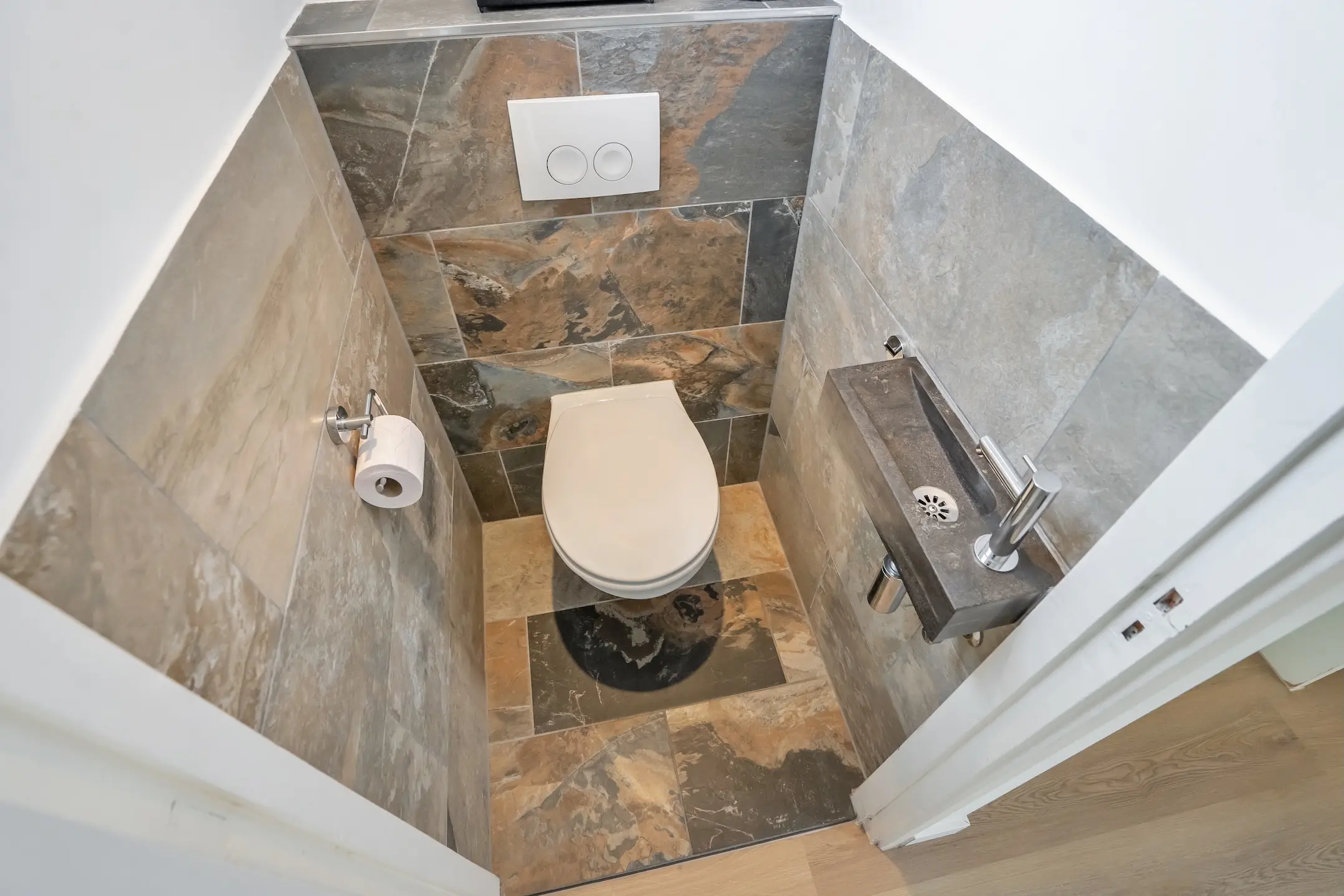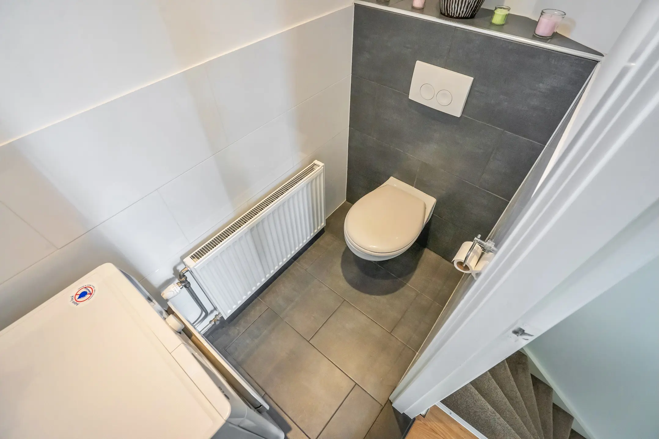 Overloop met toegang tot een nette toiletruimte met een vrij hangend toilet en een fontein. Aan de achterzijde ligt het ruime, zonnige terras (NW) met een handige bergkast een heerlijke plek om te ontspannen of gezellig te tafelen.