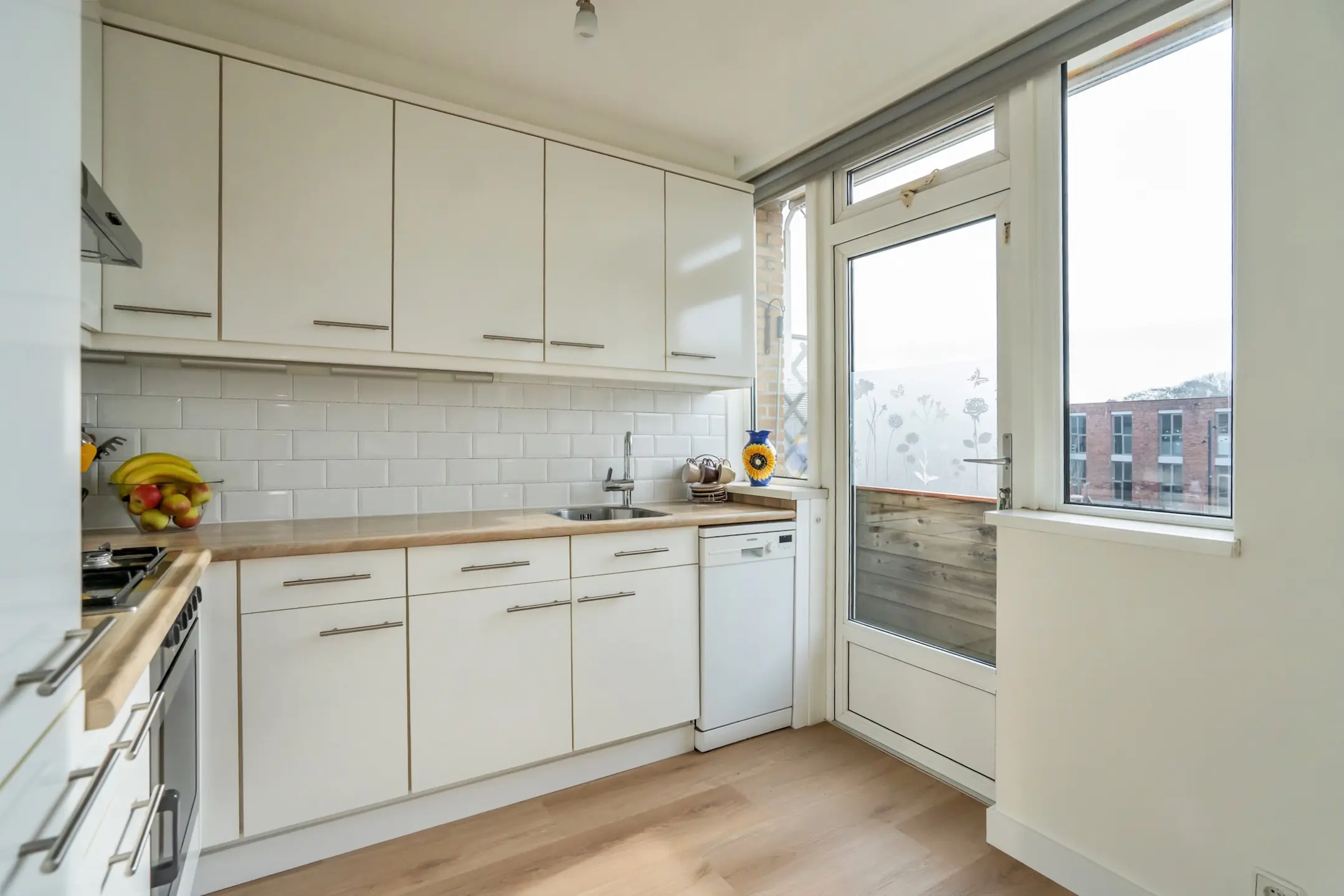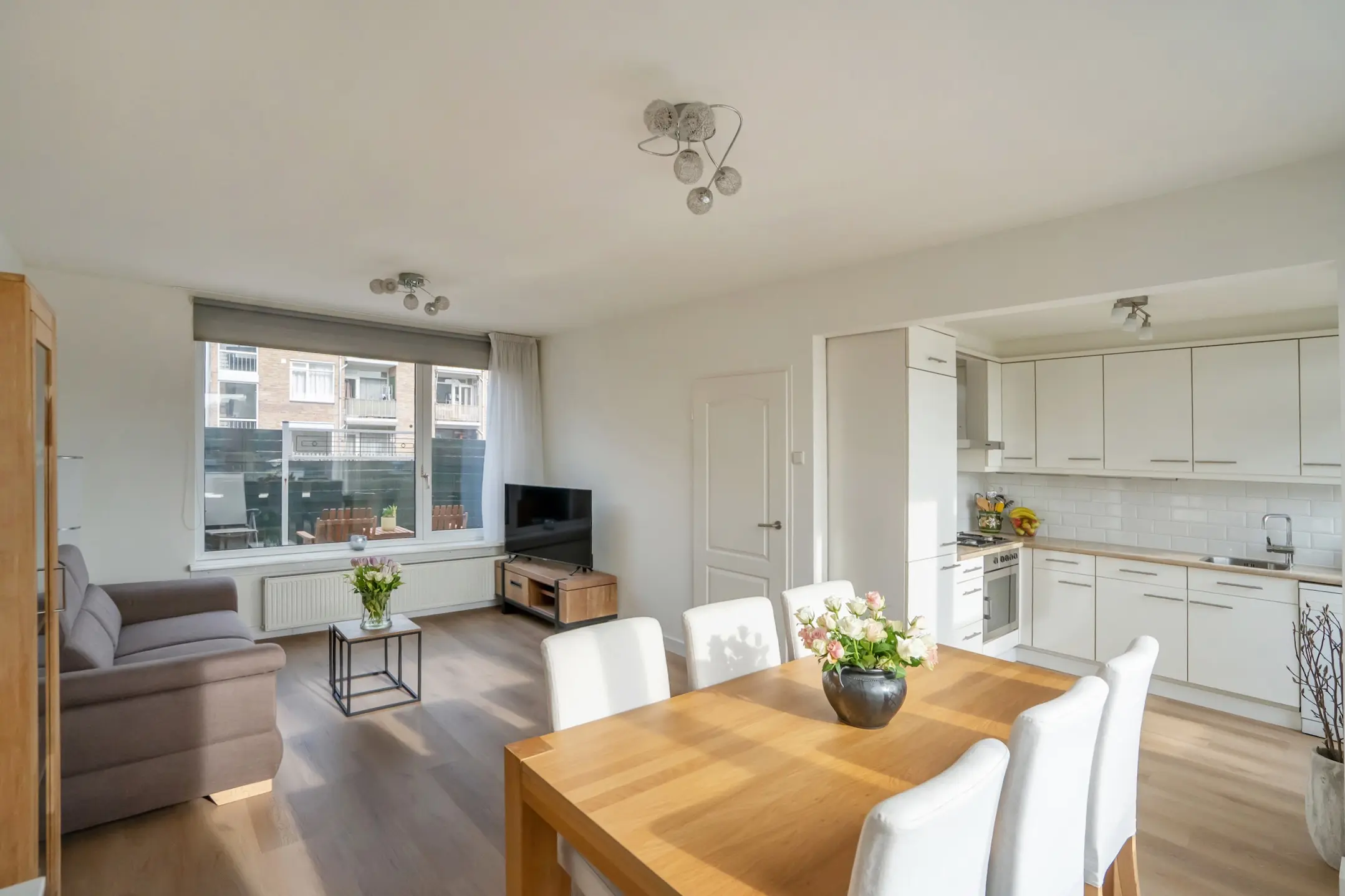 De sfeervolle woon- en eetkamer beschikt over grote raampartijen, waardoor er veel natuurlijk licht binnenvalt. Aan de voorzijde bevindt zich de moderne keuken in L-opstelling voorzien van diverse inbouwapparatuur w.o. een 4-pits gaskookplaat, afzuigkap, oven, koel- en vrieskast, vaatwasser en een spoelbak met mengkraan. Vanuit de keuken is er toegang tot het balkon aan de voorzijde.