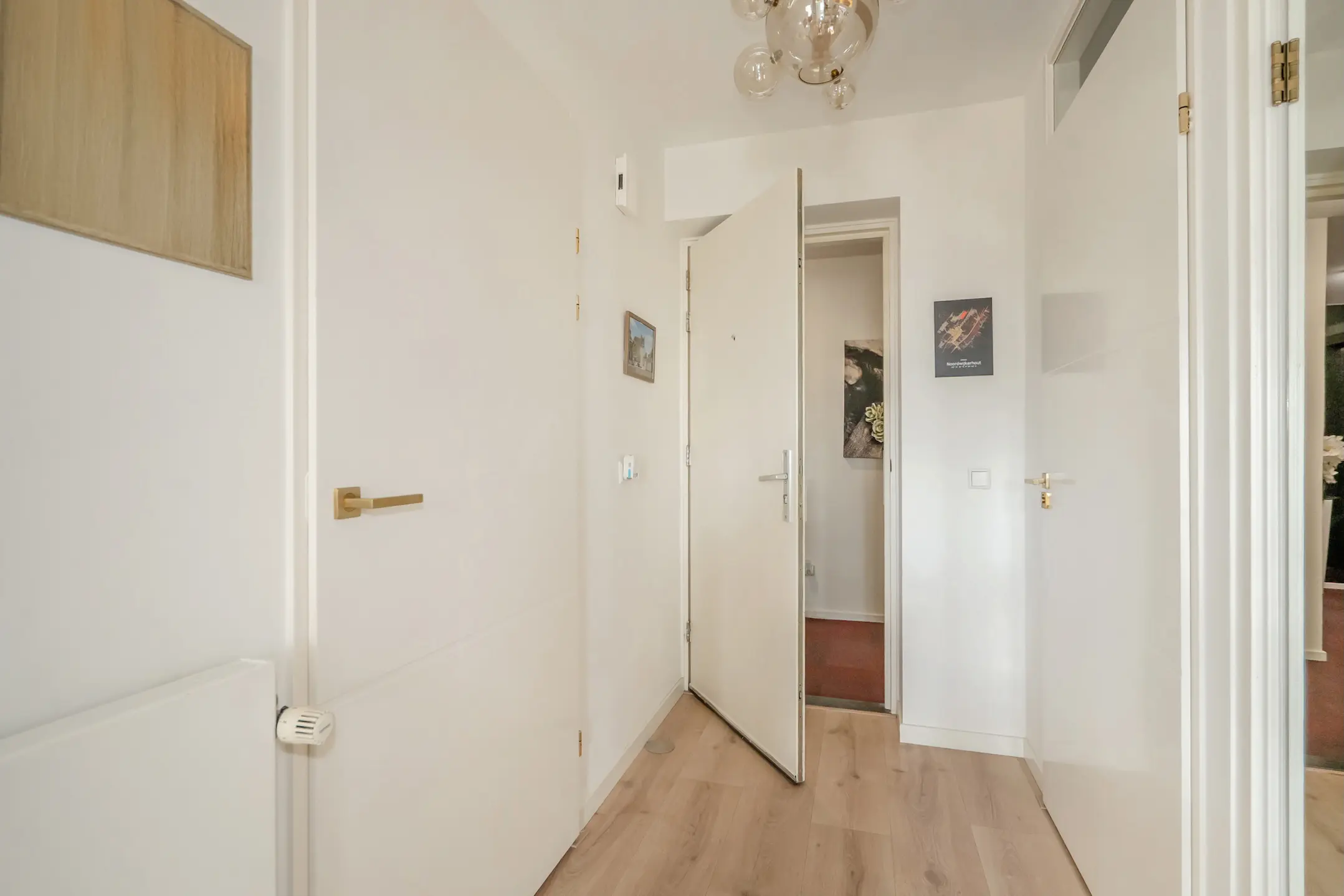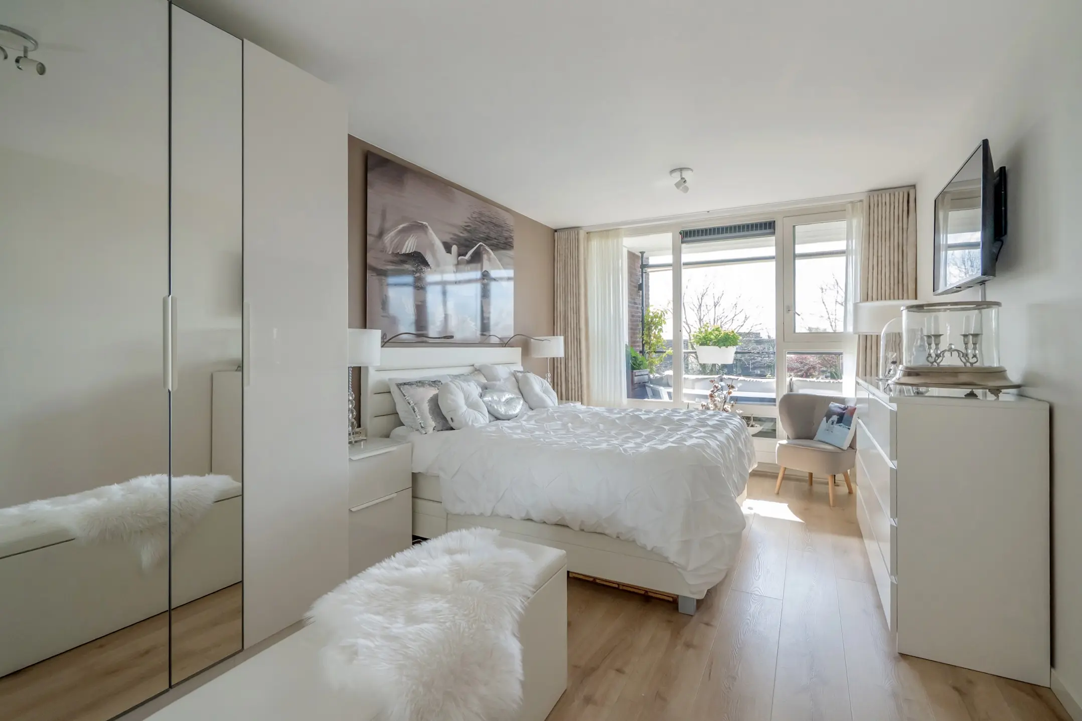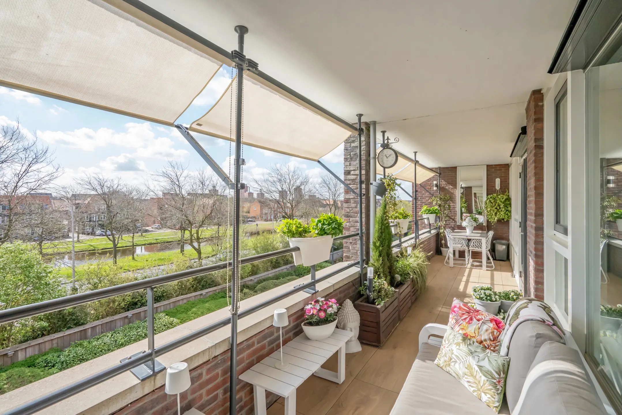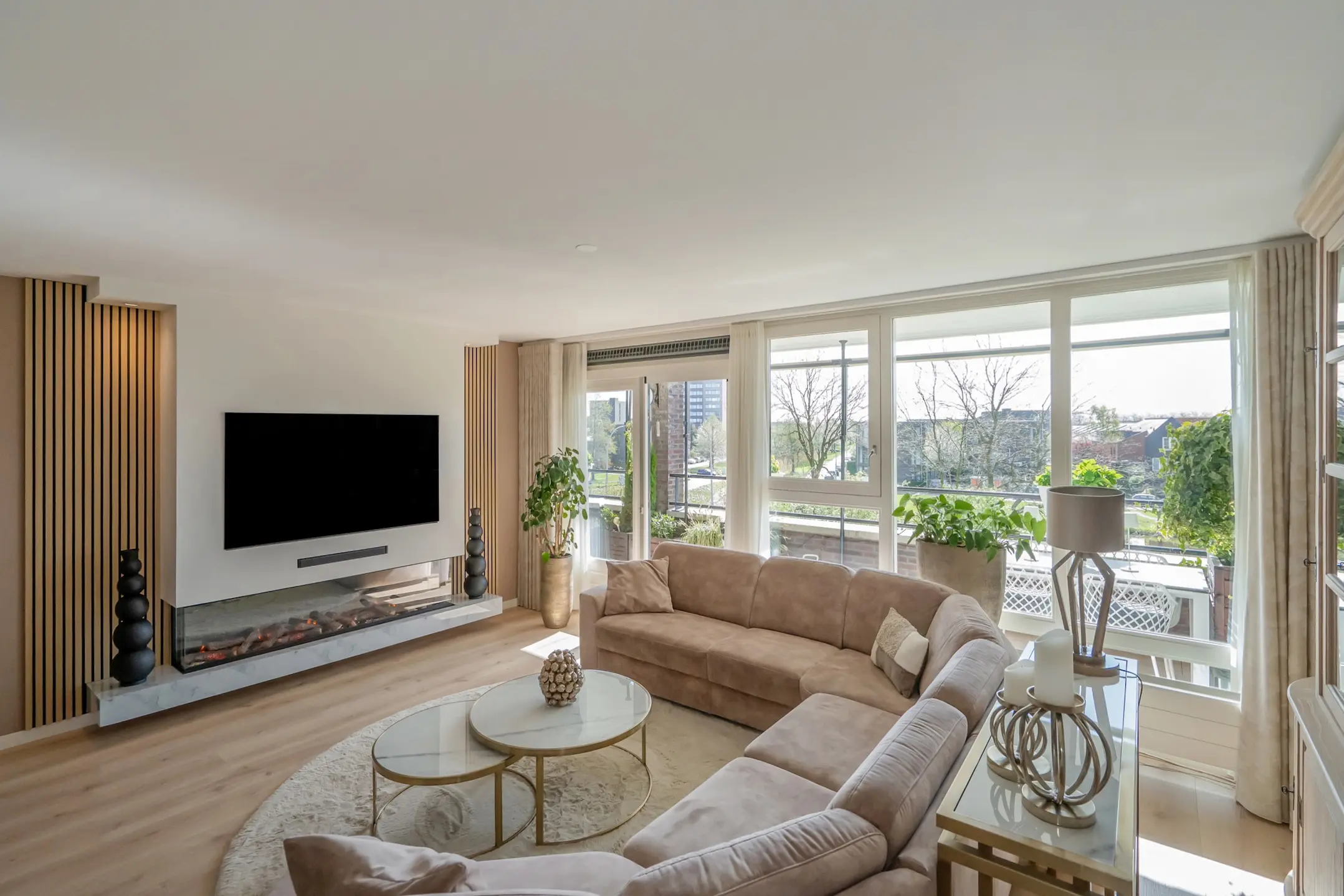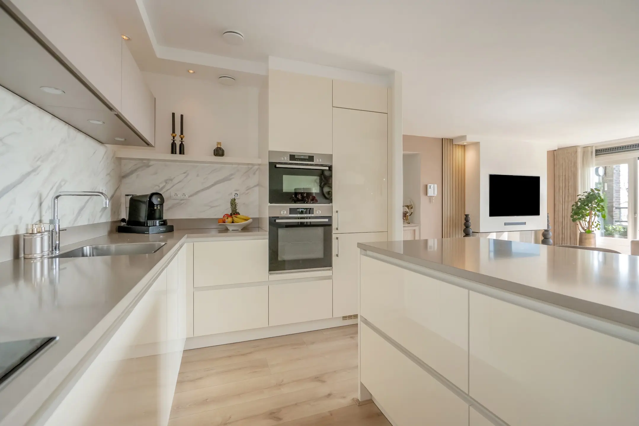 Entree van de woning, ruime hal met garderobekast en toegang tot een nette toiletruimte voorzien van een vrij hangend toilet en fontein. De hal leidt naar de lichte en royale woon-/eetkamer, welke zich kenmerkt door een moderne afwerking en een sfeervolle uitstraling. De stijlvolle, zwevende cinewall met geïntegreerde sierhaard vormt het elegante middelpunt van de ruimte. Via dubbele openslaande deuren bereikt u het zonnige balkon over de volle breedte voorzien van zonneschermen en onderhoudsvriendelijke keramische vloertegels. Een heerlijke plek om in alle rust van de zon te genieten. De open keuken is strak en functioneel ingericht en beschikt over een eiland met breakfast bar. Ideaal voor zowel dagelijks gebruik als gezellige momenten met gasten. De keuken is uitgerust met diverse inbouwapparatuur waaronder een inductiekookplaat, vlakscherm afzuigkap, oven, combi magnetron/oven, koel- en vrieskast, vaatwasser en een spoelbak met een Quooker mengkraan. Aan de achterzijde bevindt zich de ruime hoofdslaapkamer direct grenzend aan de verzorgde en royale badkamer. Deze is compleet uitgevoerd met een dubbele wastafelmeubel, inloopdouche met thermostaatkraan, tweede vrij hangend toilet, designradiator en een comfortabele vloerverwarming. Daarnaast beschikt de woning over een tweede kamer, ideaal als slaap-, werk- of logeerkamer.