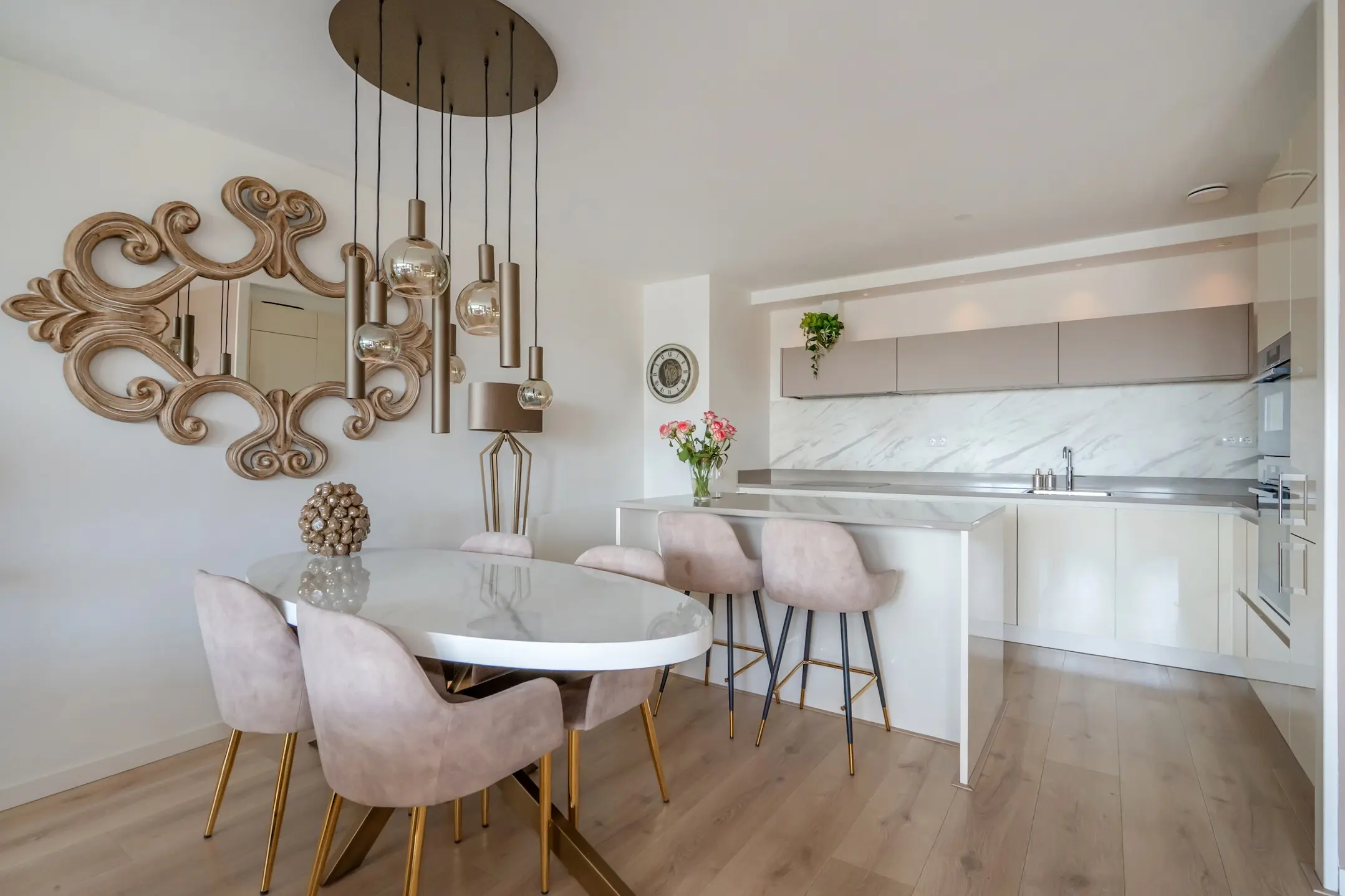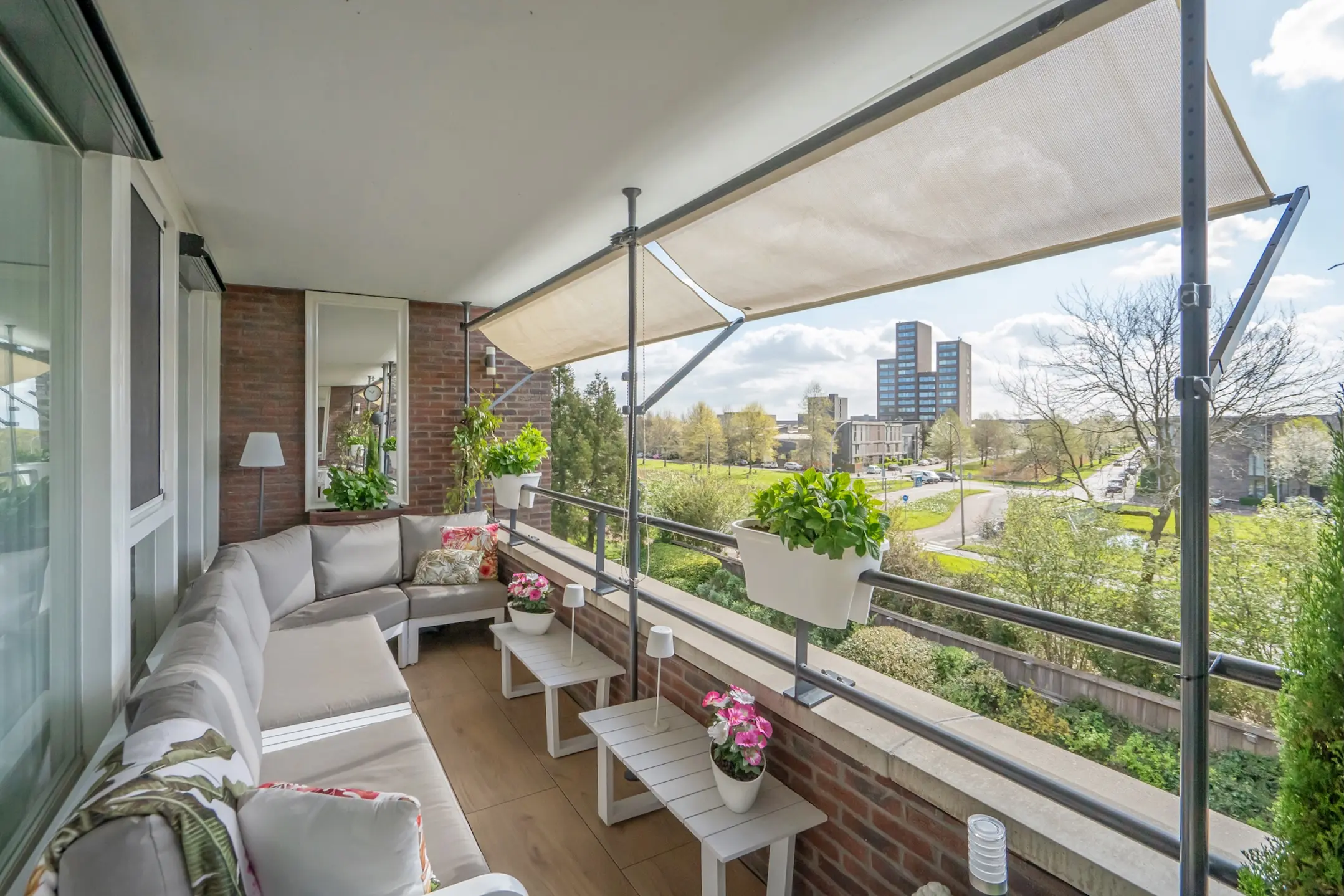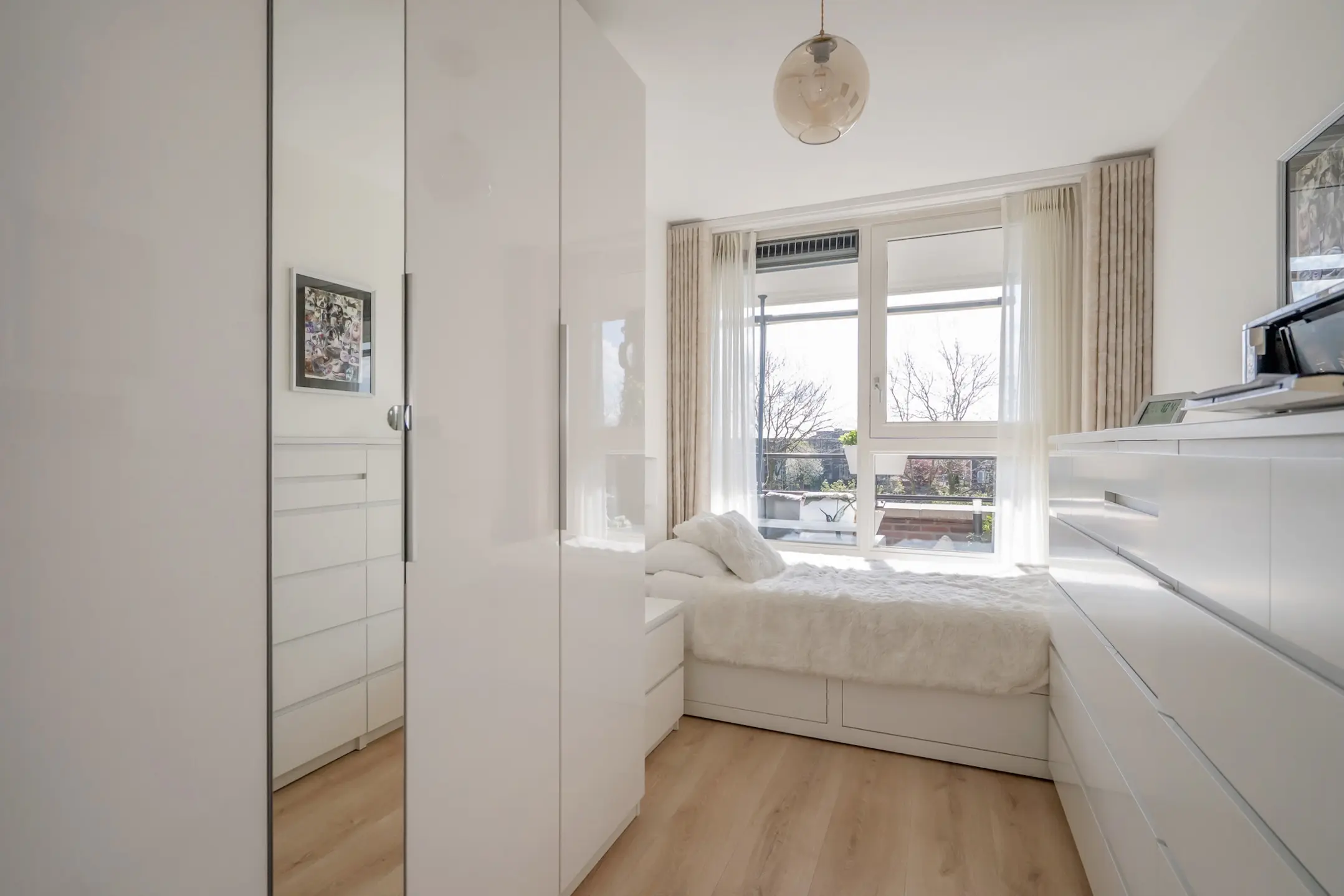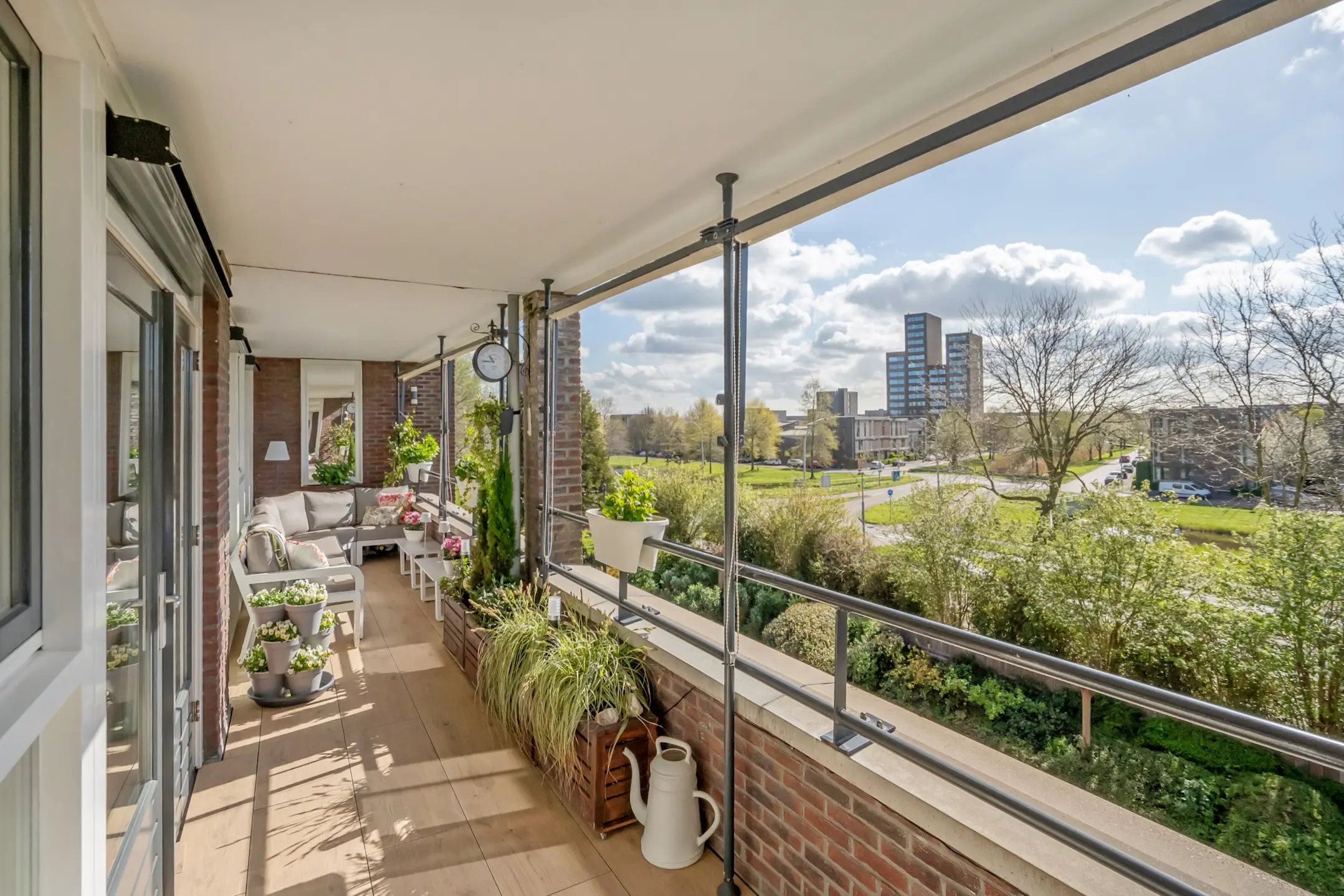 Entree van de woning, ruime hal met garderobekast en toegang tot een nette toiletruimte voorzien van een vrij hangend toilet en fontein. De hal leidt naar de lichte en royale woon-/eetkamer, welke zich kenmerkt door een moderne afwerking en een sfeervolle uitstraling. De stijlvolle, zwevende cinewall met geïntegreerde sierhaard vormt het elegante middelpunt van de ruimte. Via dubbele openslaande deuren bereikt u het zonnige balkon over de volle breedte voorzien van zonneschermen en onderhoudsvriendelijke keramische vloertegels. Een heerlijke plek om in alle rust van de zon te genieten. De open keuken is strak en functioneel ingericht en beschikt over een eiland met breakfast bar. Ideaal voor zowel dagelijks gebruik als gezellige momenten met gasten. De keuken is uitgerust met diverse inbouwapparatuur waaronder een inductiekookplaat, vlakscherm afzuigkap, oven, combi magnetron/oven, koel- en vrieskast, vaatwasser en een spoelbak met een Quooker mengkraan. Aan de achterzijde bevindt zich de ruime hoofdslaapkamer direct grenzend aan de verzorgde en royale badkamer. Deze is compleet uitgevoerd met een dubbele wastafelmeubel, inloopdouche met thermostaatkraan, tweede vrij hangend toilet, designradiator en een comfortabele vloerverwarming. Daarnaast beschikt de woning over een tweede kamer, ideaal als slaap-, werk- of logeerkamer.