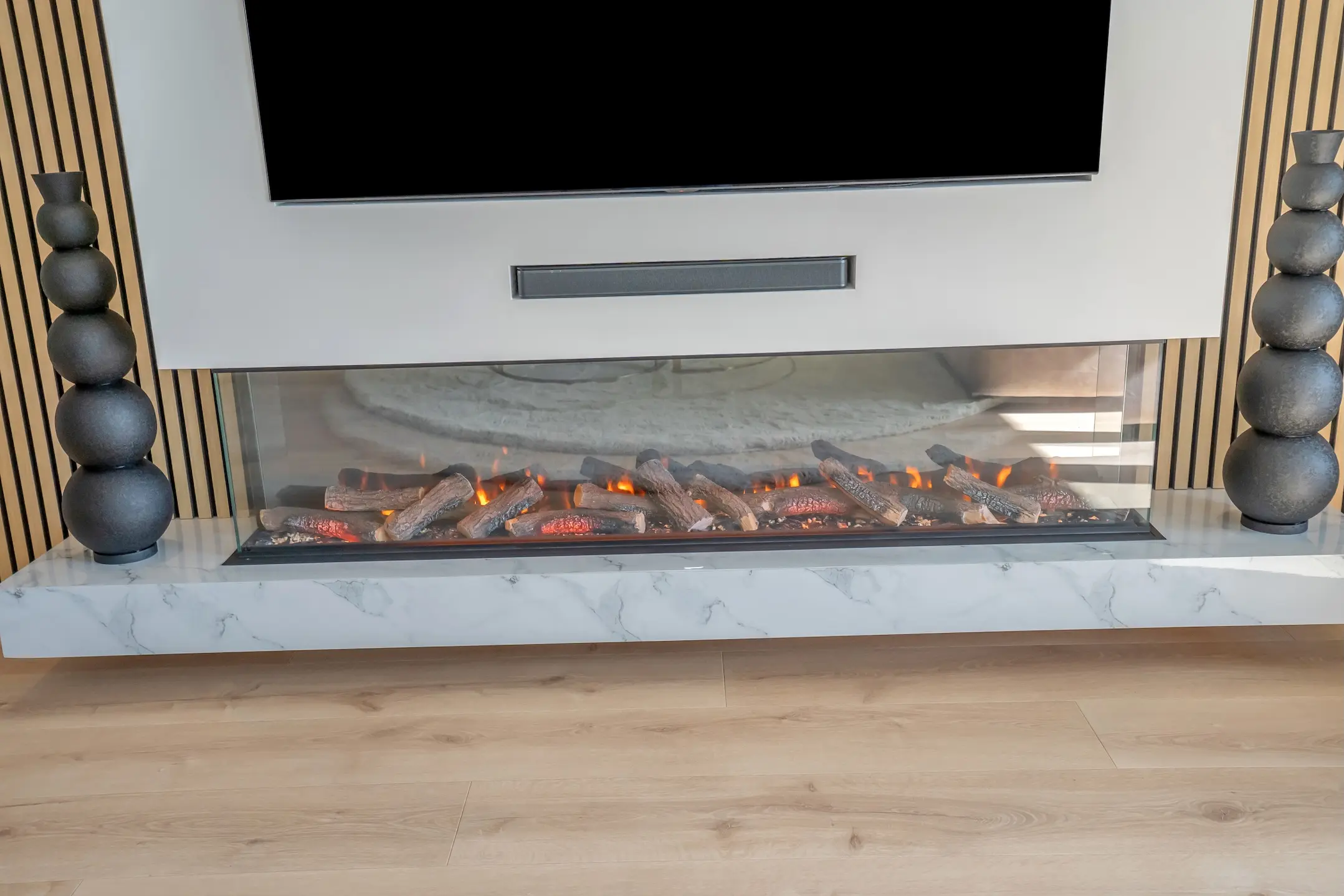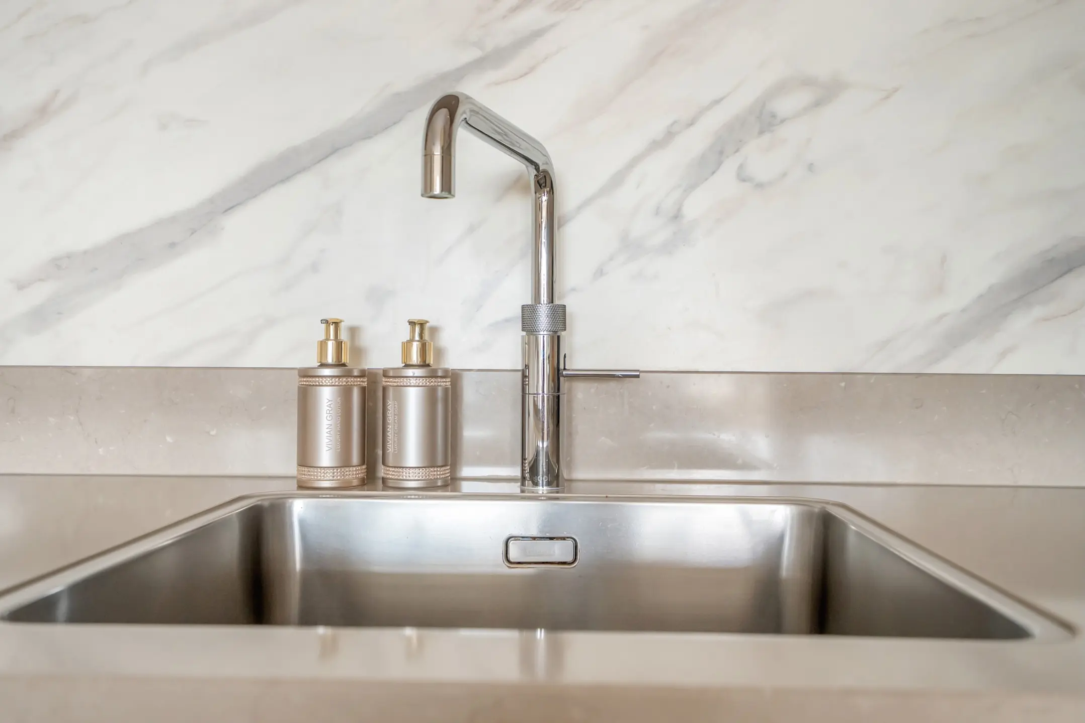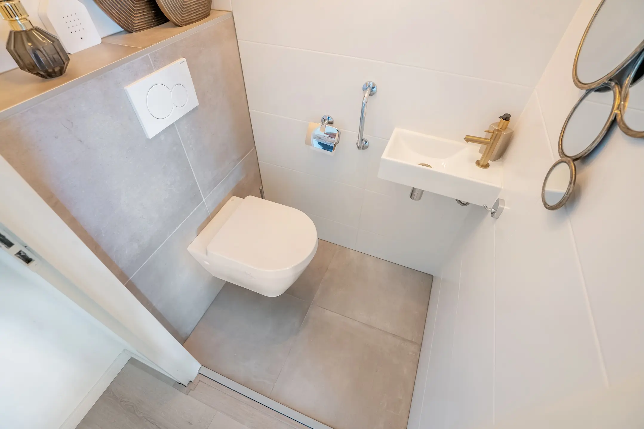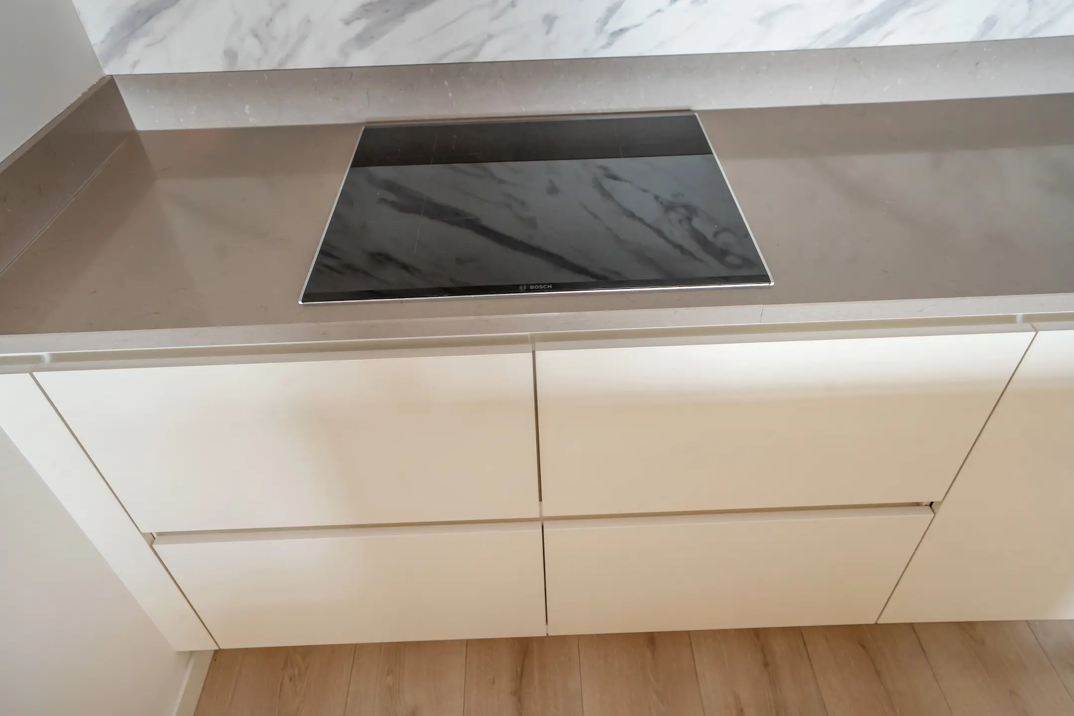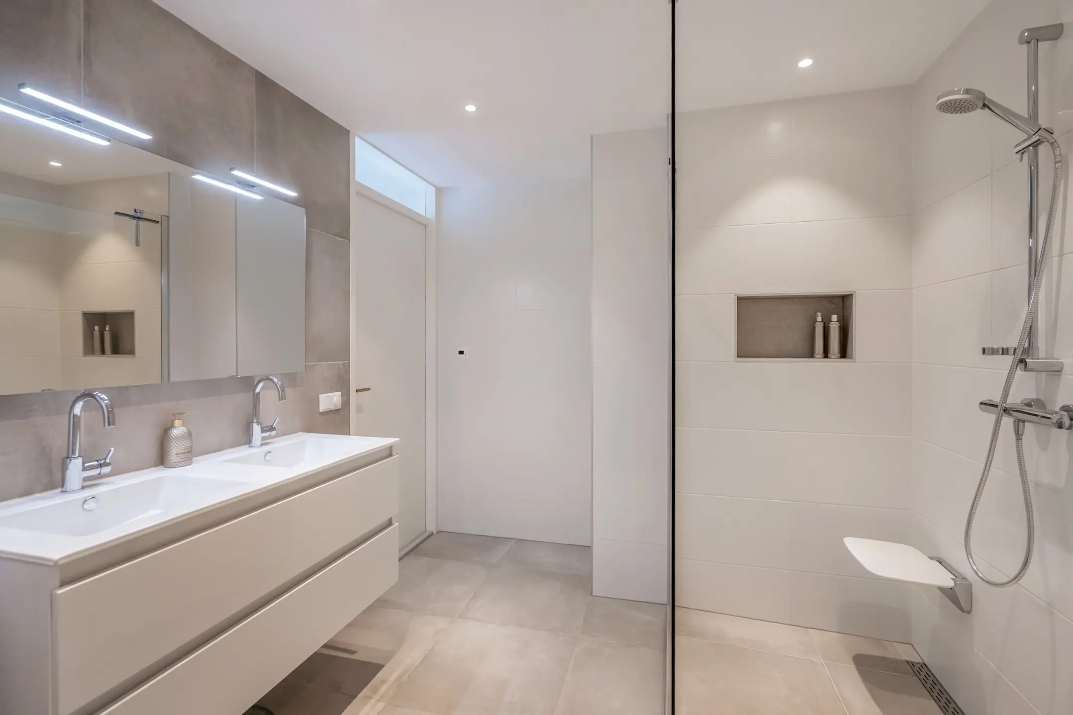 Entree van de woning, ruime hal met garderobekast en toegang tot een nette toiletruimte voorzien van een vrij hangend toilet en fontein. De hal leidt naar de lichte en royale woon-/eetkamer, welke zich kenmerkt door een moderne afwerking en een sfeervolle uitstraling. De stijlvolle, zwevende cinewall met geïntegreerde sierhaard vormt het elegante middelpunt van de ruimte. Via dubbele openslaande deuren bereikt u het zonnige balkon over de volle breedte voorzien van zonneschermen en onderhoudsvriendelijke keramische vloertegels. Een heerlijke plek om in alle rust van de zon te genieten. De open keuken is strak en functioneel ingericht en beschikt over een eiland met breakfast bar. Ideaal voor zowel dagelijks gebruik als gezellige momenten met gasten. De keuken is uitgerust met diverse inbouwapparatuur waaronder een inductiekookplaat, vlakscherm afzuigkap, oven, combi magnetron/oven, koel- en vrieskast, vaatwasser en een spoelbak met een Quooker mengkraan. Aan de achterzijde bevindt zich de ruime hoofdslaapkamer direct grenzend aan de verzorgde en royale badkamer. Deze is compleet uitgevoerd met een dubbele wastafelmeubel, inloopdouche met thermostaatkraan, tweede vrij hangend toilet, designradiator en een comfortabele vloerverwarming. Daarnaast beschikt de woning over een tweede kamer, ideaal als slaap-, werk- of logeerkamer.